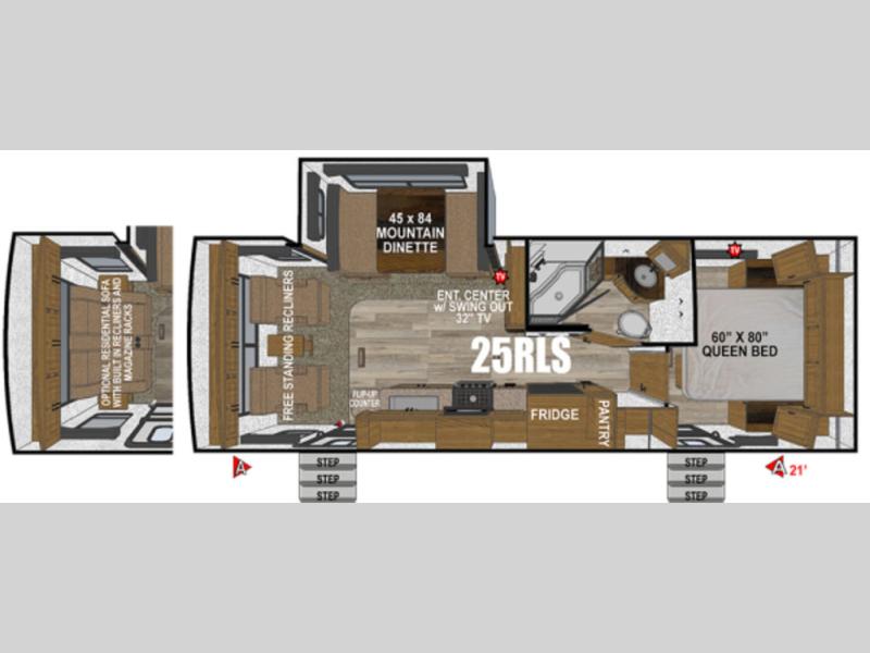 Single Slide Wrangler Bunkhouse Travel Trailer w/Rear Corner Bath Including Tub/Shower, Lav. Med.Cabinet, Small Wardrobe & Toilet, Rear Corner Bunk Beds, Wardrobe, Refrigerator, 3 Burner Range, Double Kitchen Sink, Flip Sofa & Booth Dinette Slideout, Ent. Center, Front Queen Bed w/Nightstand/Wardrobe, Front Pass-Thru Storage and More!