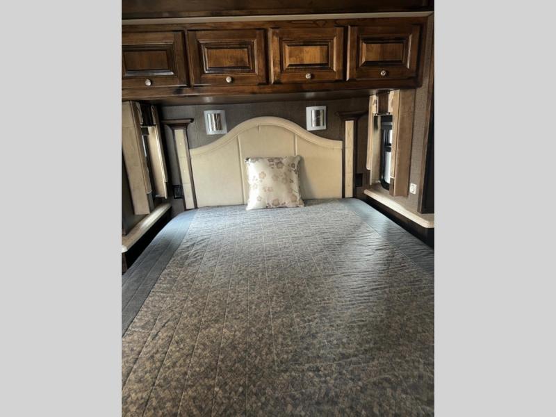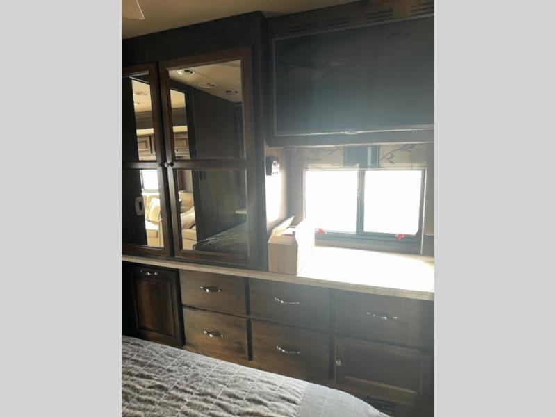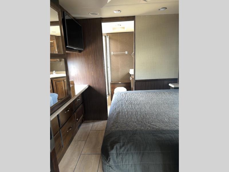 The private bedroom includes a queen bed slide with nightstands at each side and overhead cabinets. The wall opposite the bed includes a wardrobe with drawers below as well as a vanity with a TV and overhead cabinets above.