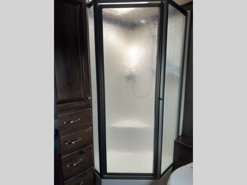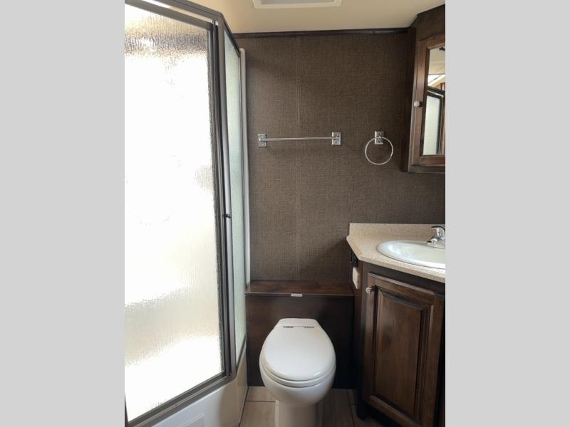 The rear bathroom provides lots of overhead cabinets, a shower, an optional tub, toilet, large corner vanity and sink as well as the option for under counter combo washer/dryer, and more!