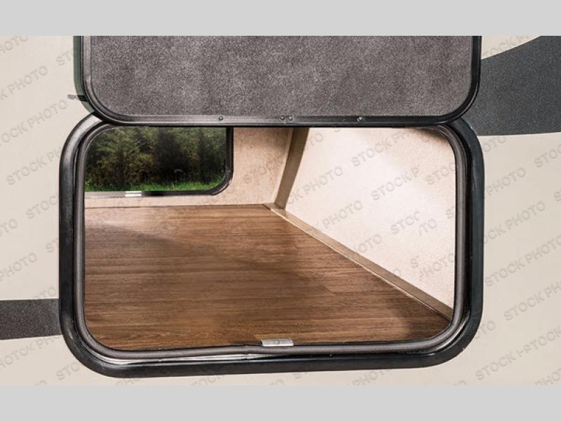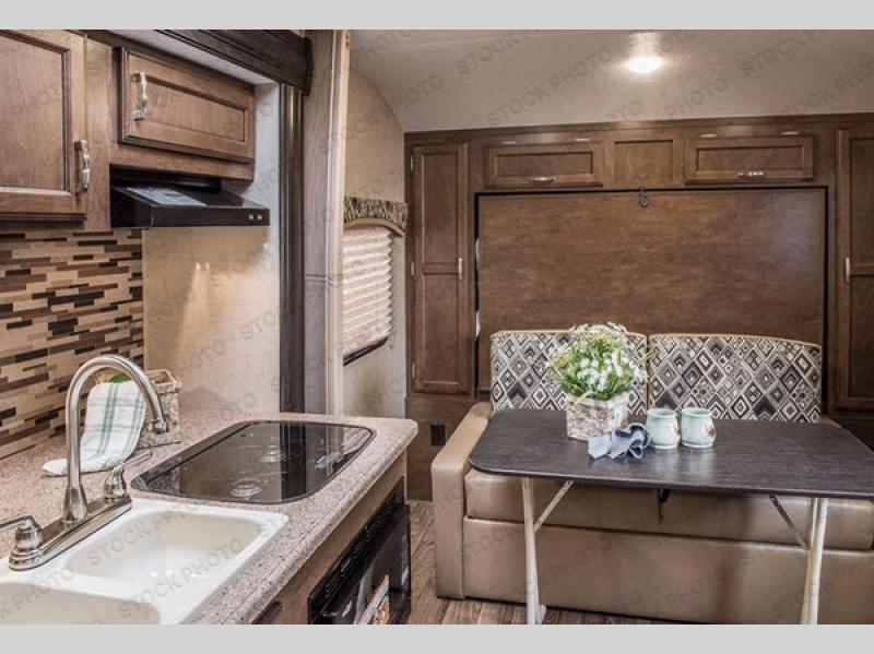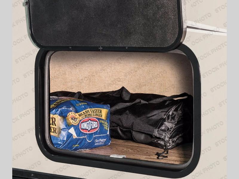 There is plenty of storage in the overhead cabinets above the Murphy bed and kitchen slide. Enjoy easy loading and unloading of your outside gear in the exterior pass through storage near the front, or the pack-n-play door under the bunks along the curb side.