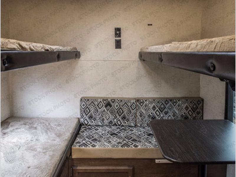 In the rear you will find a private bunkhouse including a 32" X 73" top bunk over a 28" X 73" flip-up bottom bunk on your left, and a 28" X 73" flip up bunk above a 30" dinette on the opposite side, plus a bench seat in between. An accordion door allows for privacy in this space.