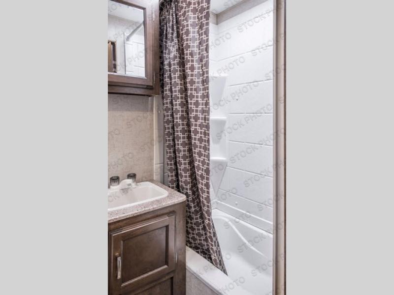 Along the curb side you will find an entertainment center. Next there is a private bath offering a toilet, sink with medicine cabinet, and a tub.