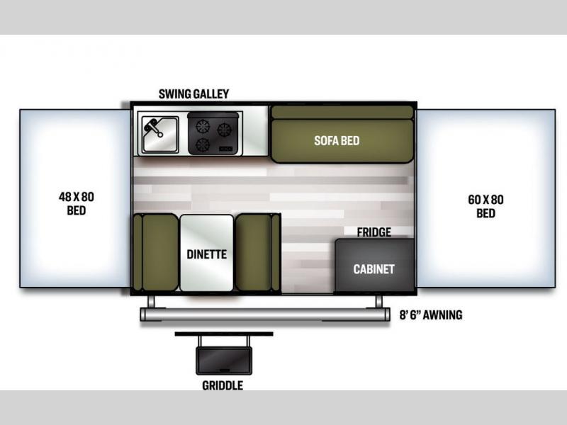 If you are serious about your love for the great outdoors, this Flagstaff SE folding pop-up camper will allow you to get out there and explore! You can enjoy a night of camping out underneath the stars as you sit around the campfire, roast some marshmallows, or use the exterior griddle to add to your snacks. Keep your 8' 6" awning folded out to protect you from any sporadic rain that may show up while you're outside breathing in the fresh air. When you do come inside, you'll be able to continue the stargazing from one of the two tent beds as you drift off to sleep, and in the morning, you won't have to start a fire in order to prepare breakfast. Just use the three-burner range for your coffee percolator and your pan of flapjacks.