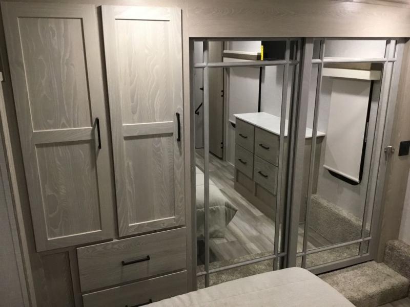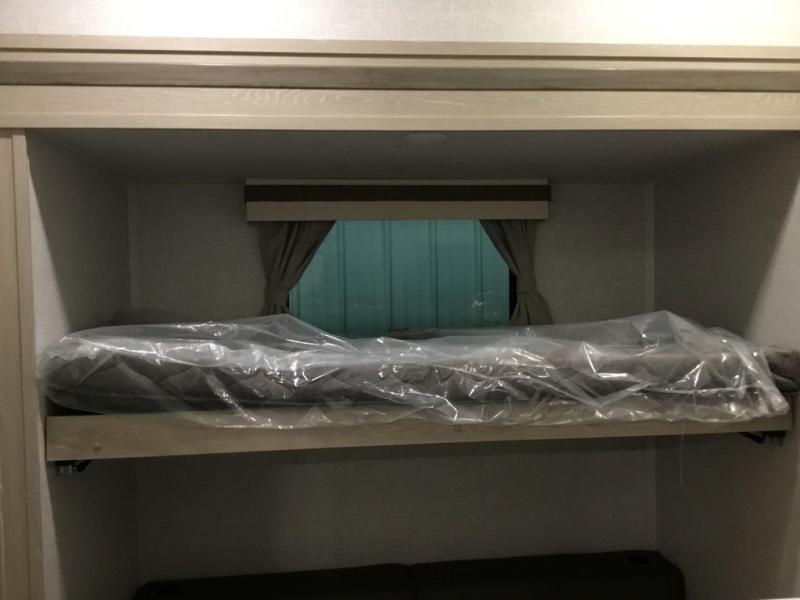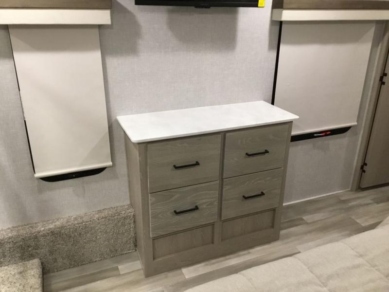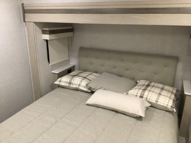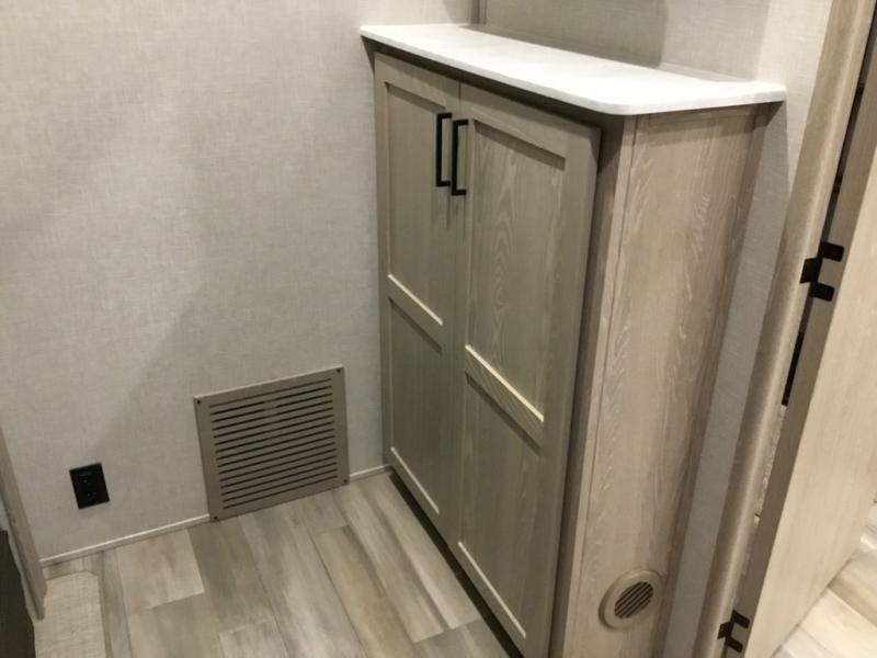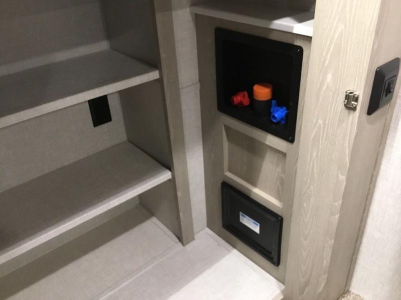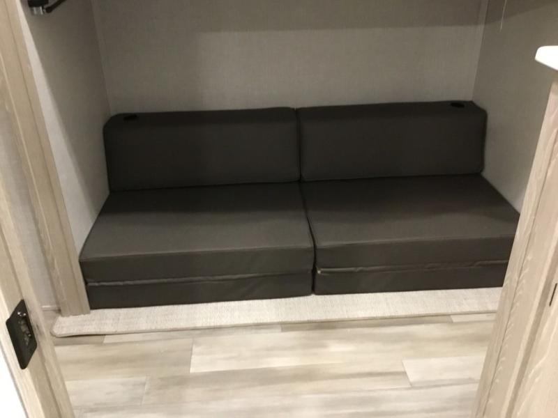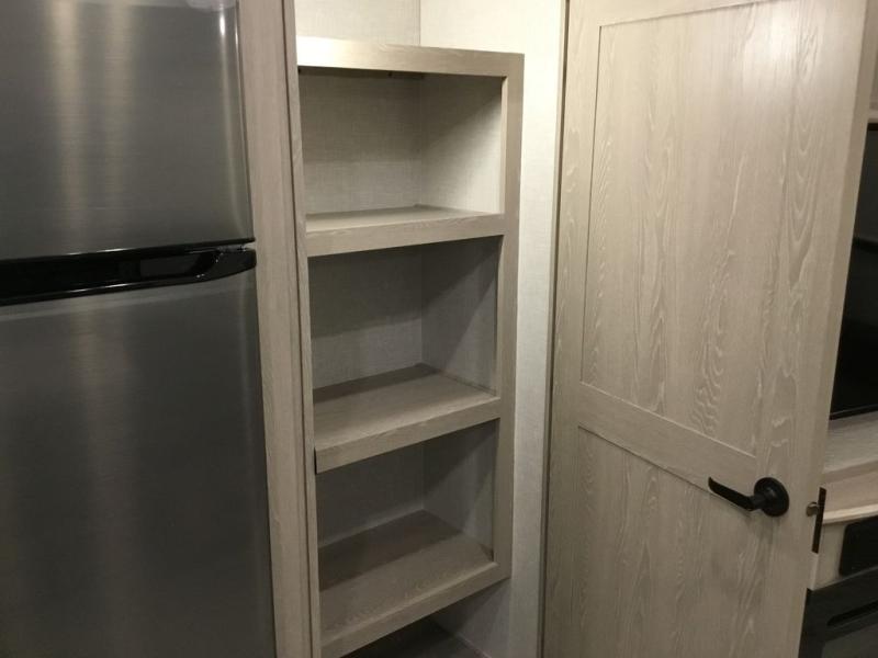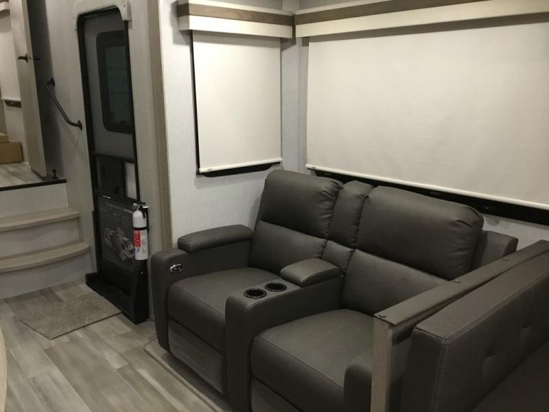The middle bunkhouse offers a place to work, rest and sleep with a counter space, sofa, and flip-up bed, and there is a wardrobe for clothing. The large bedroom up front provides a queen bed slide or you can choose the king bed option, a dresser with a window above for great views, and a front wardrobe, shirt closet and a place prepped for a washer/dryer option. The full bathroom includes a shower with a seat and linen storage, and is located between the two rooms. You can watch the LED TV with fireplace below from the slide out which includes a king U-shaped dinette and theater seating. The cook will enjoy their own space in the rear kitchen with full amenities including a large pantry, an 11 cu. ft. refrigerator, and great views out of the slide out windows.