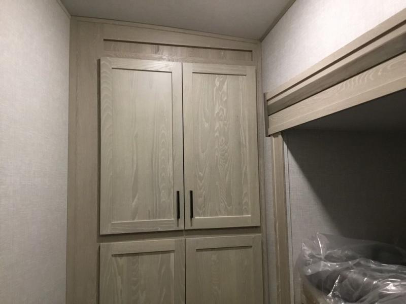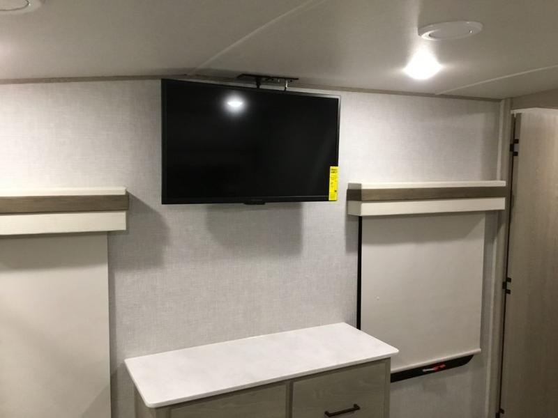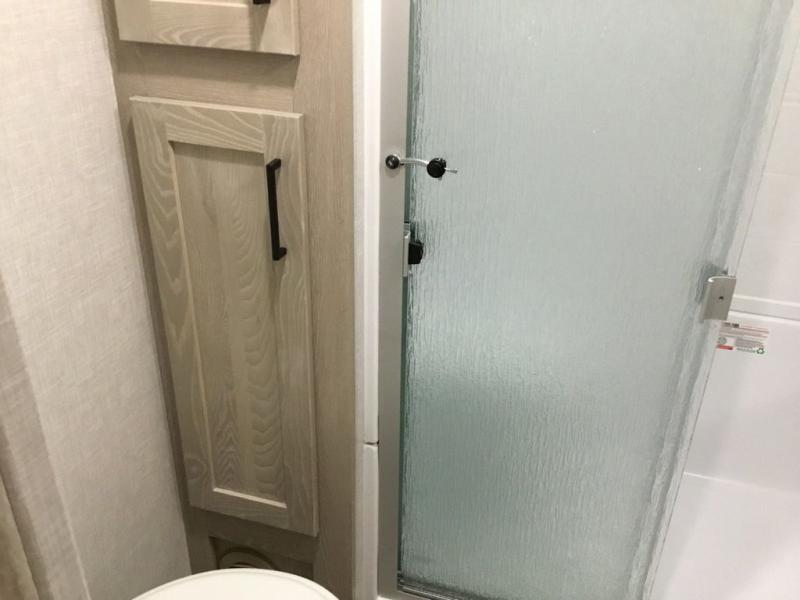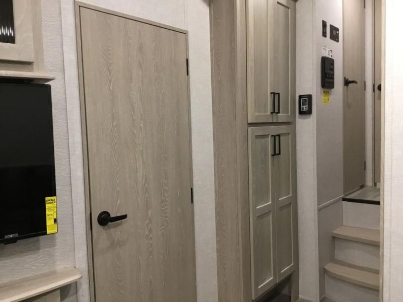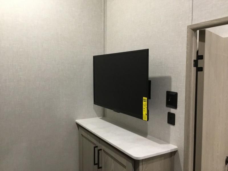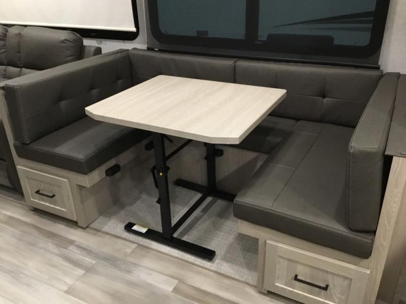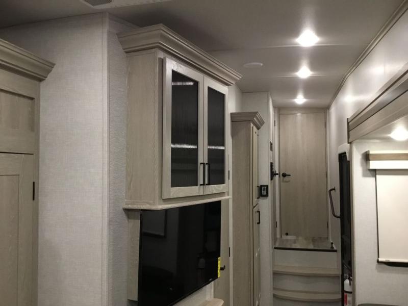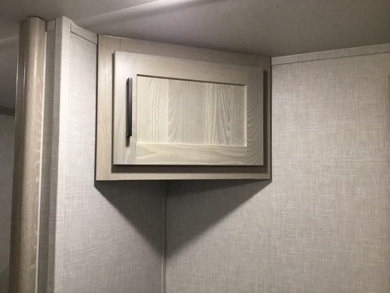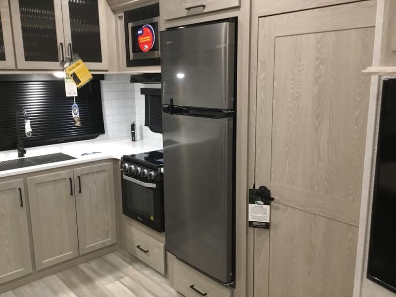 The middle bunkhouse offers a place to work, rest and sleep with a counter space, sofa, and flip-up bed, and there is a wardrobe for clothing. The large bedroom up front provides a queen bed slide or you can choose the king bed option, a dresser with a window above for great views, and a front wardrobe, shirt closet and a place prepped for a washer/dryer option. The full bathroom includes a shower with a seat and linen storage, and is located between the two rooms. You can watch the LED TV with fireplace below from the slide out which includes a king U-shaped dinette and theater seating. The cook will enjoy their own space in the rear kitchen with full amenities including a large pantry, an 11 cu. ft. refrigerator, and great views out of the slide out windows.