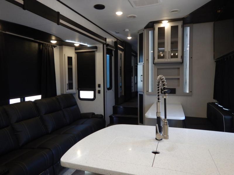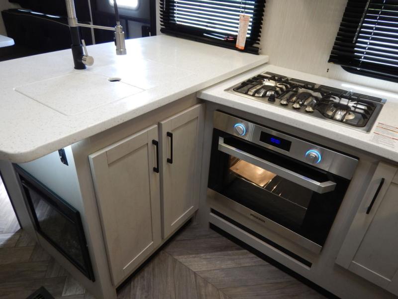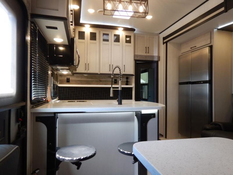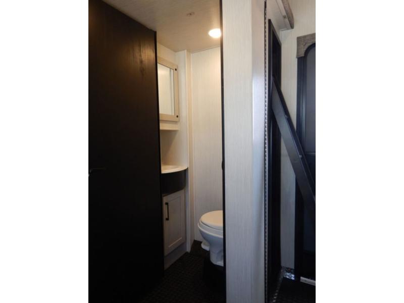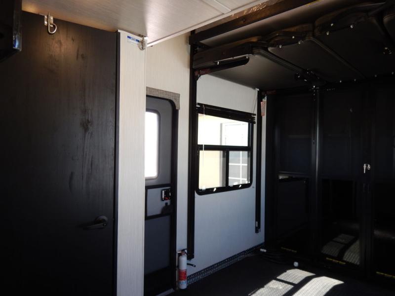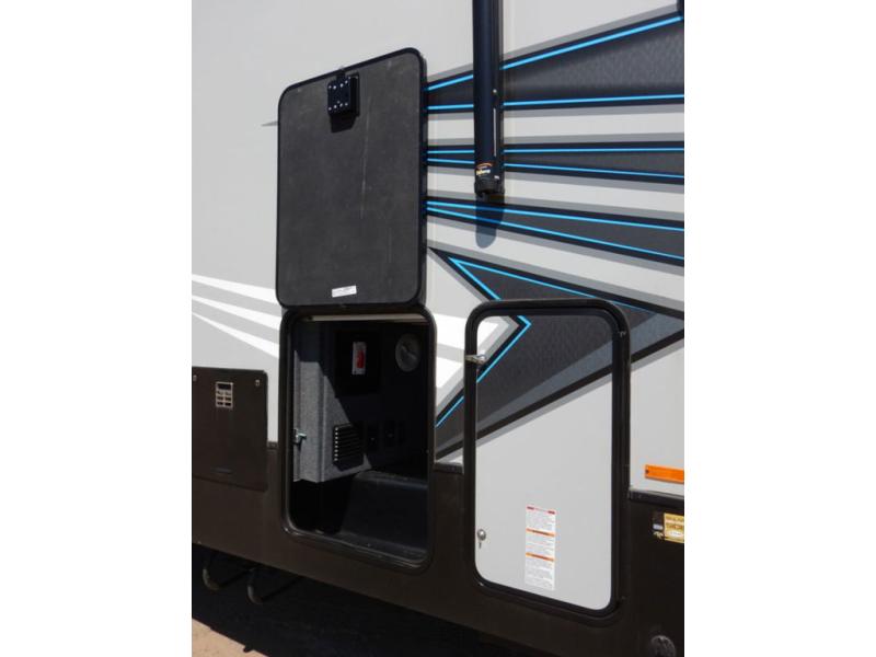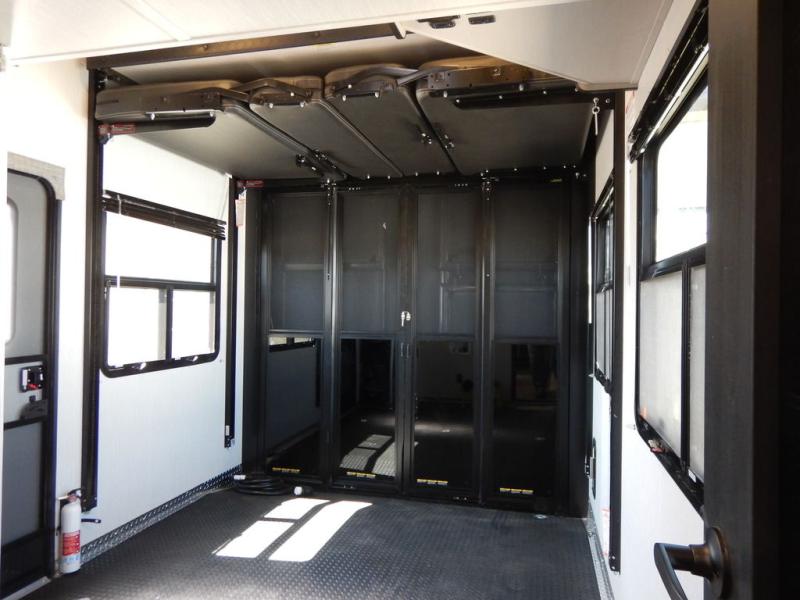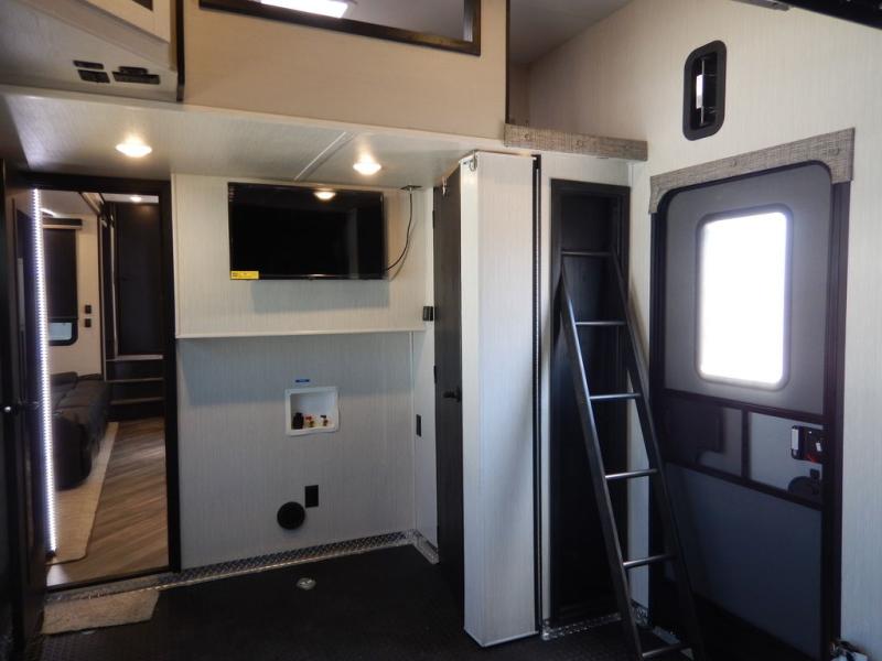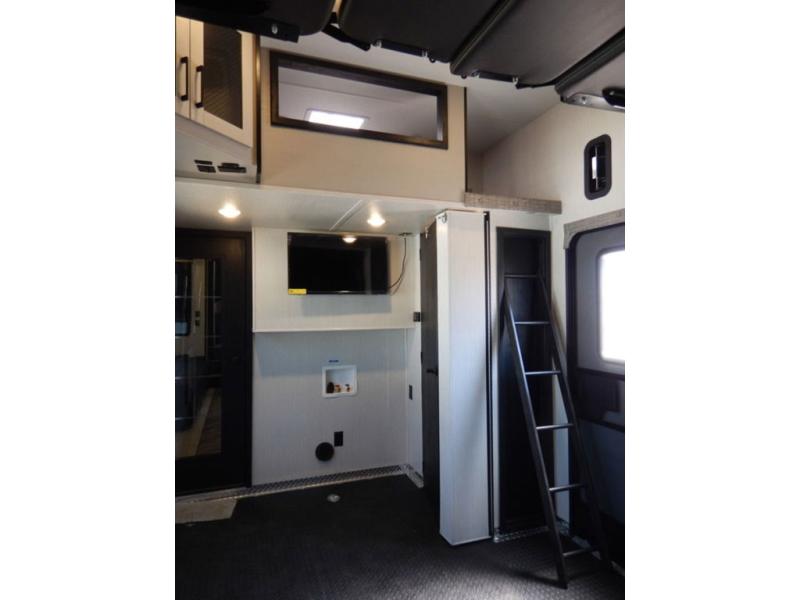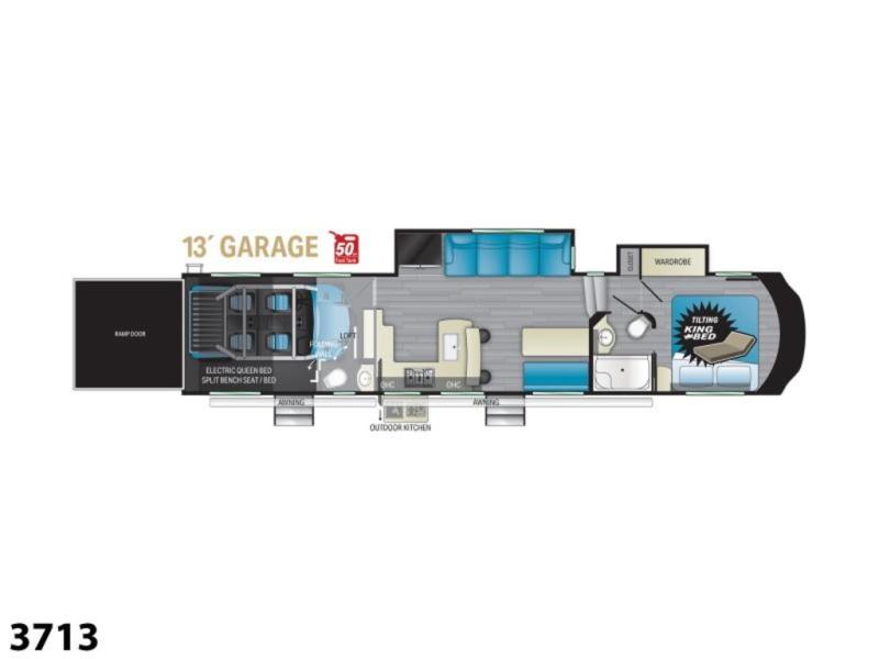 Pack your bags and load up your toys into this toy hauler for a fun family vacation! Luxury abounds throughout the inside and the outside with an outdoor kitchen protected by one of the two awnings so you can grill juicy burgers and breathe in some fresh air. One of the dual entry doors leads directly into the kitchen/living area where there is a one sided booth dinette, two bar stools at a bar top so you can socialize with the chef as they cook dinner with the three burner cooktop, and a high quality over stuffed four person sofa next to the 18 cu. ft. refrigerator. After a fun day of trail riding, freshen up in the dual entry bathroom then head directly into the front master suite to get a change of clothes from the wardrobe/closet slide. The 13' garage has lots to offer with an electric queen bed above split bench seating, a half bathroom, and a loft!