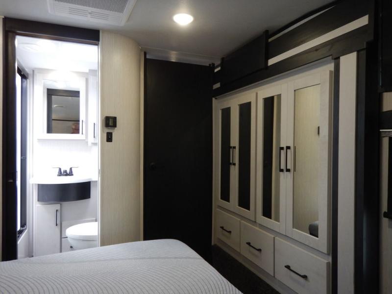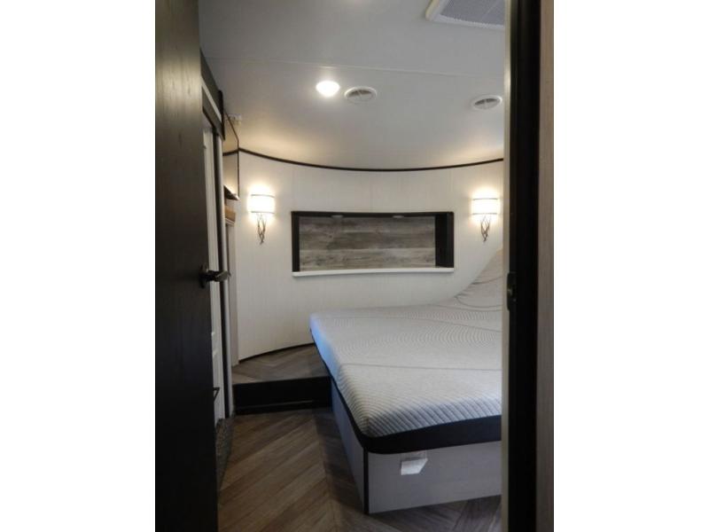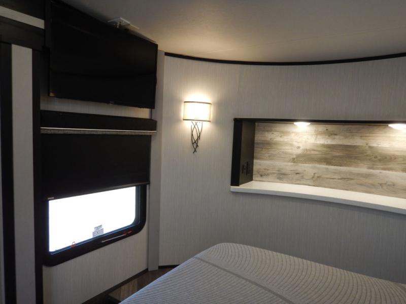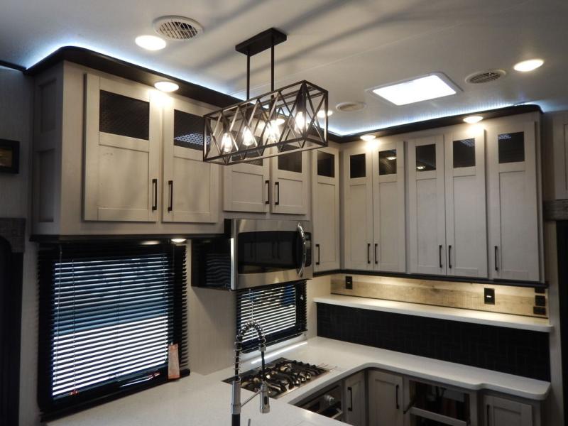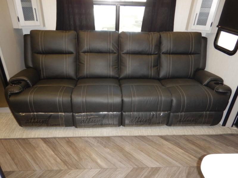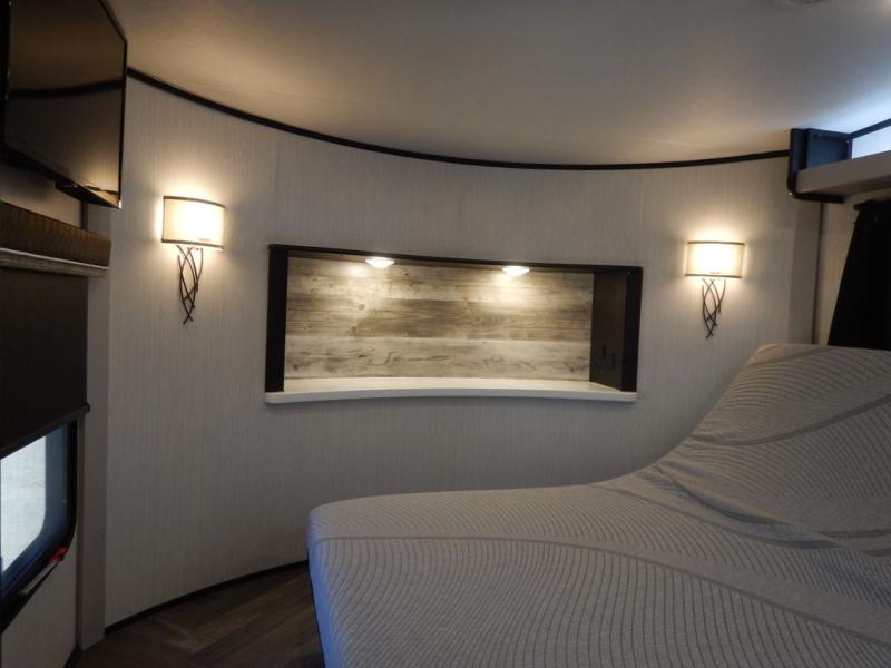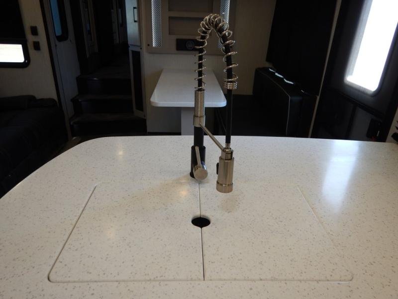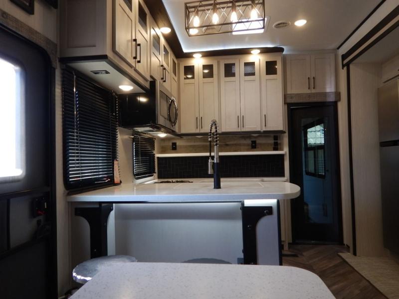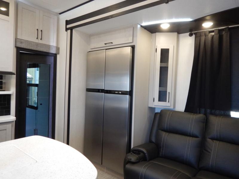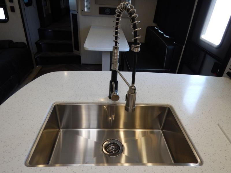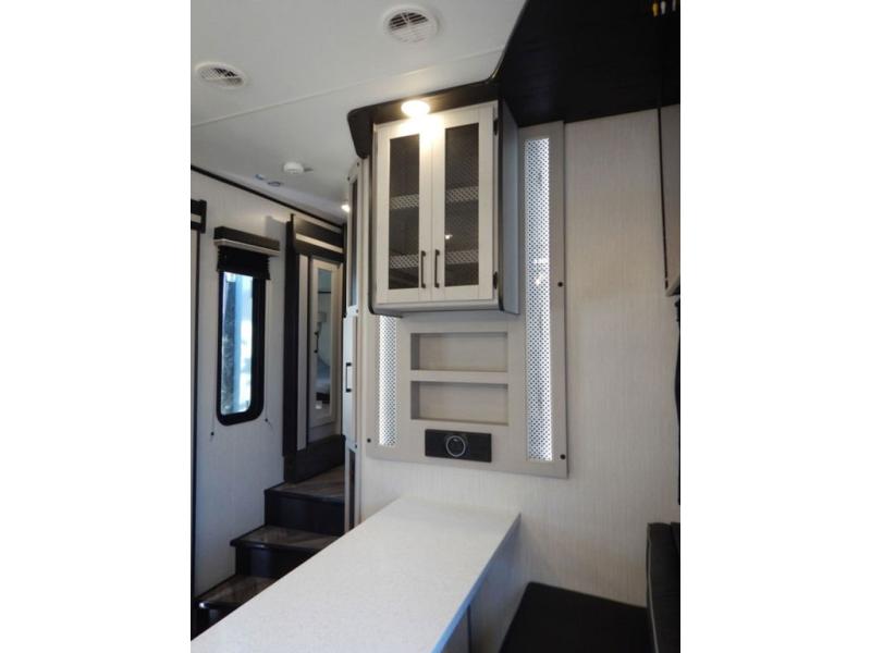 Pack your bags and load up your toys into this toy hauler for a fun family vacation! Luxury abounds throughout the inside and the outside with an outdoor kitchen protected by one of the two awnings so you can grill juicy burgers and breathe in some fresh air. One of the dual entry doors leads directly into the kitchen/living area where there is a one sided booth dinette, two bar stools at a bar top so you can socialize with the chef as they cook dinner with the three burner cooktop, and a high quality over stuffed four person sofa next to the 18 cu. ft. refrigerator. After a fun day of trail riding, freshen up in the dual entry bathroom then head directly into the front master suite to get a change of clothes from the wardrobe/closet slide. The 13' garage has lots to offer with an electric queen bed above split bench seating, a half bathroom, and a loft!