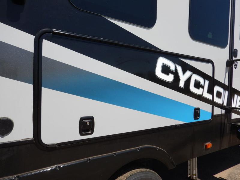 Satisfy your wanderlust with a Heartland Cyclone fifth wheel toy hauler! You won't have to sacrifice any luxury either with indulgent features like the king bedroom suite with a "swift space" work station that pulls out from the dresser, a Stor-Mor three-sided access to the basement with 30% more storage capacity, and Step Caddy folding patio step for better stability as you enter or exit the patio. The industry first Grill and Go 25" residential pull out 3 burner griddle combo comes on models with an exterior kitchen for an easier cooking experience. Full height shaker cabinetry provides 25% more storage space so you can bring more camping necessities with you. If you like to dry camp longer then you will appreciate the industry's largest 150 gallons fresh water tanks. Come find the perfect model for you today!