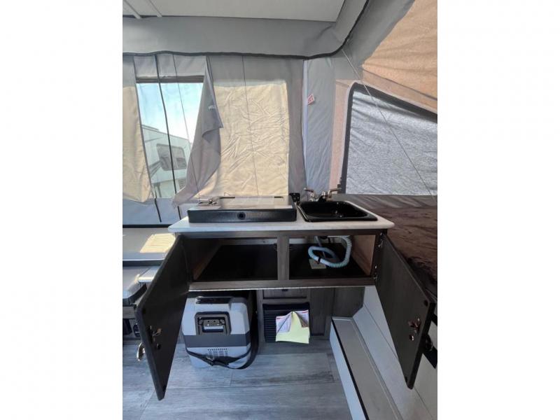 You will find comfort features all throughout this folding pop-up camper! The queen tent end insulated beds supported by Glide-N-Lock cables offer a comfortable night's rest, and you can even transform the two opposing 70" gaucho sofas into an extra sleeping space. Enjoy home cooked meals with the two burner high output range, cold beverages with the 120 watt/12V refrigerator/freezer cooler, and an easy clean up with a deep acrylic sink bowl. The new exterior style storage and shroud lets you bring more items to the campsite and the exterior awning will protect you rain or shine!