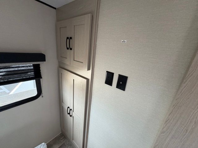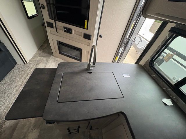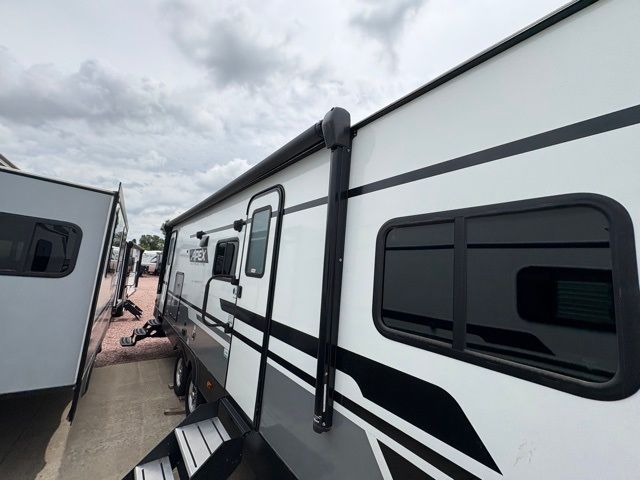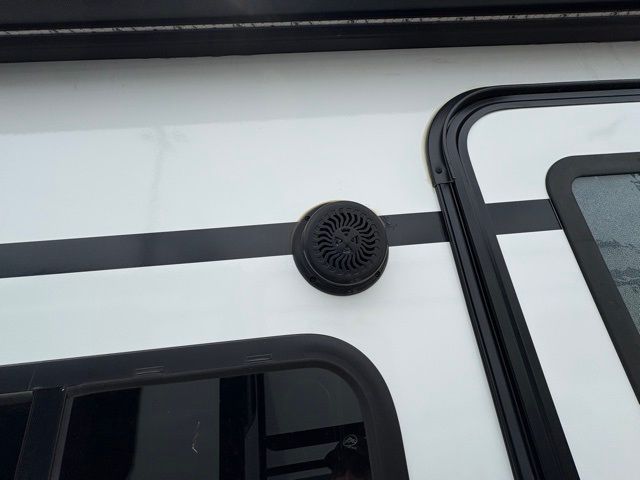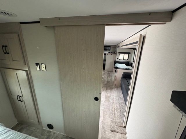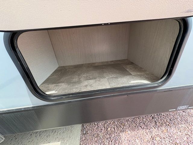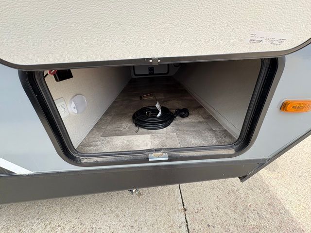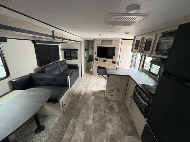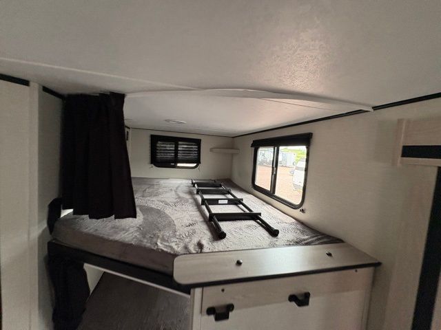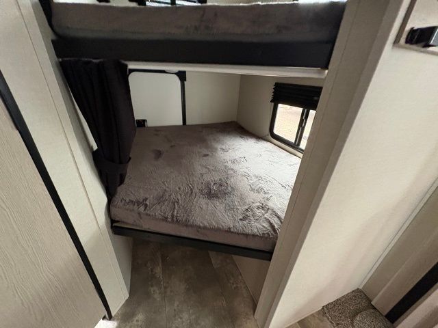 Pack your bags and head to your local state park for fun in this dual entry travel trailer. The kids will love the double-size bunks that include a ladder, and the full bath with its own exterior entry door is close by for nighttime use. The main living area will be a favorite hangout spot with its large slide out, U-shaped dinette, sofa, and 40" LED TV! The chef can cook at-home meals on the three burner cooktop, plus there is an exterior camp kitchen for quick meals outdoors. And check out the front private bedroom with a queen bed, dual wardrobes, and a linen closet for clean towels!
