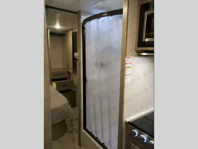 Sneak off for a getaway in this motorhome that has everything you might need! The private rear bedroom has a 60” x 80” queen bed with storage on either side and plenty of room to walk around. The bathroom is split, with the shower on one side and the sink and toilet behind a separate door so sharing is a breeze. Relax up front on either the sofa or the roomy 42” x 71” dinette, with cabinets above for all your supplies. A bunk over the cab provides yet another sleeping area that will be popular with little ones. Time to get out there in the Freelander!