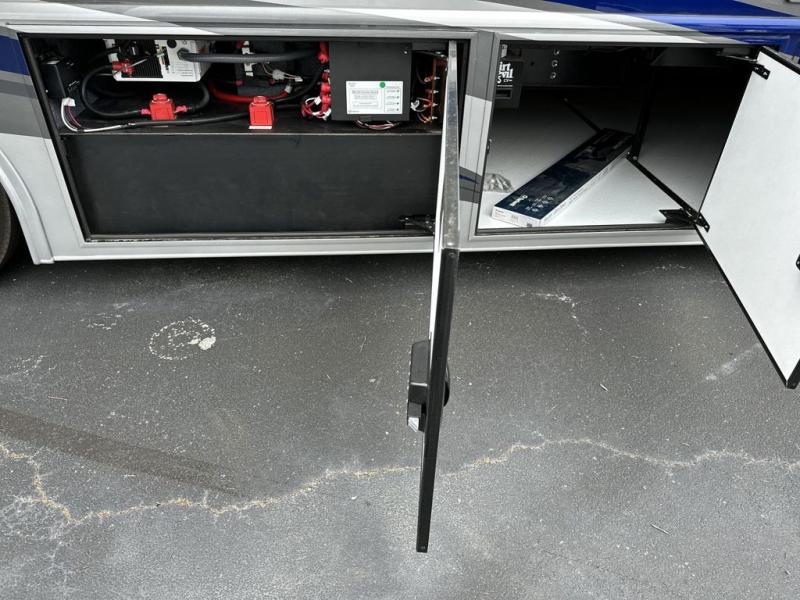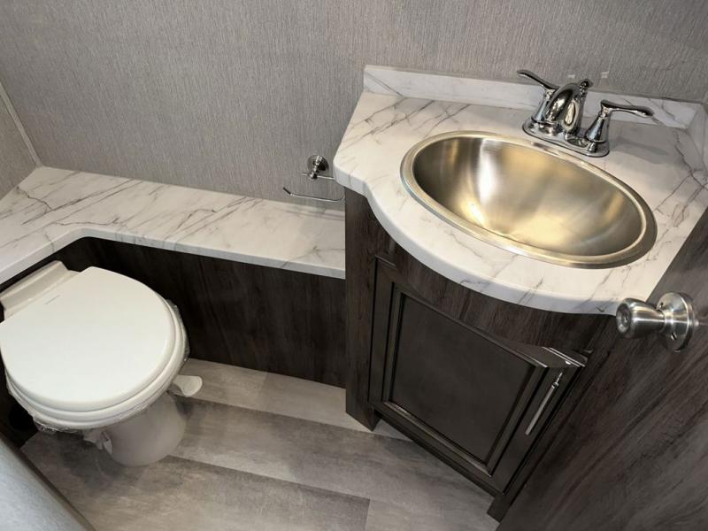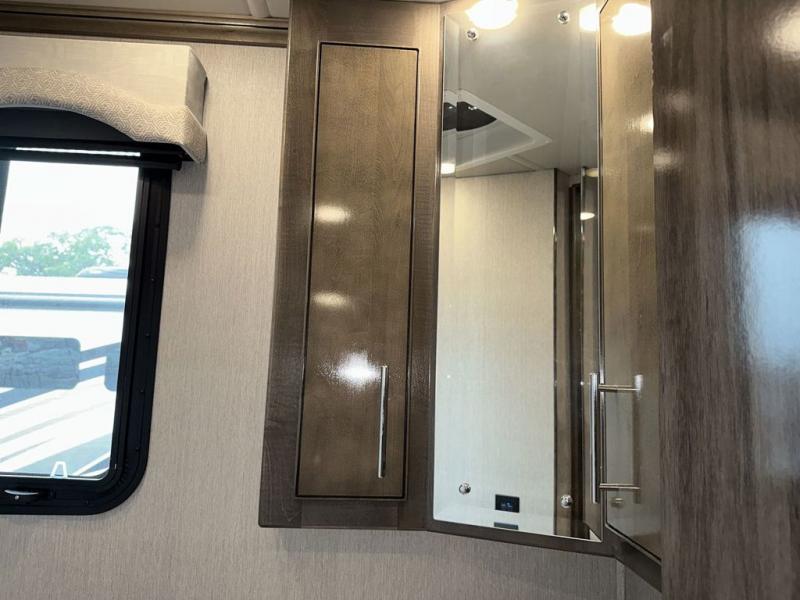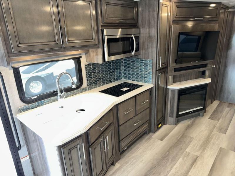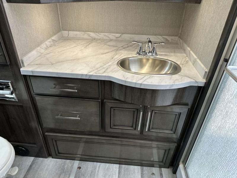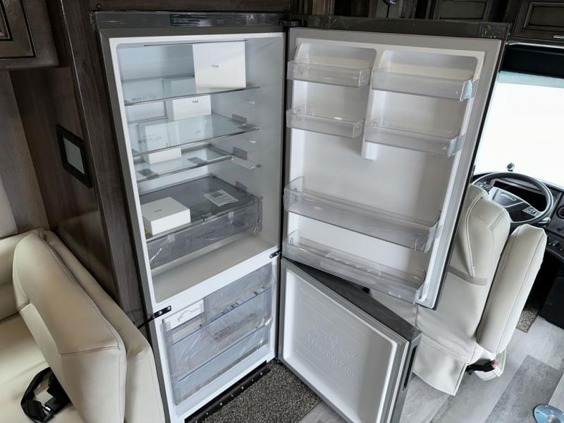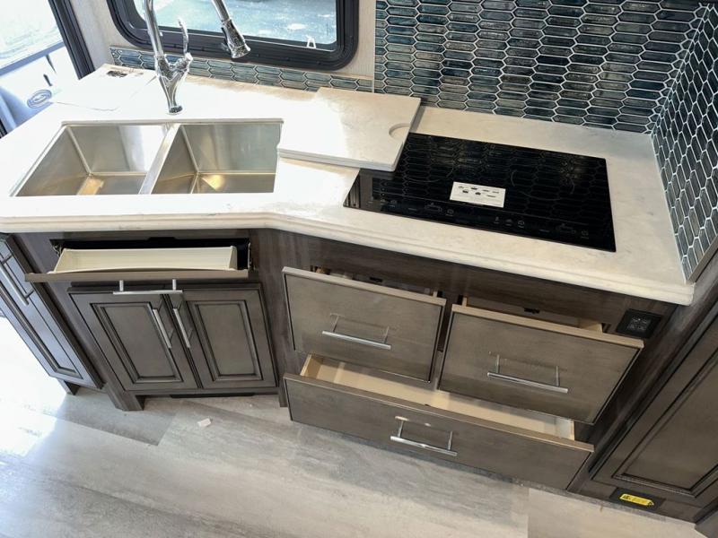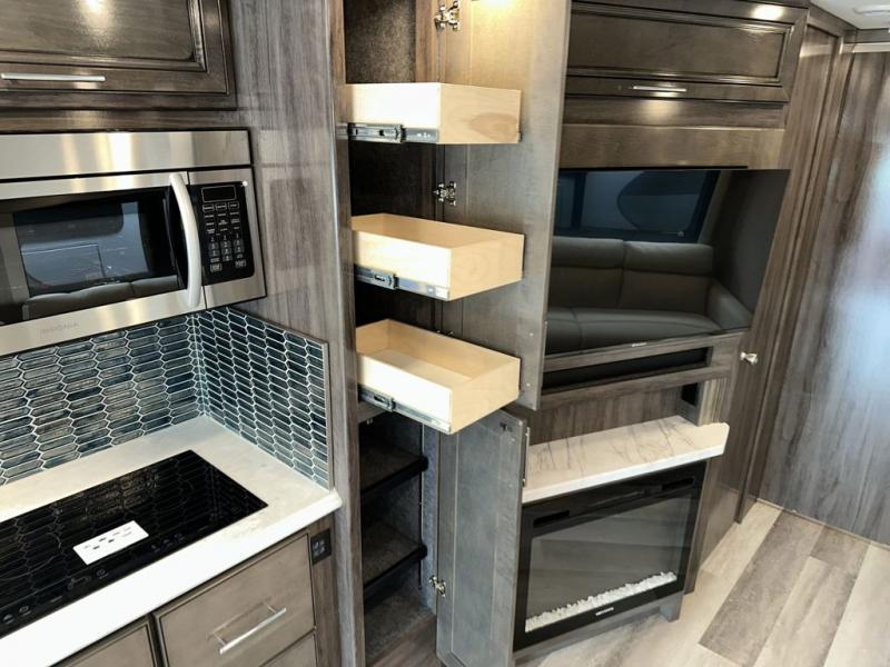 Looking for a spacious living and kitchen area in your next coach? This Pace Arrow provides that with the large slide that offers a sofa with a jackknife sleeper for overnight guests and a booth dinette, plus a residential refrigerator for lots of food storage. And the captain's chairs with pedestal table offer more seating when you have friends over to visit. The cook will love the galley kitchen with a convection microwave and induction cooktop, plus a pantry and a counter extension for more prep space. The handy half bath is mid-coach, and the master suite offers an Encore Series king bed that slides out, wardrobes with a dresser, an LED TV, and is a step away from the full bathroom. The exterior includes extra towing for your off-road toy trailer or a cargo rack for totes or even a vehicle, plus storage for outdoor chairs and such, a steel constructed entry step box, an electric awning with lighting and motion sensor retract, a Winegard 360-degree air antenna plus the coach is solar and satellite ready