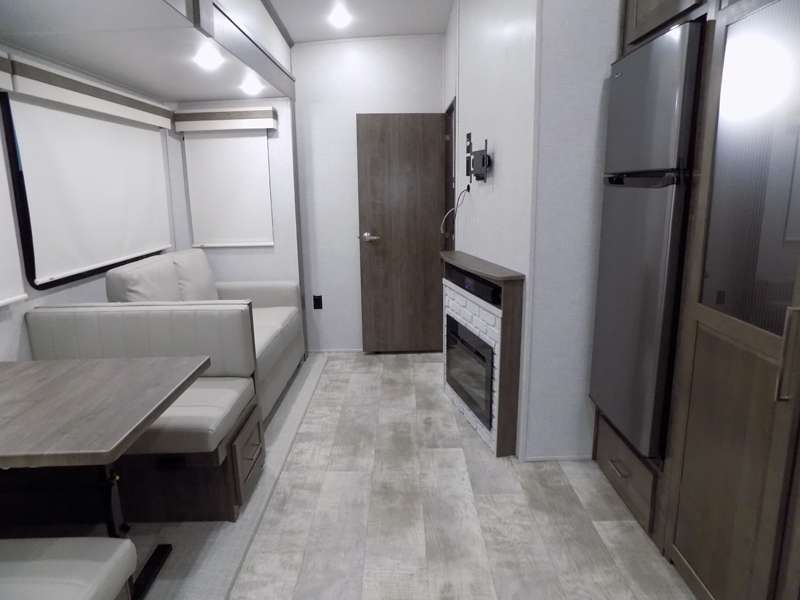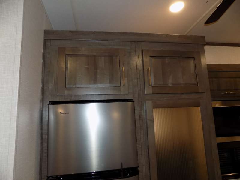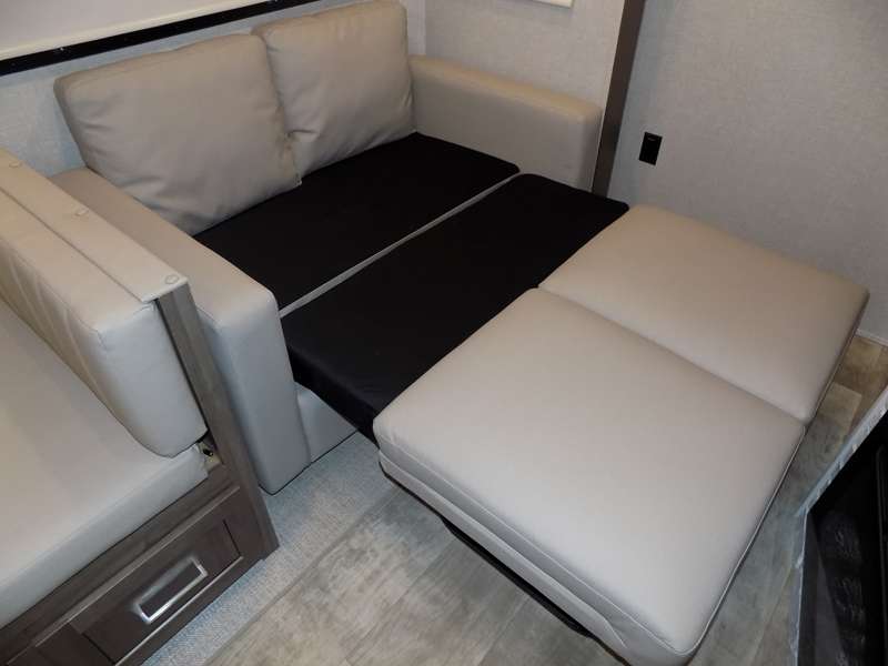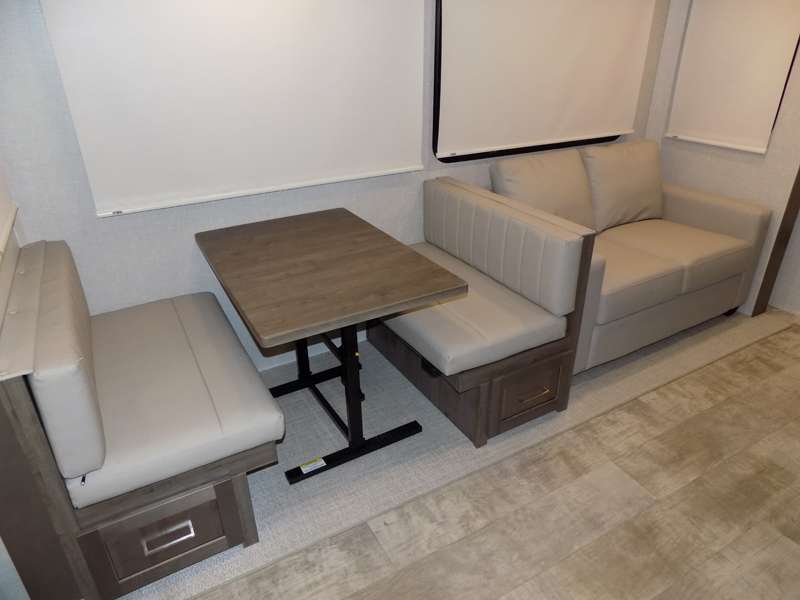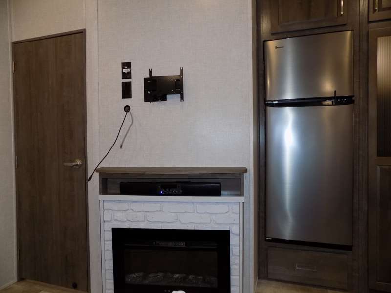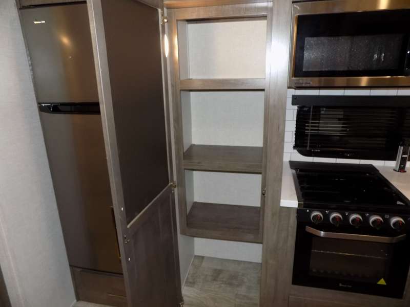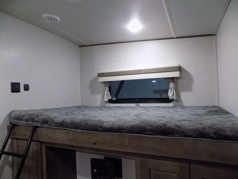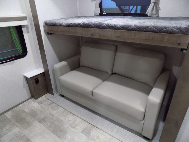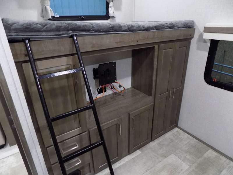Need a fifth wheel that can accommodate nine or ten travelers? If so, this one is for you! You will love the private bunkhouse at the rear for the kids or extra guests, and private en suite up front for you. The bedroom with dual entry bath up front makes it easy to enjoy time away from the hustle and bustle in the back of the unit. A slide out wardrobe and linen cabinet provides added floor space and storage. There is also pass-through storage beneath this area of the unit along with front exterior storage as well. The main combined kitchen and living area features a 60" hide-a-bed and 39" dinette slide for added walking around space. You can also choose the optional 60" theater seating and/or table and chairs if you prefer. The inside kitchen offers all of the amenities needed, plus you have an outside griddle off the slide for making breakfast, and an exterior kitchen off the bunk area with swing out two-burner stove, plus refrigerator. The rear bunkhouse has a half bath for convenience and you can easily sleep four to five in this area with a 67" hide-a-bed beneath a 72" x 32" flip-up bunk opposite a 42" x 72" bunk above the TV and storage space.