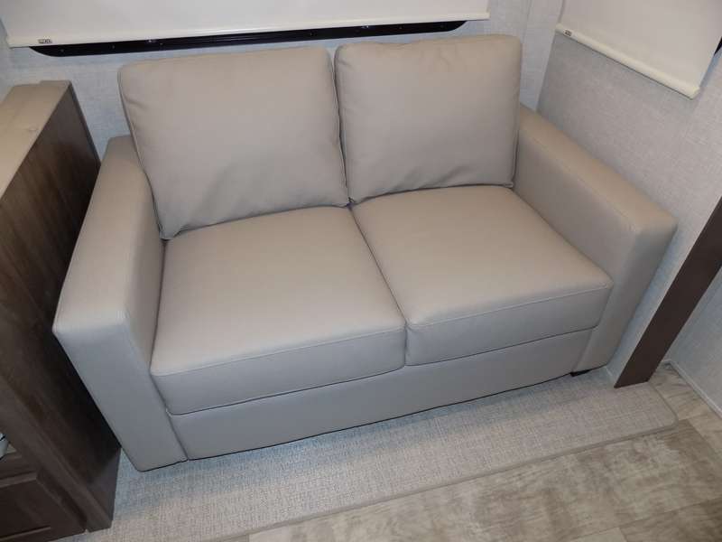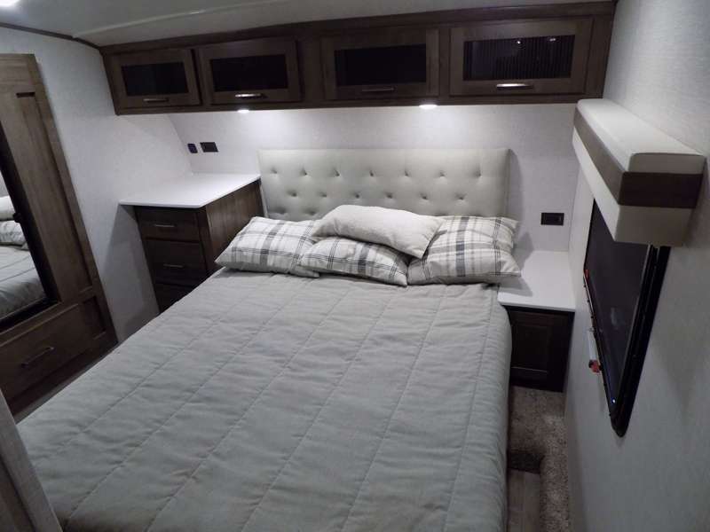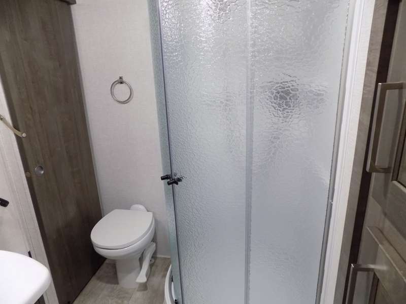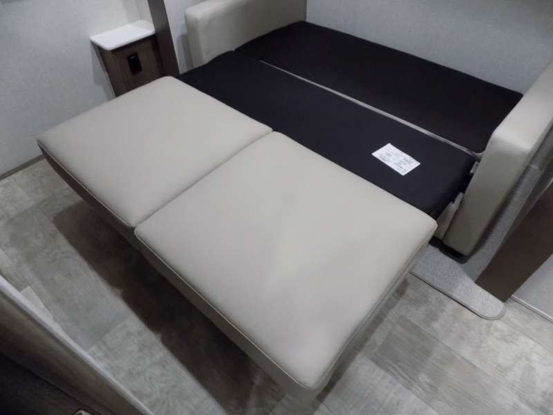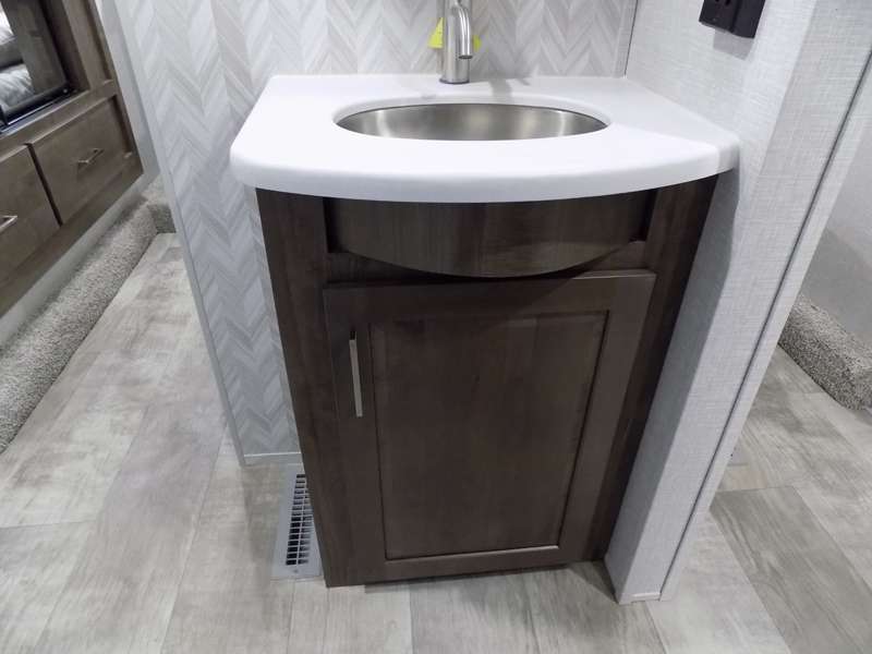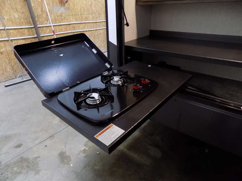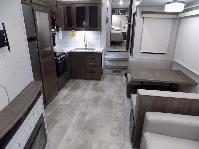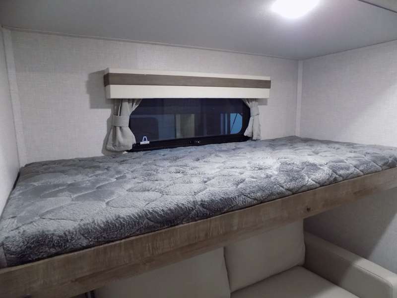 Need a fifth wheel that can accommodate nine or ten travelers? If so, this one is for you! You will love the private bunkhouse at the rear for the kids or extra guests, and private en suite up front for you. The bedroom with dual entry bath up front makes it easy to enjoy time away from the hustle and bustle in the back of the unit. A slide out wardrobe and linen cabinet provides added floor space and storage. There is also pass-through storage beneath this area of the unit along with front exterior storage as well. The main combined kitchen and living area features a 60" hide-a-bed and 39" dinette slide for added walking around space. You can also choose the optional 60" theater seating and/or table and chairs if you prefer. The inside kitchen offers all of the amenities needed, plus you have an outside griddle off the slide for making breakfast, and an exterior kitchen off the bunk area with swing out two-burner stove, plus refrigerator. The rear bunkhouse has a half bath for convenience and you can easily sleep four to five in this area with a 67" hide-a-bed beneath a 72" x 32" flip-up bunk opposite a 42" x 72" bunk above the TV and storage space.
