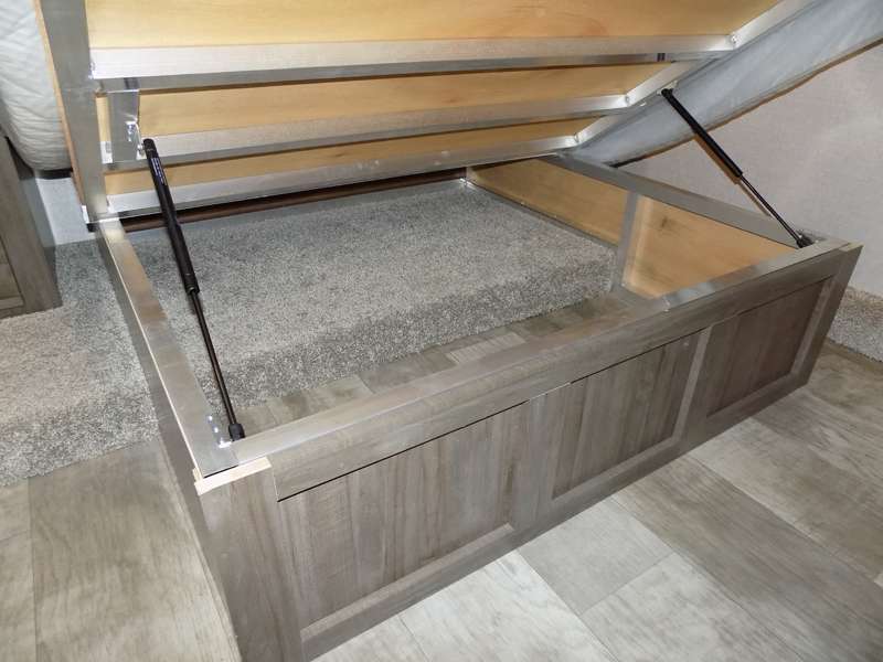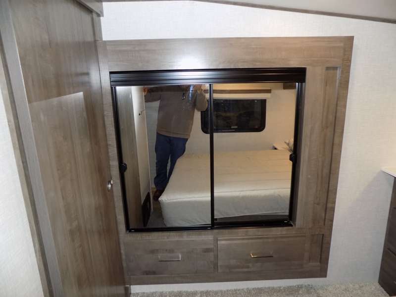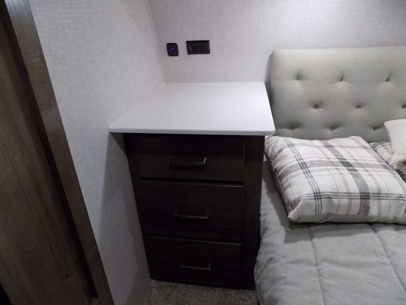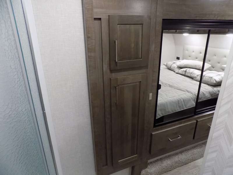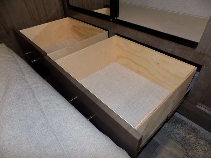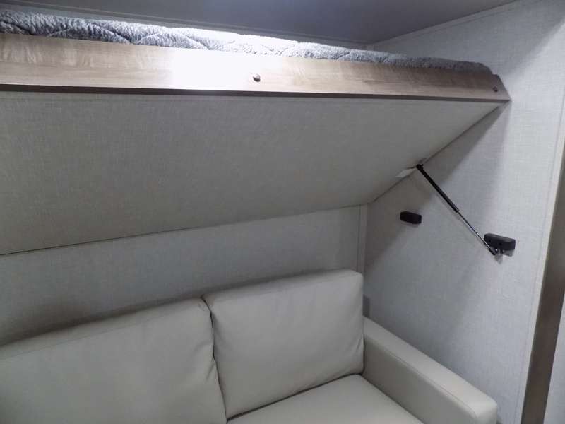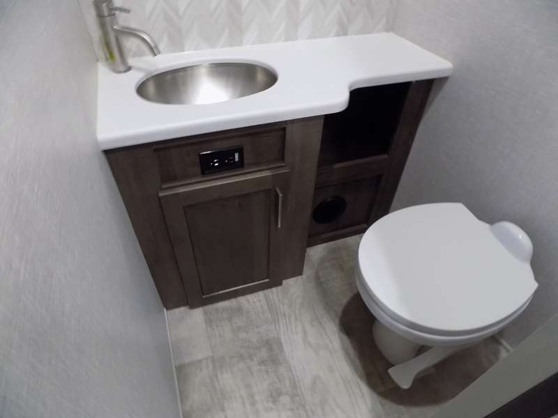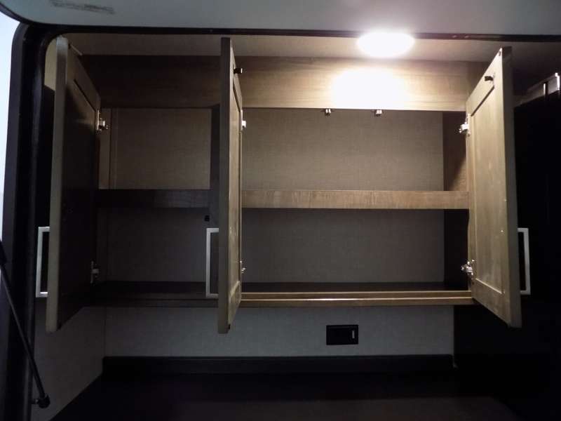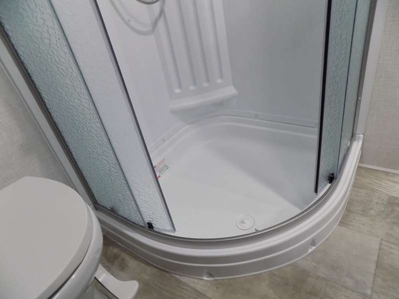 Need a fifth wheel that can accommodate nine or ten travelers? If so, this one is for you! You will love the private bunkhouse at the rear for the kids or extra guests, and private en suite up front for you. The bedroom with dual entry bath up front makes it easy to enjoy time away from the hustle and bustle in the back of the unit. A slide out wardrobe and linen cabinet provides added floor space and storage. There is also pass-through storage beneath this area of the unit along with front exterior storage as well. The main combined kitchen and living area features a 60" hide-a-bed and 39" dinette slide for added walking around space. You can also choose the optional 60" theater seating and/or table and chairs if you prefer. The inside kitchen offers all of the amenities needed, plus you have an outside griddle off the slide for making breakfast, and an exterior kitchen off the bunk area with swing out two-burner stove, plus refrigerator. The rear bunkhouse has a half bath for convenience and you can easily sleep four to five in this area with a 67" hide-a-bed beneath a 72" x 32" flip-up bunk opposite a 42" x 72" bunk above the TV and storage space.