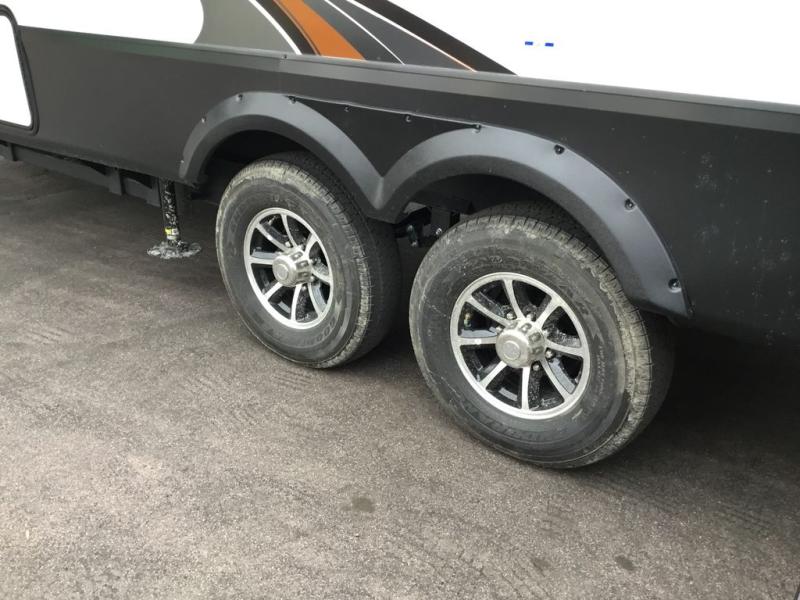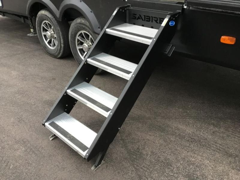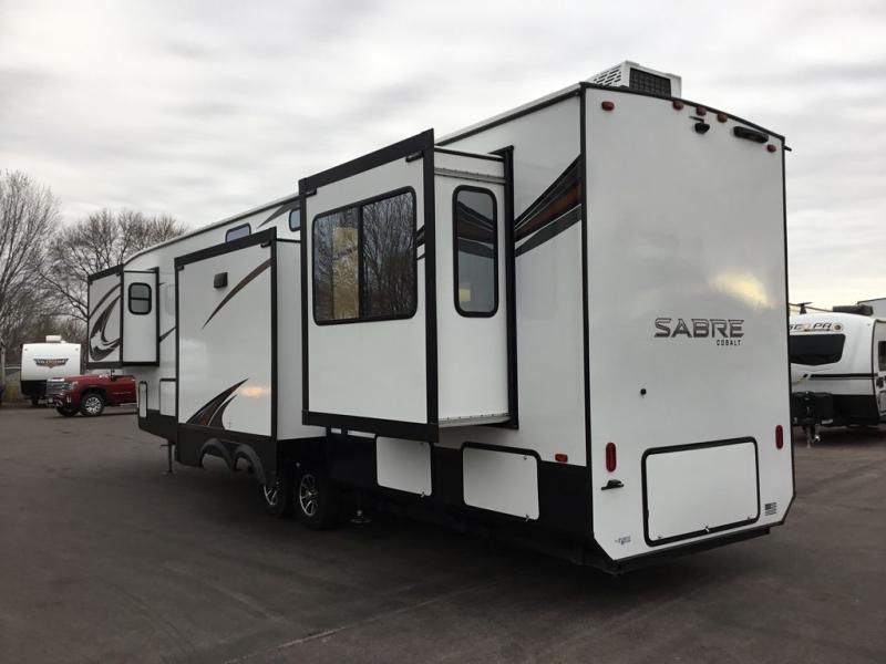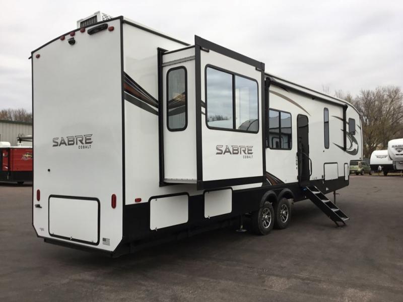 You will experience luxurious camping trips at an affordable price with any one of these Forest River Sabre fifth wheels! These models are durable and ready to travel anytime of the year thanks to features like the high-gloss gel-coat front cap with LED lighting, the PVC roof membrane, and the forced air underbelly with enclosed gate valves. The electric auto-leveling system makes setting up easy and safe, and the adjustable power awning with LED lighting will create an inviting outdoor living space. Each model includes a universal docking station which includes a black tank flush and an outside shower, and the backlit "Secure Step" landing for you to enter and exit the unit safely. Inside, you will love the design of the ambient accent lighting above the crown molding in the living area, the real wood lumbercore cabinetry, and the vintage gaslight decorative lighting!
