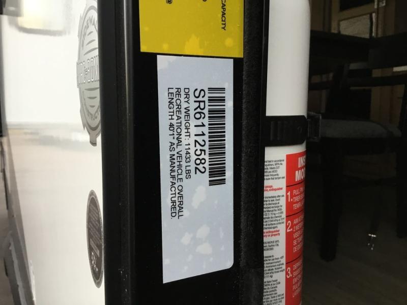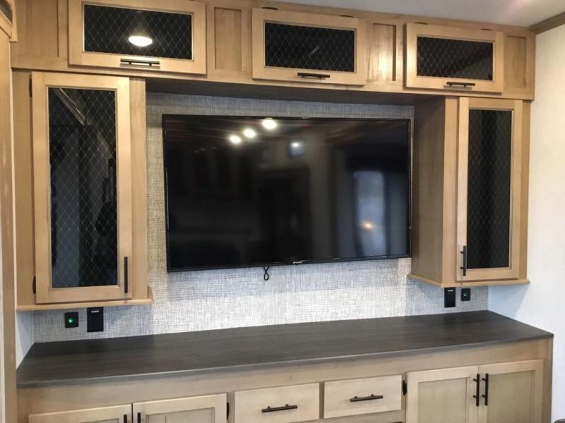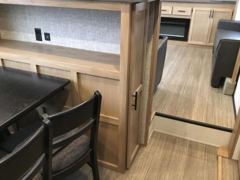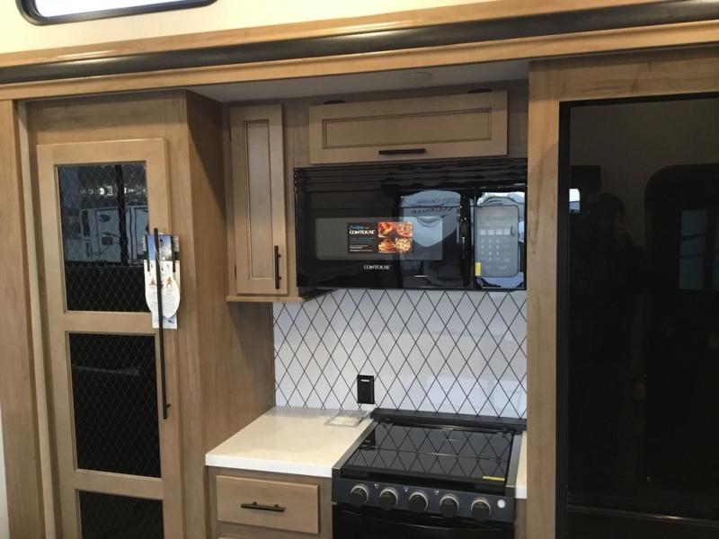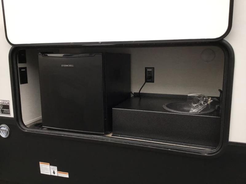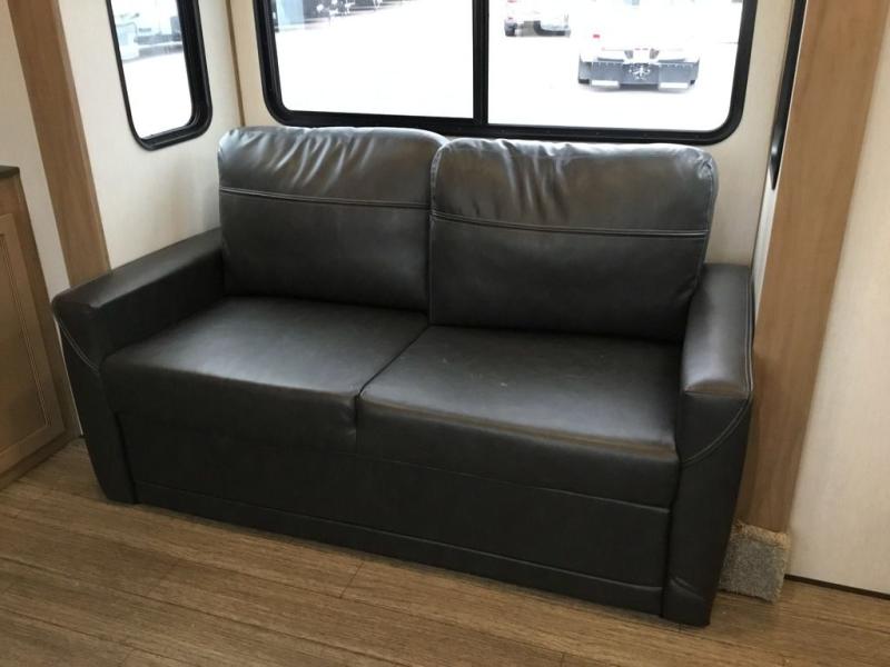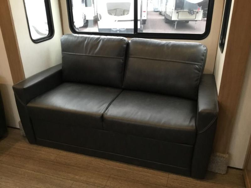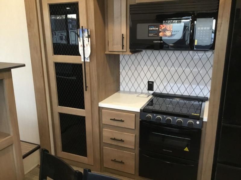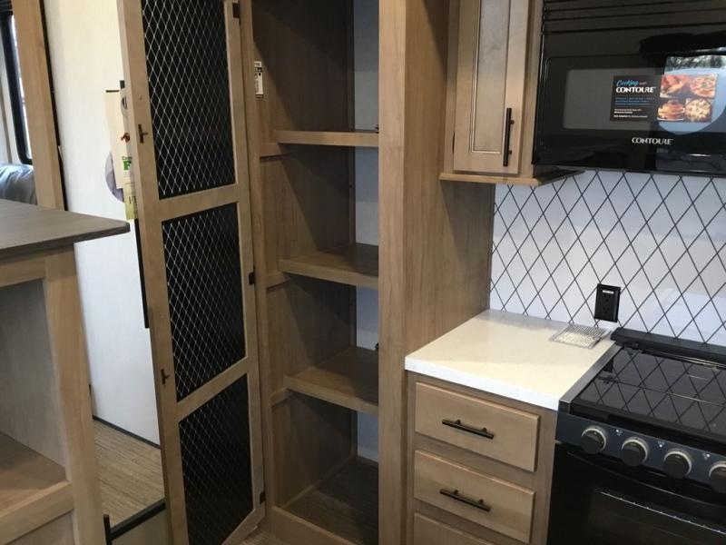 Pack your bags and head across the country in this cozy fifth wheel for six. The rear living area includes two tri-fold sofas, a Smart TV, 55" theater seating for two, plus two cabinets, making this space a second bedroom at night for guests. In the morning, you can prepare breakfast on the three burner range, then dine together at the free-standing table with bench seating and two chairs. There is plenty of storage space here, including a pantry, a hutch, and overhead cabinets. The full bath will allow you to stay clean throughout your trip, and you'll feel right at home in the front private bedroom with a king bed. This model also includes an outside kitchen with a sink and a refrigerator for snacks, plus basement storage in front and back as well as a massive pass-thru storage below the living area for all your gear!