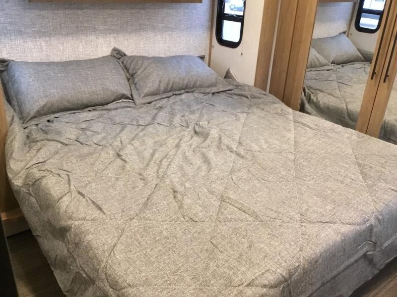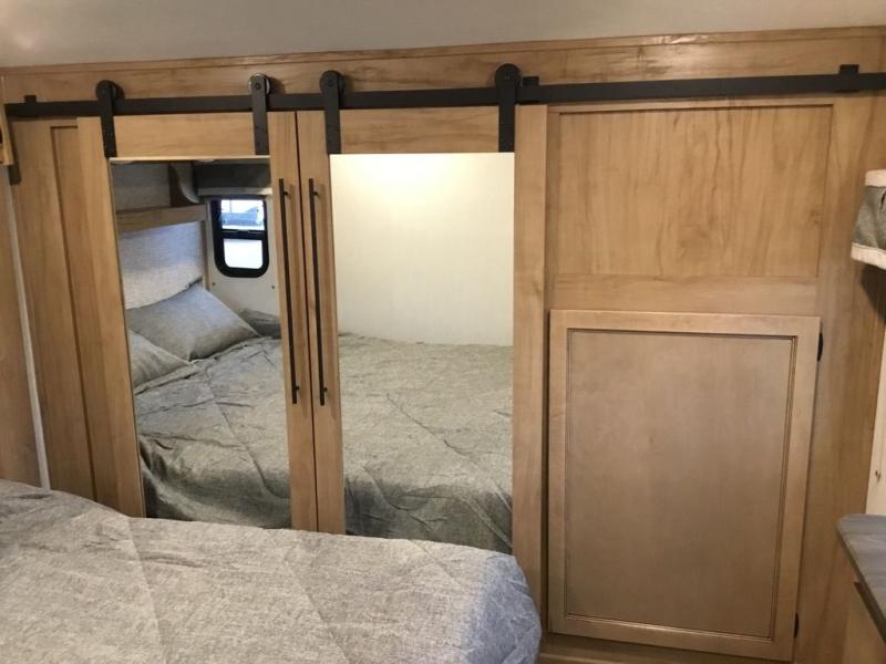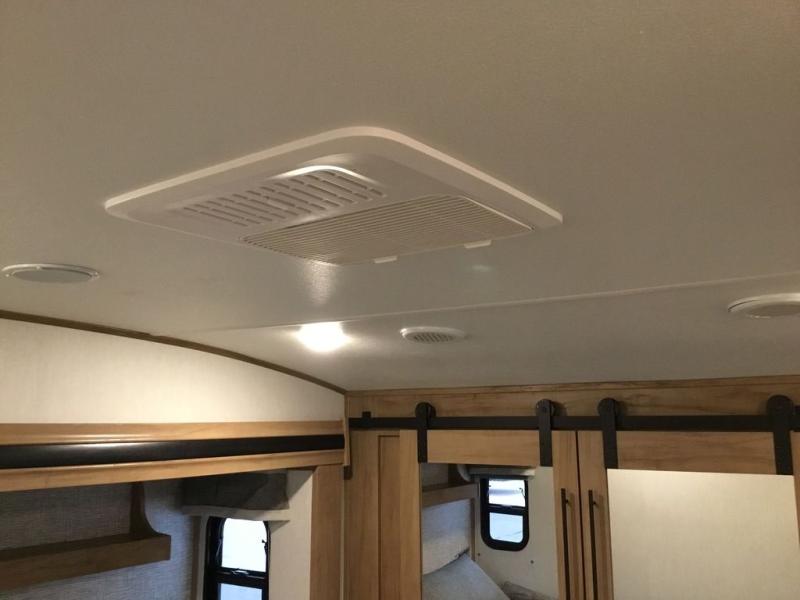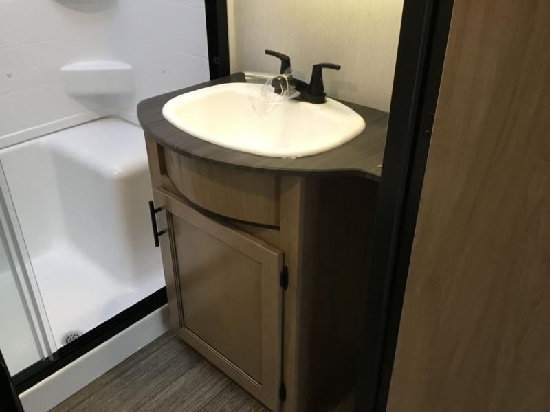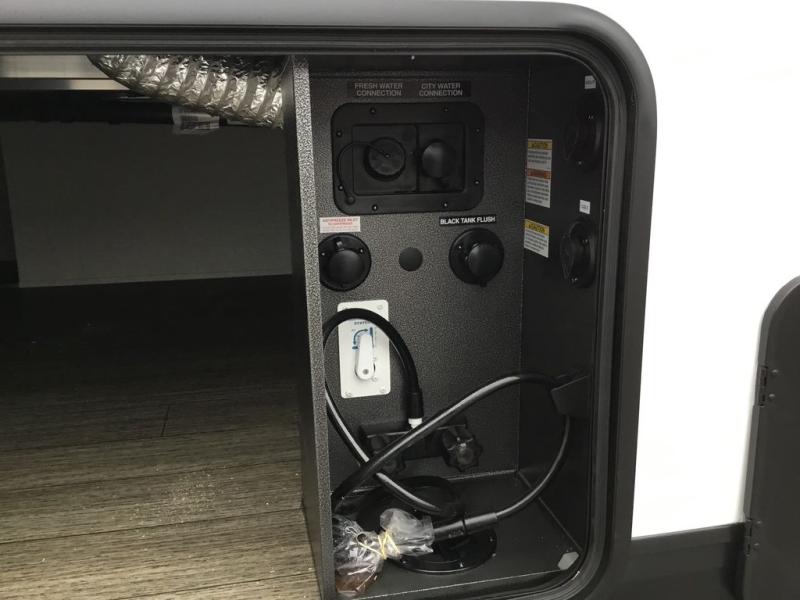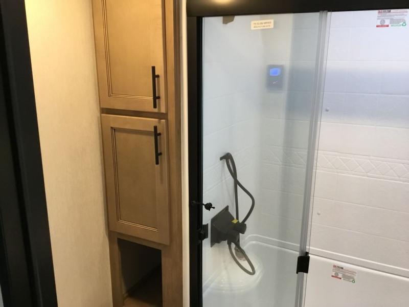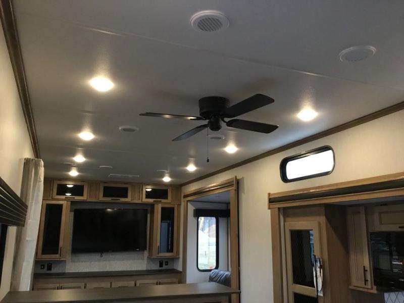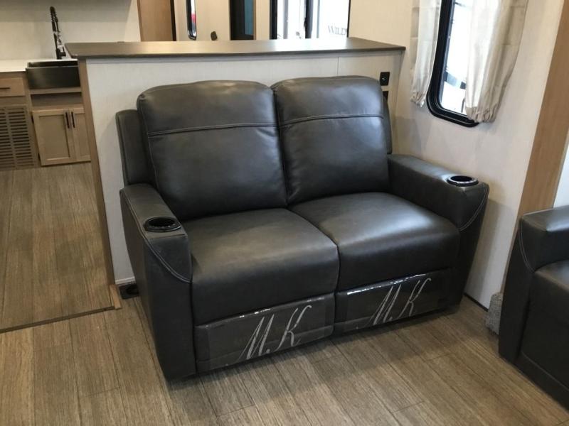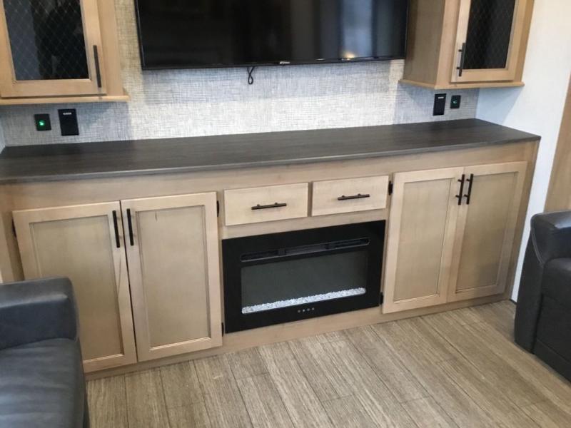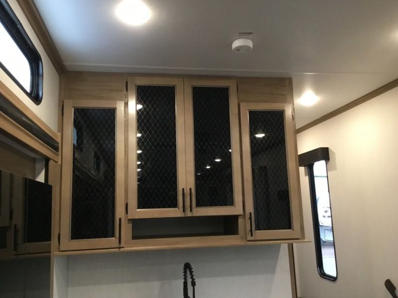 Pack your bags and head across the country in this cozy fifth wheel for six. The rear living area includes two tri-fold sofas, a Smart TV, 55" theater seating for two, plus two cabinets, making this space a second bedroom at night for guests. In the morning, you can prepare breakfast on the three burner range, then dine together at the free-standing table with bench seating and two chairs. There is plenty of storage space here, including a pantry, a hutch, and overhead cabinets. The full bath will allow you to stay clean throughout your trip, and you'll feel right at home in the front private bedroom with a king bed. This model also includes an outside kitchen with a sink and a refrigerator for snacks, plus basement storage in front and back as well as a massive pass-thru storage below the living area for all your gear!