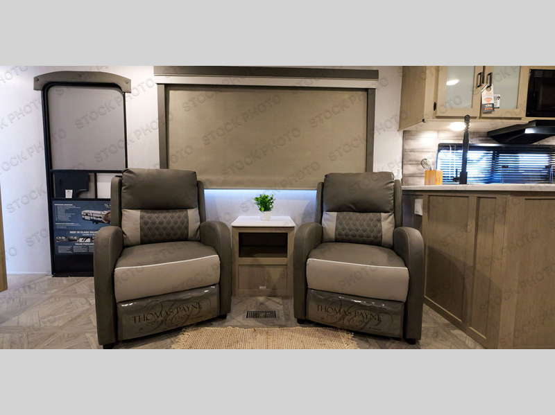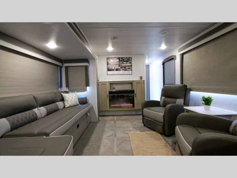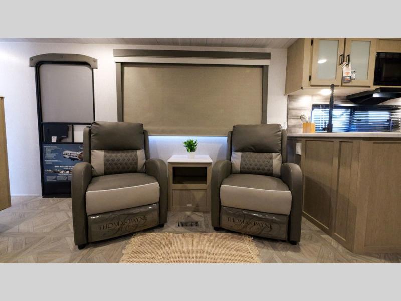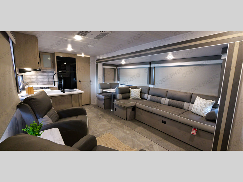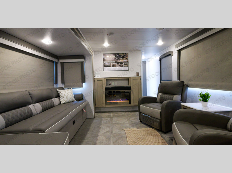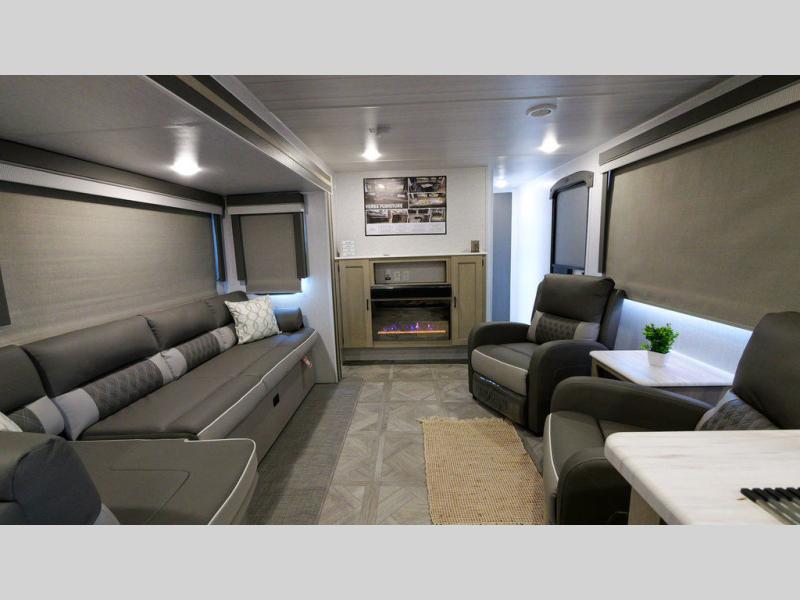 With a spacious kitchen and panoramic windows, this travel trailer is sure to stand out! The Versa Lounge is customizable for you to reconfigure for your needs and it also has Stow N Go storage for extra blankets. Your nights will be spent in true comfort by playing games at the booth dinette or relaxing in one of the two chairs by the fireplace. You can either cook a delicious meal in the rear kitchen or you can add the exterior camp kitchen to breathe in some fresh air while you cook. After a fun-filled day, you can rinse off in the walk-in shower then head to the front private bedroom, grab your pajamas from the walk-in closet, and lay down on the custom king bed for a good night's rest!