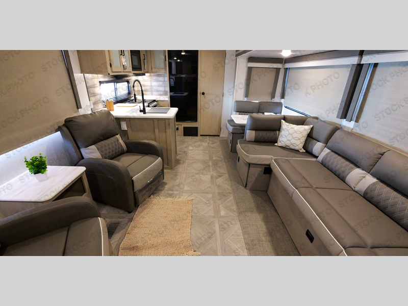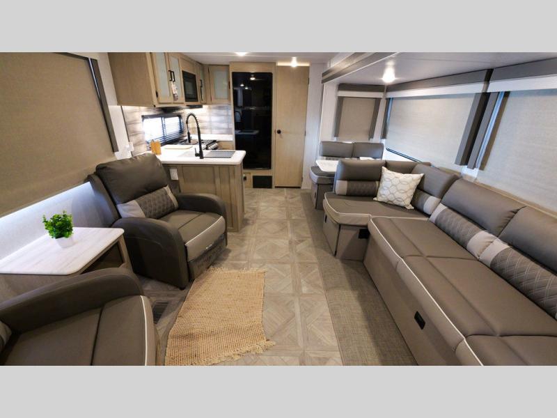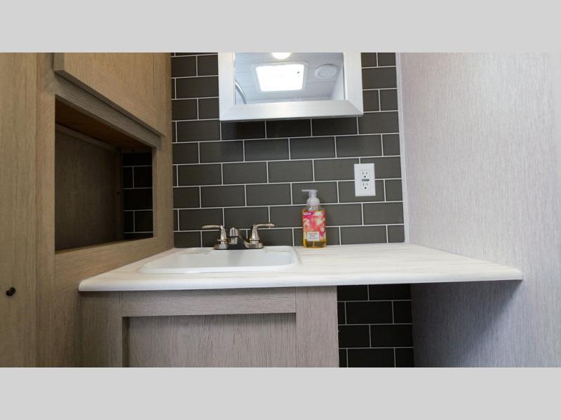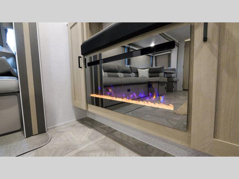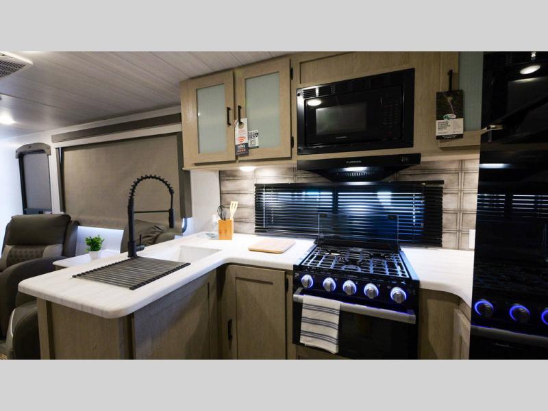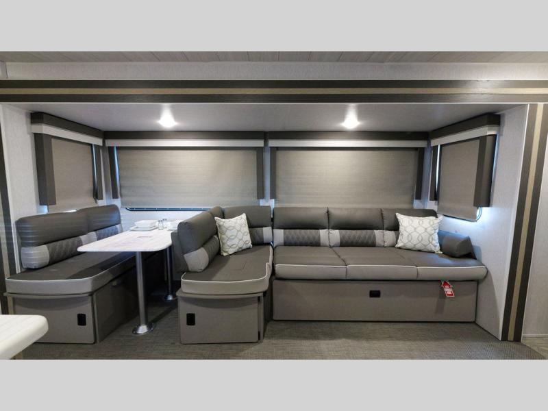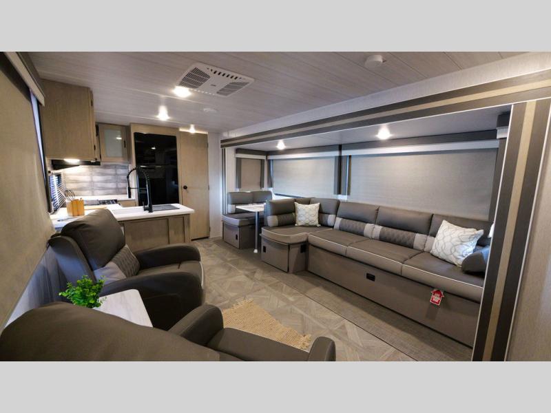 With a spacious kitchen and panoramic windows, this travel trailer is sure to stand out! The Versa Lounge is customizable for you to reconfigure for your needs and it also has Stow N Go storage for extra blankets. Your nights will be spent in true comfort by playing games at the booth dinette or relaxing in one of the two chairs by the fireplace. You can either cook a delicious meal in the rear kitchen or you can add the exterior camp kitchen to breathe in some fresh air while you cook. After a fun-filled day, you can rinse off in the walk-in shower then head to the front private bedroom, grab your pajamas from the walk-in closet, and lay down on the custom king bed for a good night's rest!