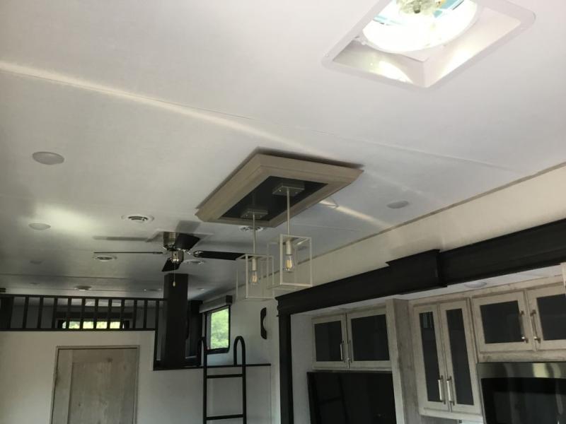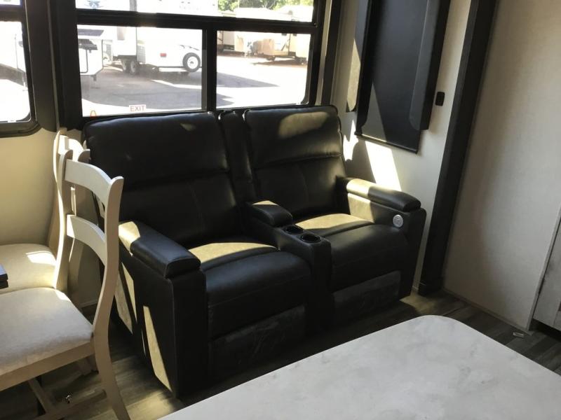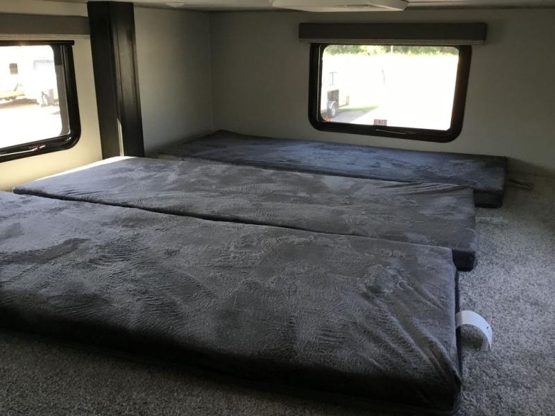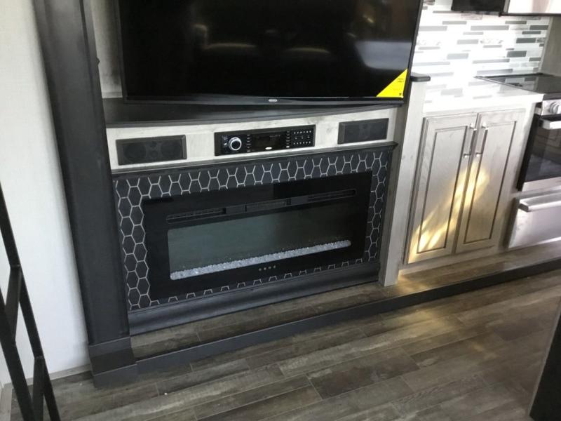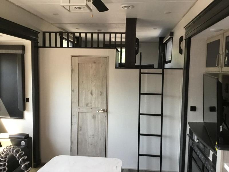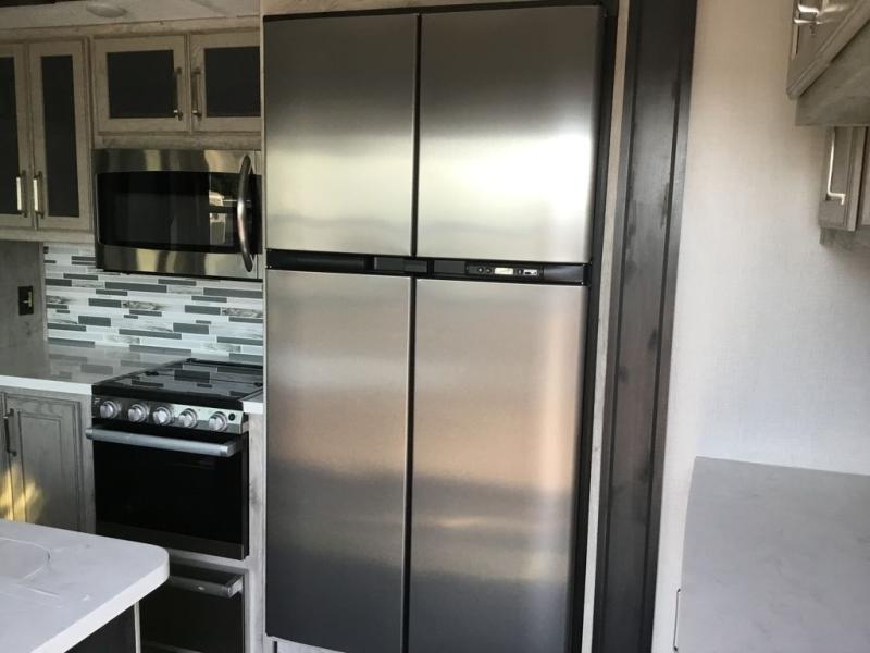 Get ready for family fun in this fifth wheel offering a front master bedroom with a king-size bed slide, plus a second master bedroom for your guests! The second bedroom includes a queen-size bed slide, a loft above the bedroom, plus a rear full bathroom including a unique rear entry/exit door. And both entrances include the LCl SolidStep. The main living and kitchen area offers dual opposing slides and include theater seating, a free standing dinette, a fireplace, a center island and full kitchen amenities to feed the crew. You might even like to add the residential refrigerator option. There is much more to enjoy inside and outside, grab your family, easily load up, and head out for fun!