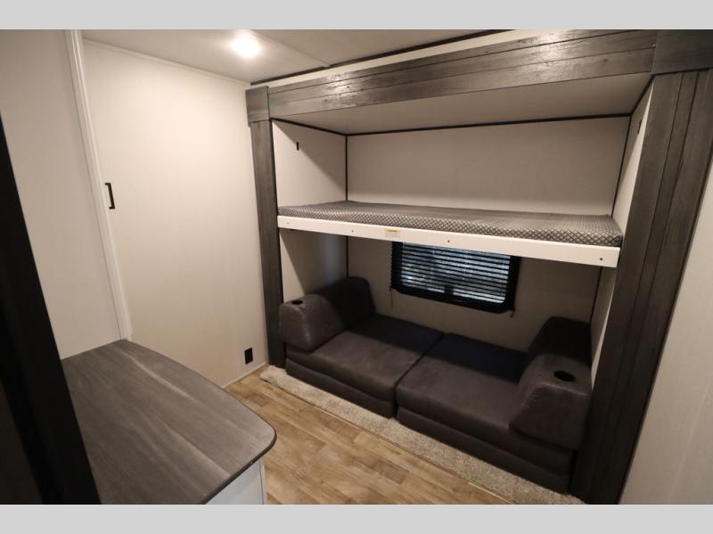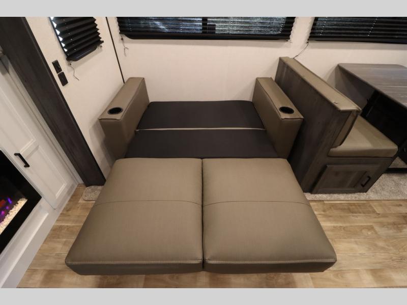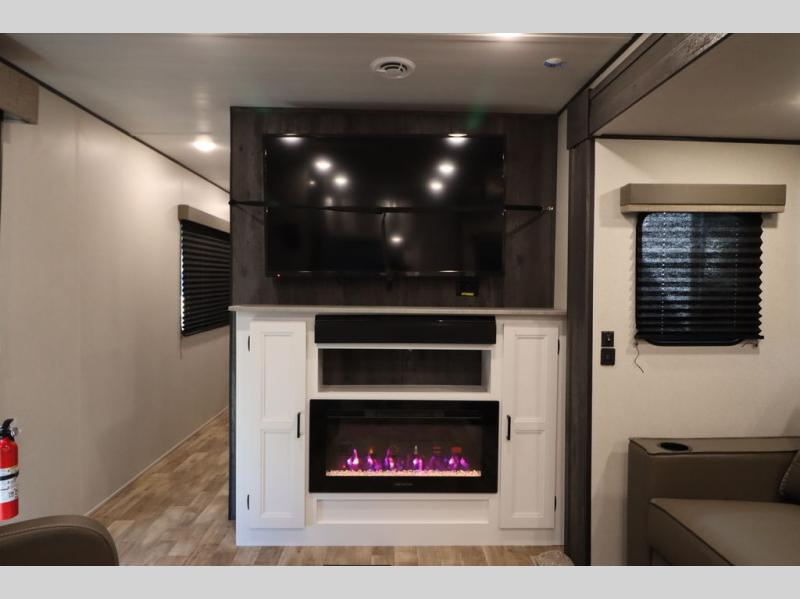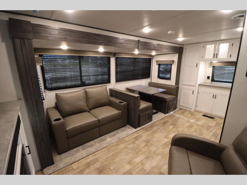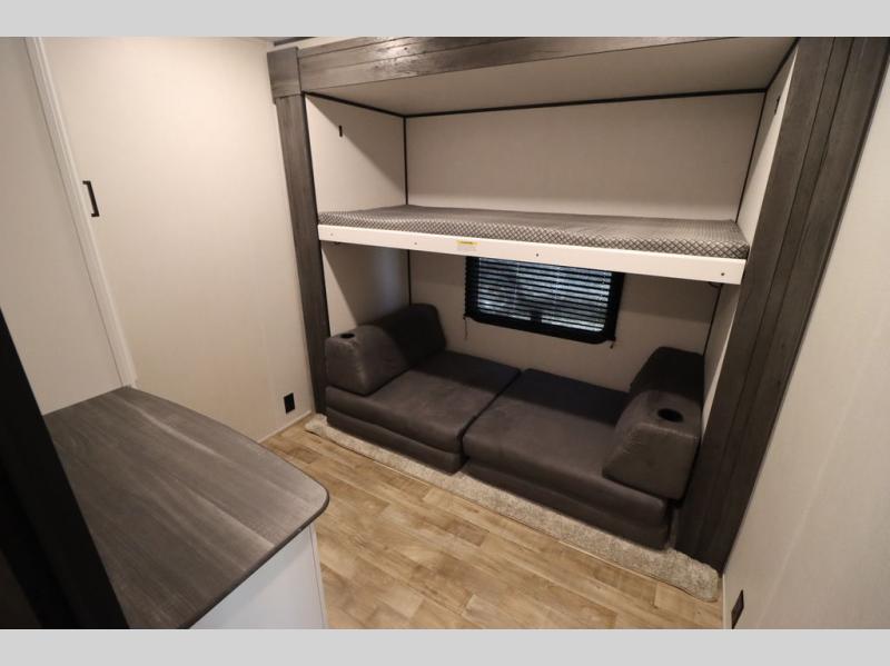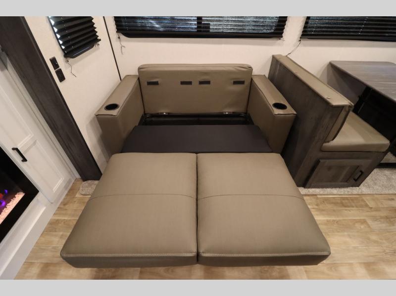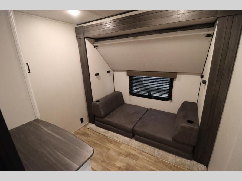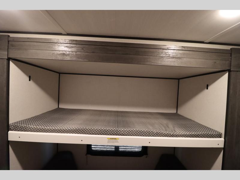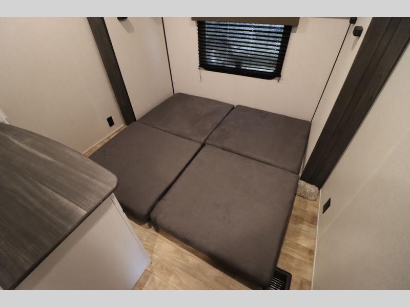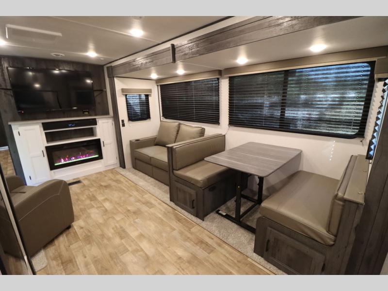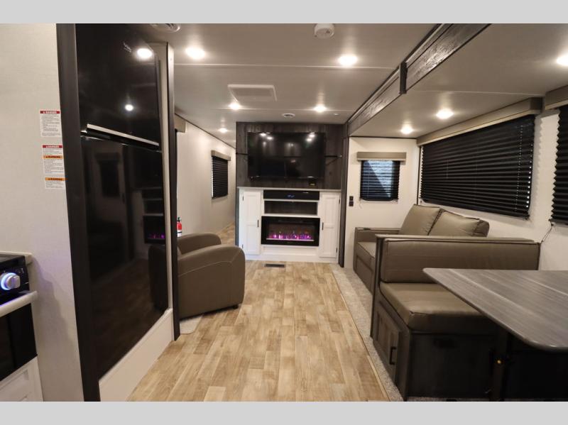 This Hideout destination trailer will serve as the perfect companion for all upcoming trips! It allows you to have separate sleeping spaces with the master suite and the private bunkhouse. The bunkhouse includes a slide out with a 32" x 74" upper bunk and a lower cube bunk. There is also a desktop, so you can use this space as an office if needed. The main living area is a comfortable place to relax with the lounge chair, booth dinette, and optional tri-fold sleeper sofa. There is also a 50" HDTV and fireplace to make the living area even more attractive. You'll get quite a lot of use out of the front kitchen which features a pantry, residential refrigerator, three-burner range, and overhead cabinets.