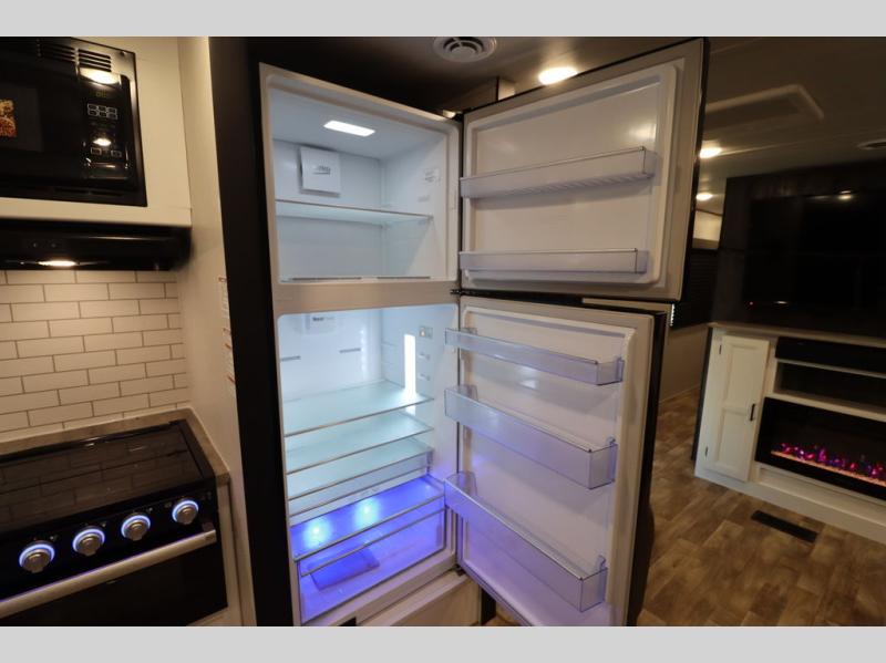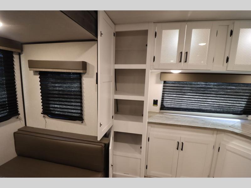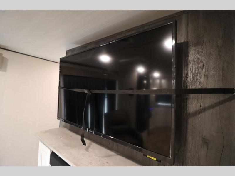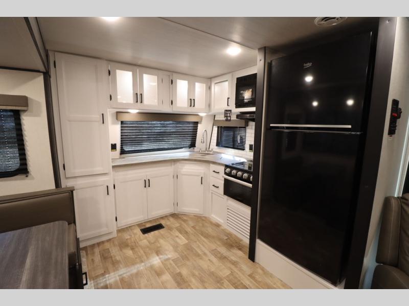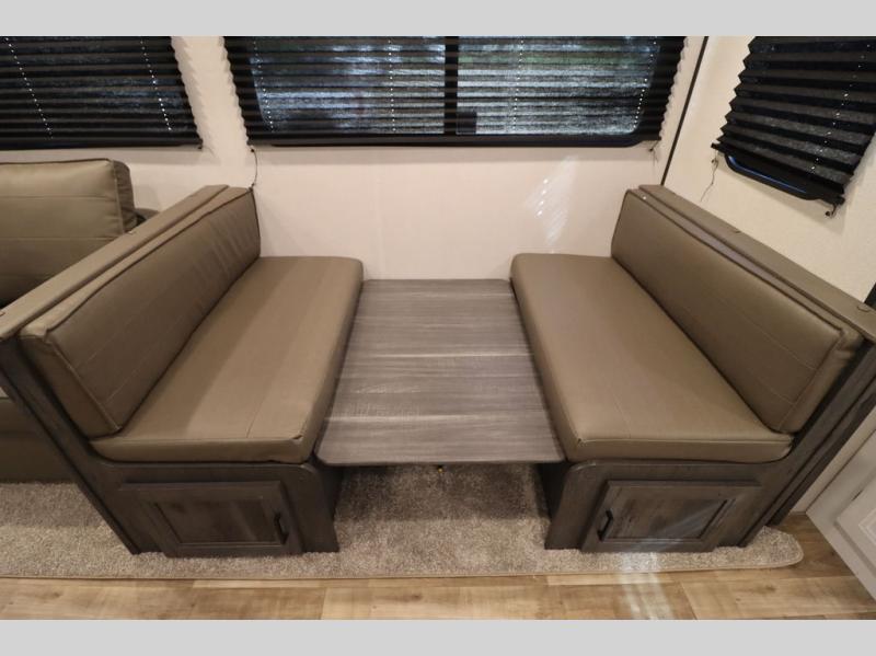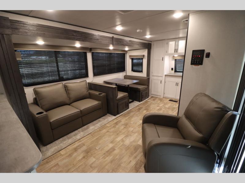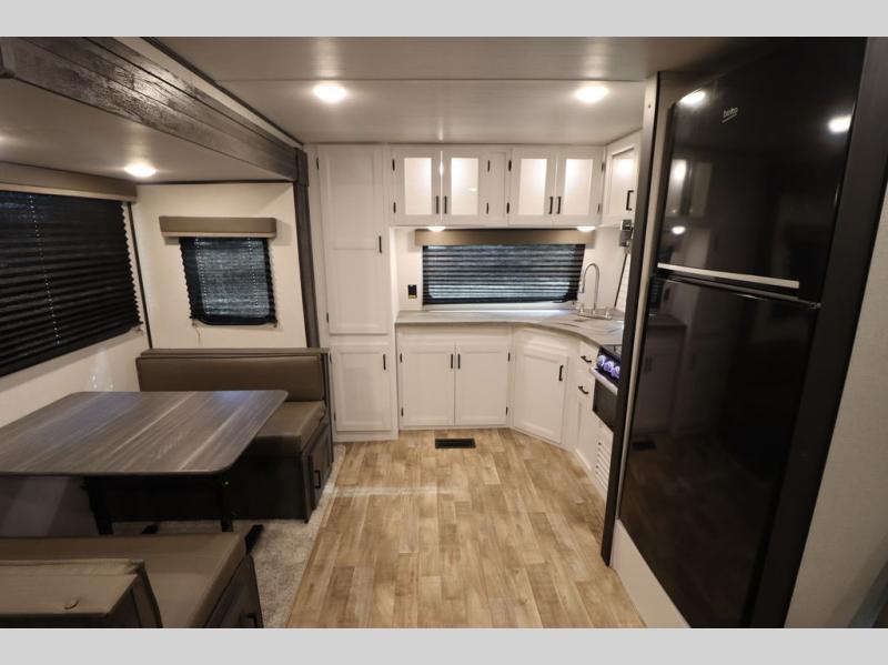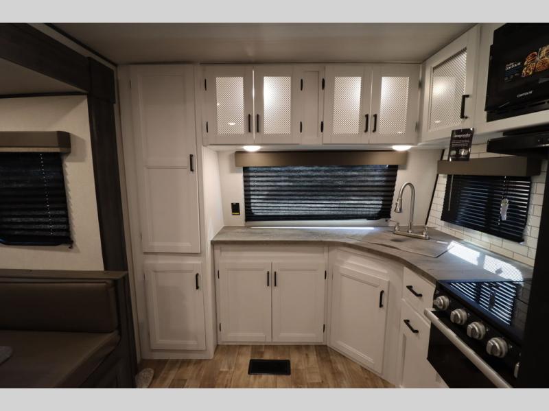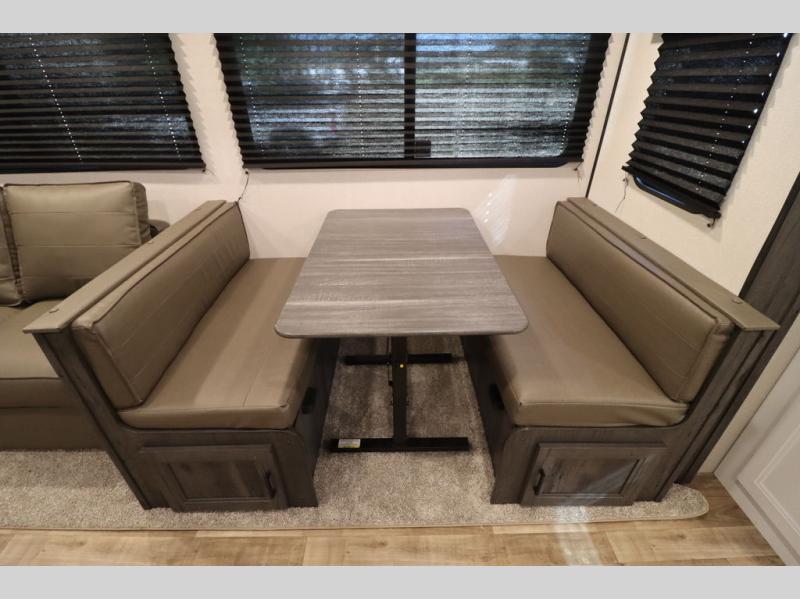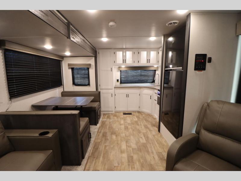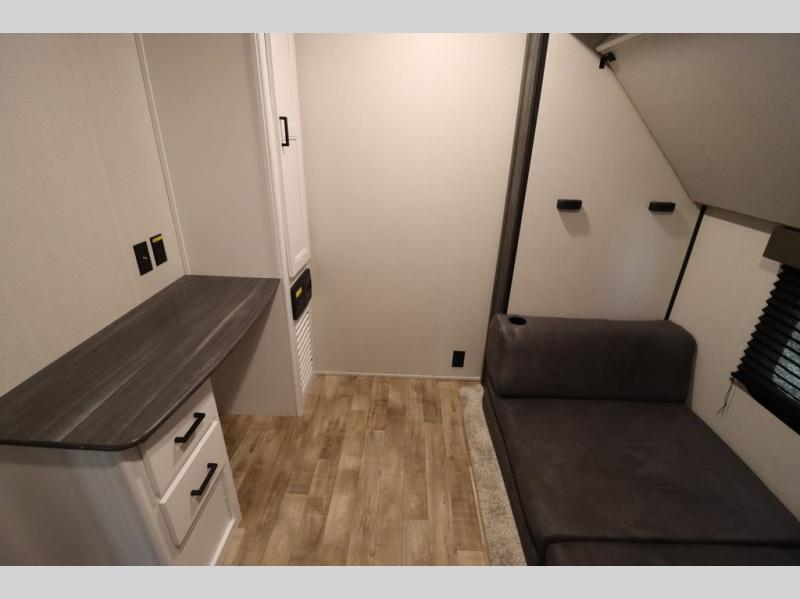 This Hideout destination trailer will serve as the perfect companion for all upcoming trips! It allows you to have separate sleeping spaces with the master suite and the private bunkhouse. The bunkhouse includes a slide out with a 32" x 74" upper bunk and a lower cube bunk. There is also a desktop, so you can use this space as an office if needed. The main living area is a comfortable place to relax with the lounge chair, booth dinette, and optional tri-fold sleeper sofa. There is also a 50" HDTV and fireplace to make the living area even more attractive. You'll get quite a lot of use out of the front kitchen which features a pantry, residential refrigerator, three-burner range, and overhead cabinets.