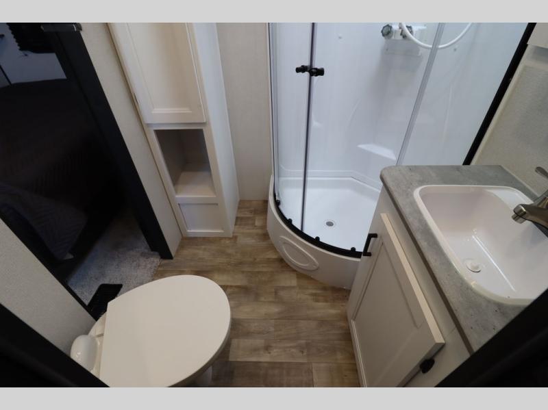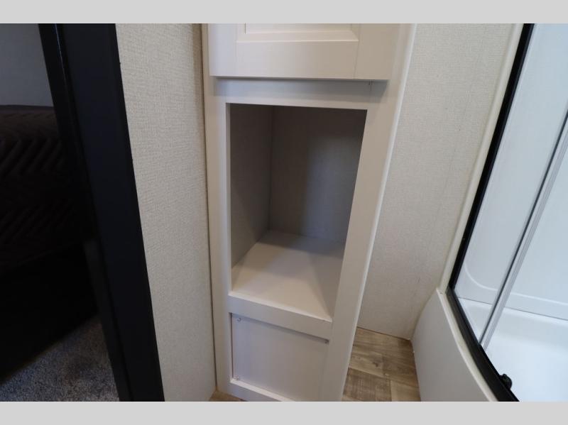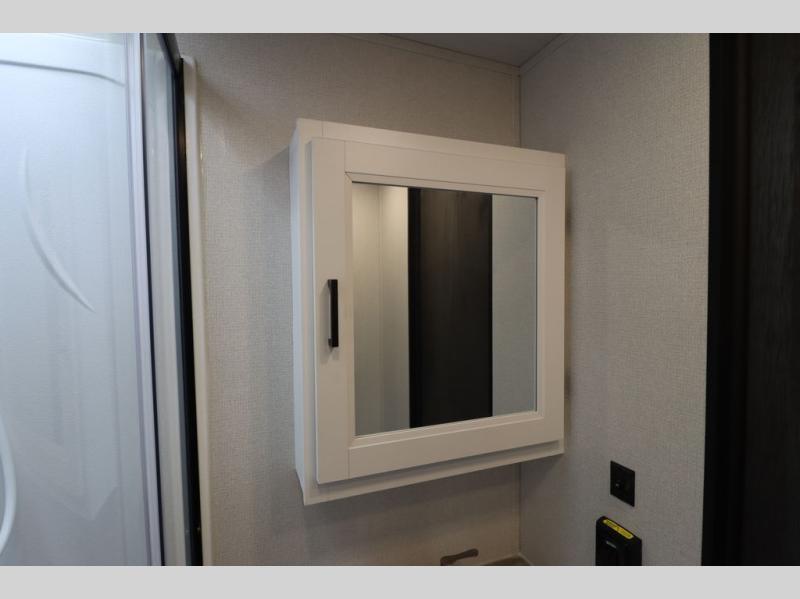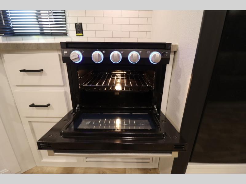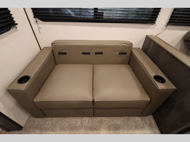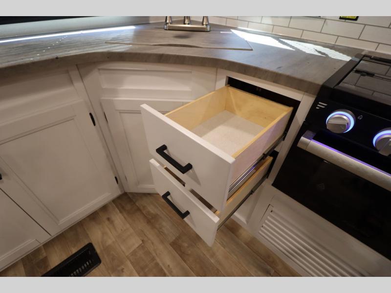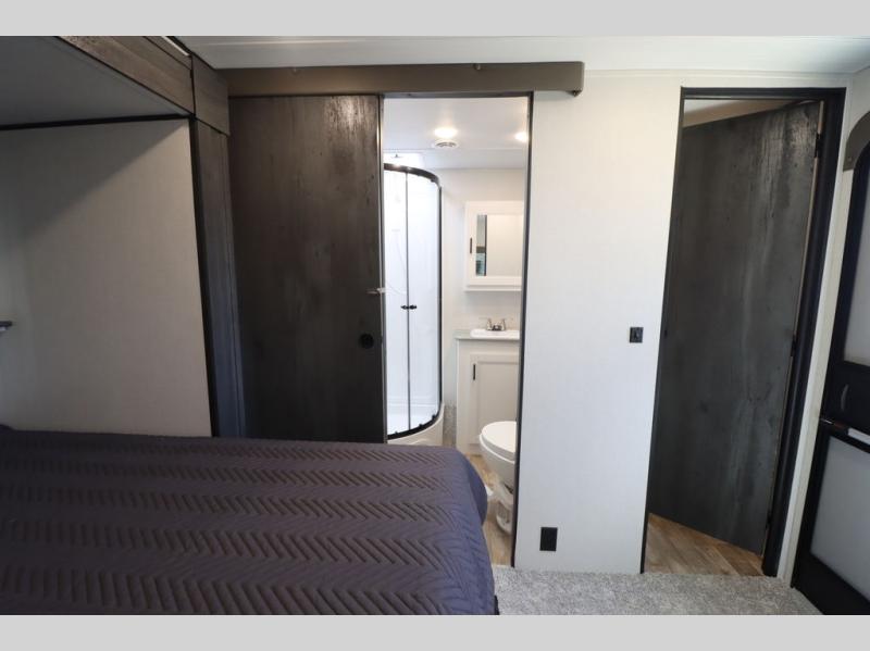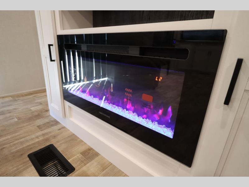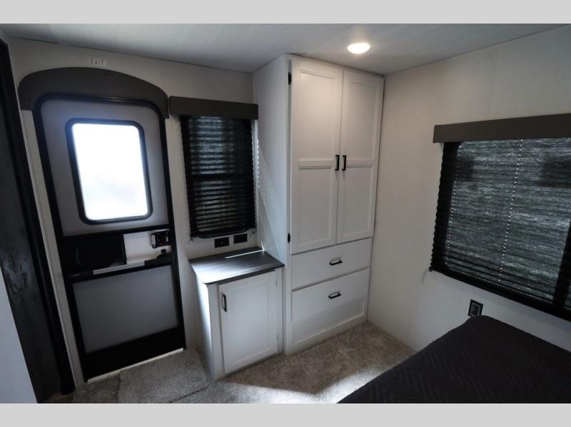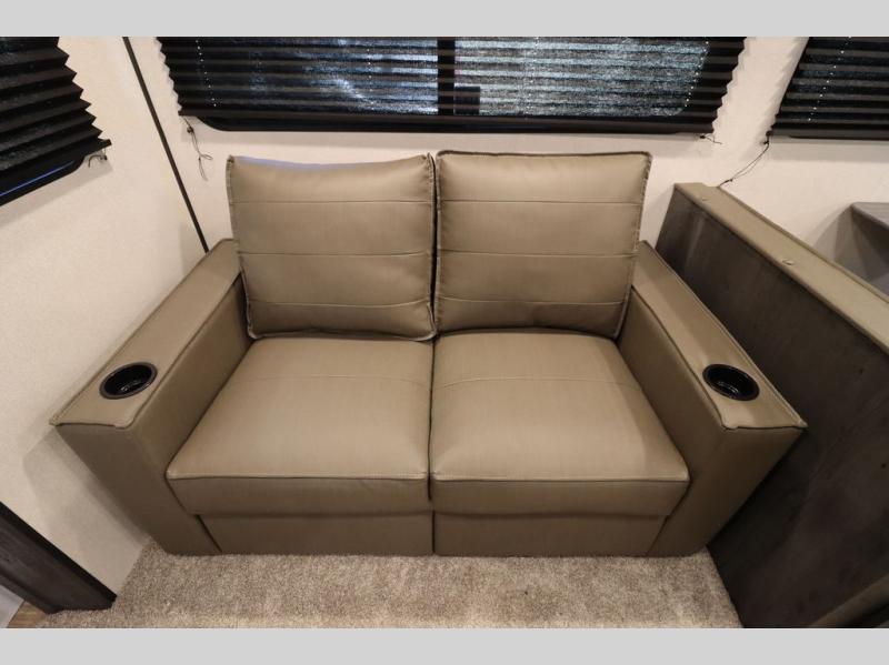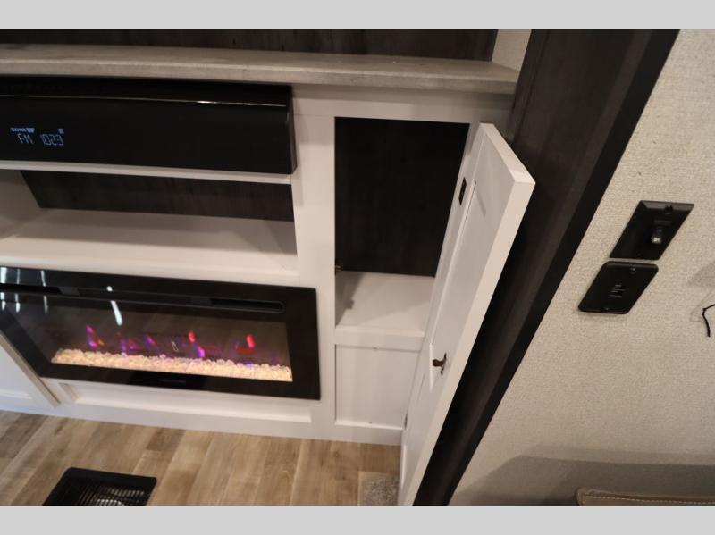 This Hideout destination trailer will serve as the perfect companion for all upcoming trips! It allows you to have separate sleeping spaces with the master suite and the private bunkhouse. The bunkhouse includes a slide out with a 32" x 74" upper bunk and a lower cube bunk. There is also a desktop, so you can use this space as an office if needed. The main living area is a comfortable place to relax with the lounge chair, booth dinette, and optional tri-fold sleeper sofa. There is also a 50" HDTV and fireplace to make the living area even more attractive. You'll get quite a lot of use out of the front kitchen which features a pantry, residential refrigerator, three-burner range, and overhead cabinets.