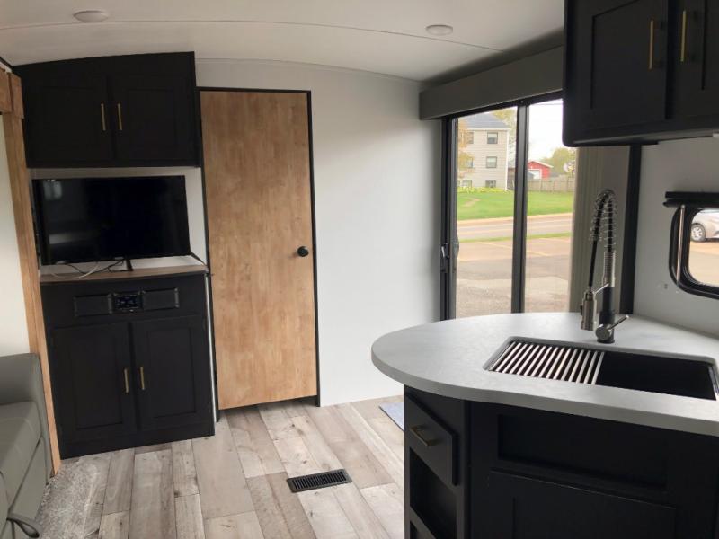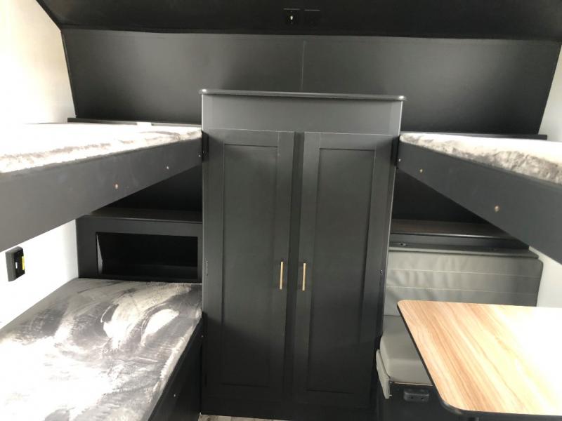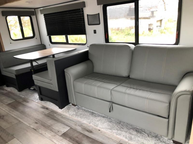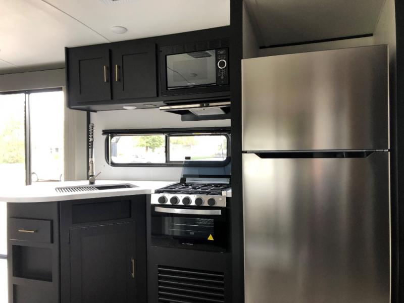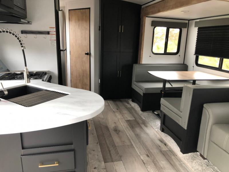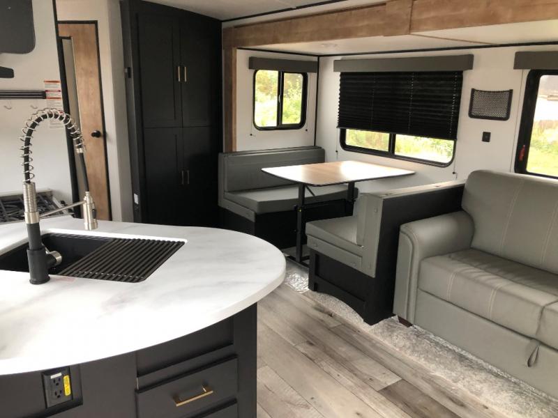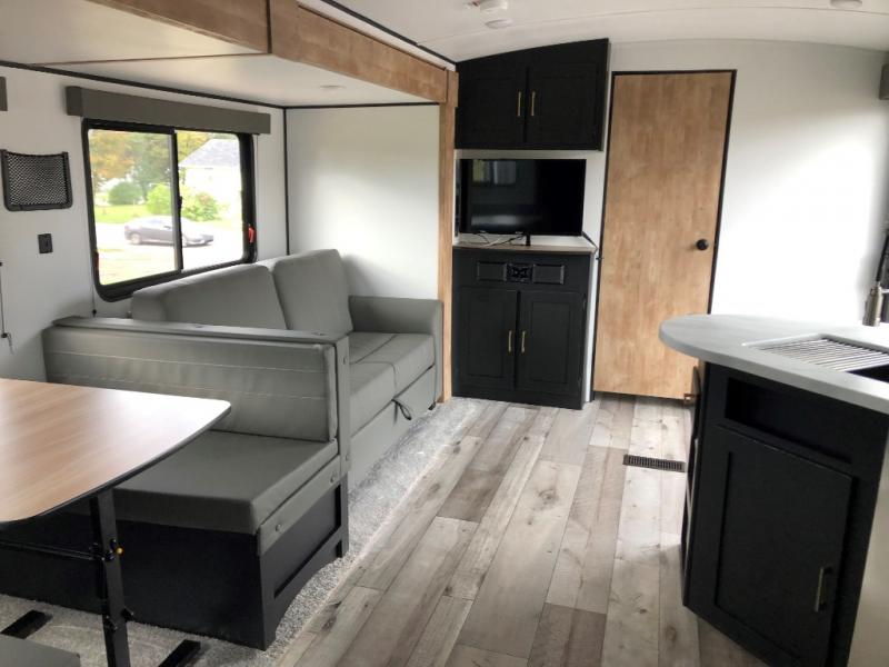 This spacious Keystone Springdale destination trailer offers a larger family or group of friends many comforts of home with sleeping for nine found between the bedding and furniture! Your kids or friends will love the front bunkhouse with triple bunks and a kids dinette, and everyone will appreciate the double slides for added space, plus the double entry doors to promote a smooth flow of traffic in and out the main living area and the rear bedroom. And the kitchen offers all that you need to prepare and cook for your hungry crew while camping. There is a large kitchen sink making clean-up easy, a three-burner range for cooking, a residential refrigerator for lots of perishable items, and two pantries for dry and canned good storage.
