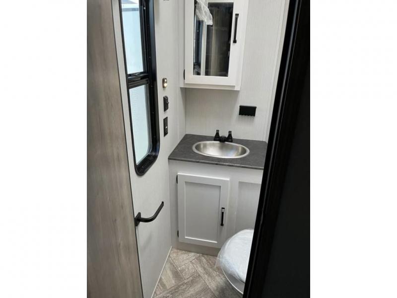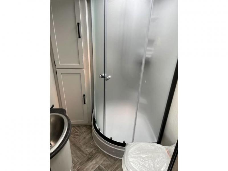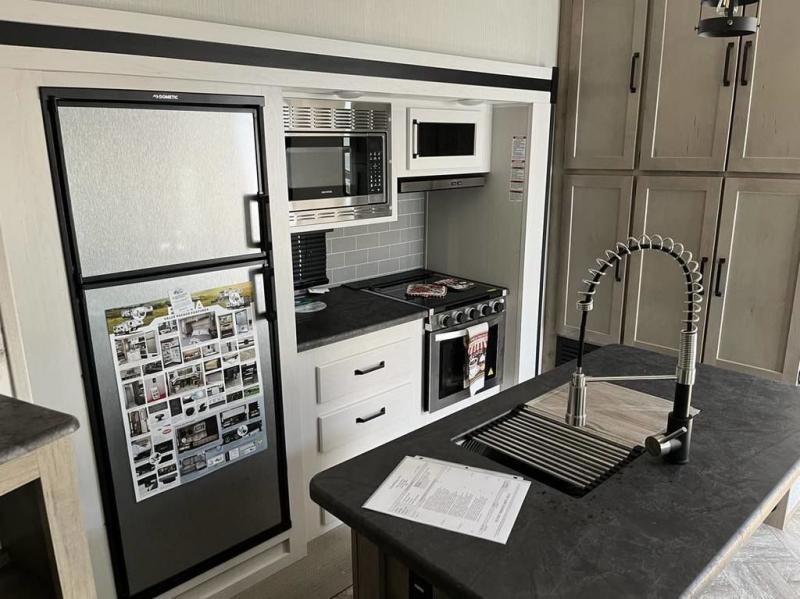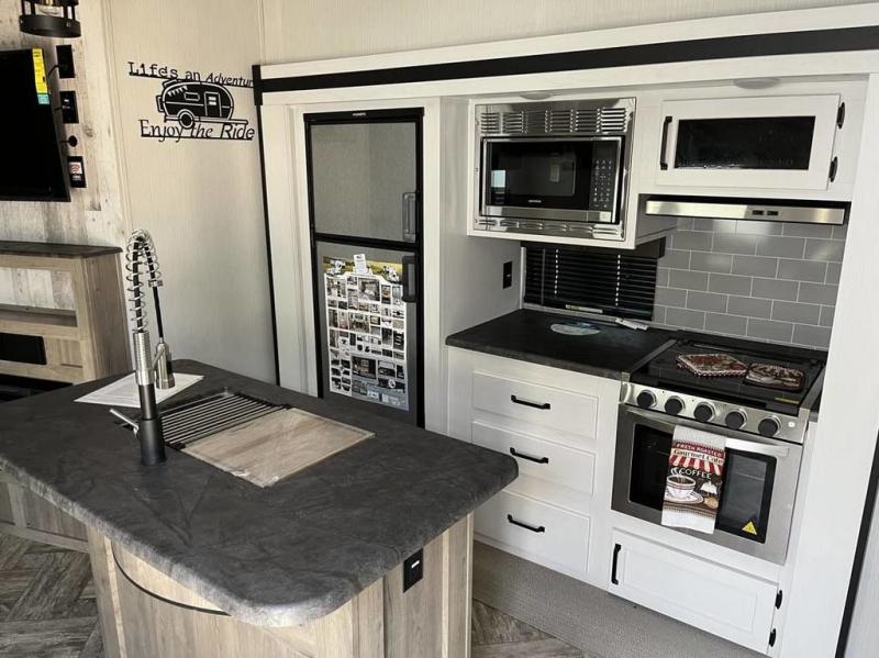 You're going to love camping in this toy hauler, whether you're at the lake or in the mountains. The separate garage features a 13' 1" cargo area, an optional queen bed electric lift, plus a half bath for guests. The chef of your group will have a kitchen island for extra counter space, and everyone can gather around the U-shaped dinette for dinner and game night. If you're not needing the extra sleeping space provided by the dinette, just choose the optional reclining sofa for even more comfort! A front private bedroom with a queen bed will give you your own space, plus the full bath is close by for convenience.