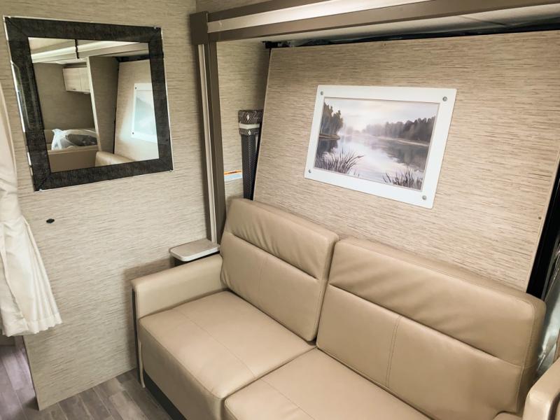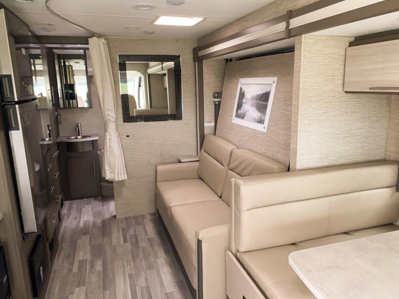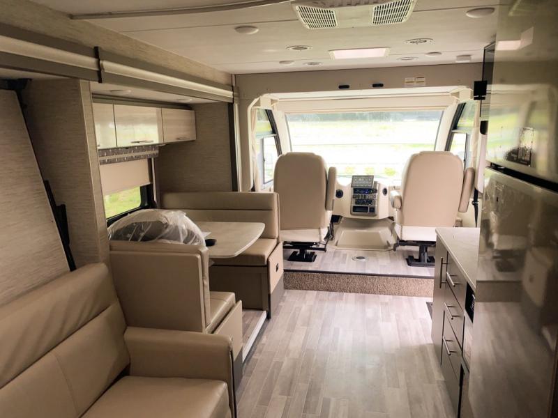 With any Axis RUV Class A gas motorhome by Thor Motor Coach you will enjoy added technology features to make each trip enjoyable, like the RapidCamp+ multiplex lighting and systems control and the Winegard ConnecT 2.0 Wi-Fi/4G/TV antenna. Each model features heated and remote exterior mirrors with integrated side view cameras, reclining and swivel leatherette captain's chairs, and a dash workstation with 110-volt and 12-volt outlets to get some work done if needed. Relaxing after a long day of traveling will be easy with the leatherette furniture, the Euro-style cabinet doors, and 82" interior ceiling height. The HD-MAX exterior with graphics package and black frameless windows provide a sleek look you are sure to love, and don't overlook the power awning with integrated LED lighting and lighted rotocast storage compartments for all your gear.
