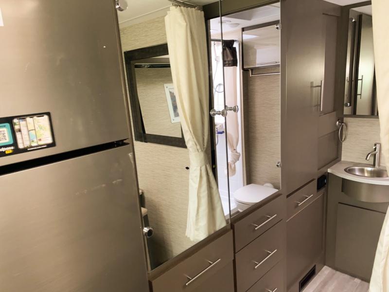 See new sights in this Class a gas motorhome that can sleep four to five people. Once you arrive at the campground, put out the full-wall slide to enjoy added space indoors, and you may want to play a game at the 75" booth dinette with cupholders. There is a 32" TV in the living area if you want to visit on the sofa, or you can set up the queen-size Murphy bed if you need a rest. The little ones are sure to love the power drop-down hideaway overhead bunk with a Cotton Cloud mattress and a bunk ladder for convenience. This model also includes a two burner gas cooktop and a convection microwave oven to prepare home cooked meals, plus there is a full rear bath on board to stay clean throughout your trip!