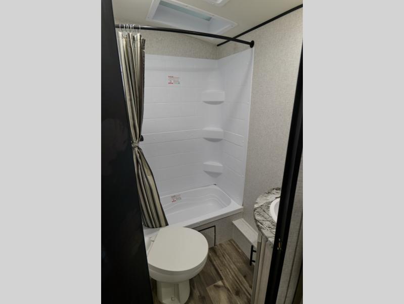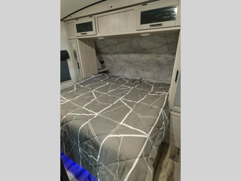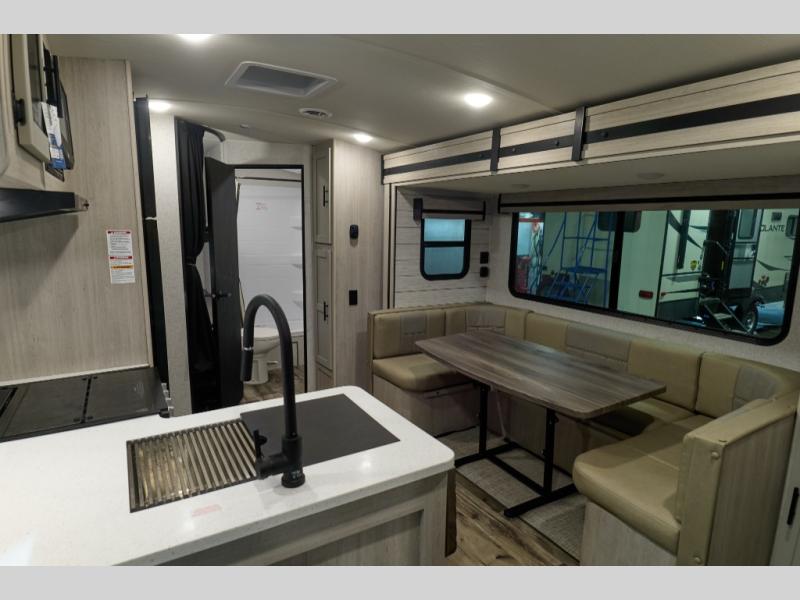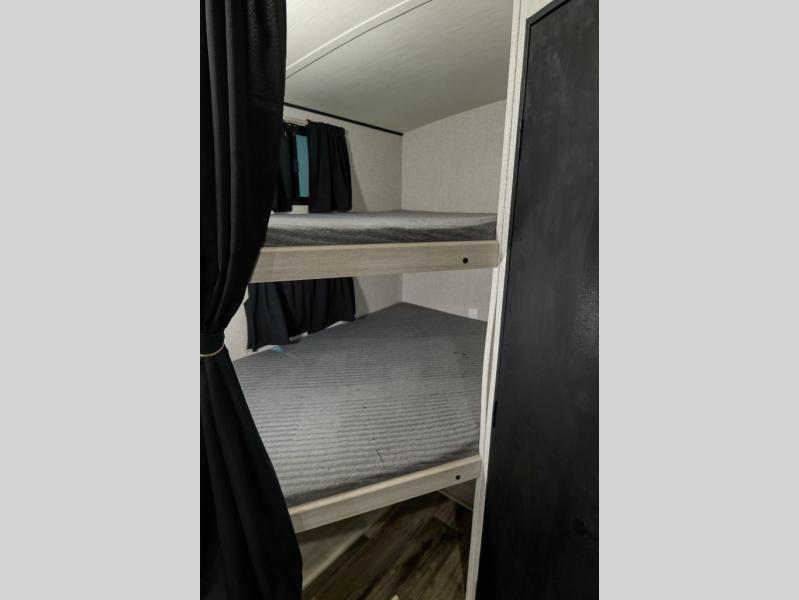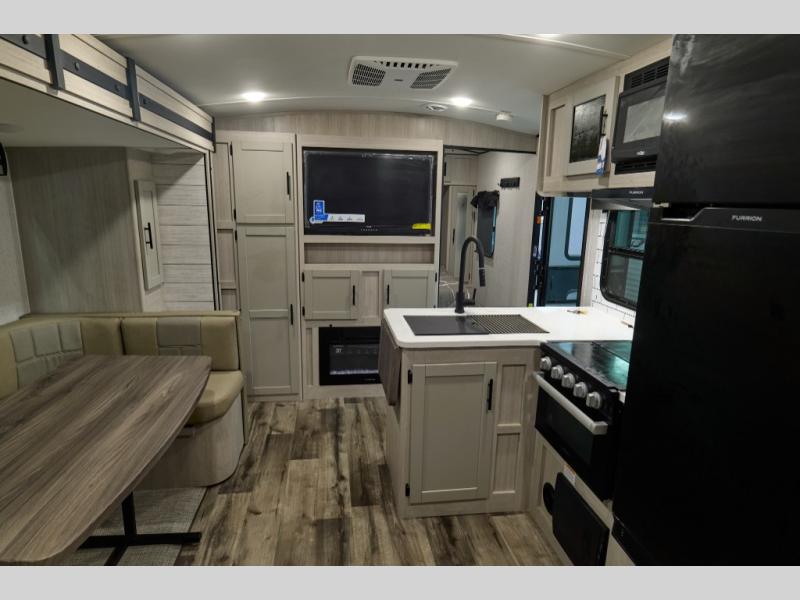 From the front private bedroom with a king bed and a slide out, to the rear corner bath and double-size bunks, you will love everything about this travel trailer. When you wake up in the morning you can prepare breakfast on the exterior camp kitchen, and if it's raining outside, the glass top range indoors will get the job done. There is also a stainless steel microwave for quick meals, and the wardrobe/pantry can store paper goods and the kids' cereal. Play a game of cards around the U-shaped dinette before heading off to bed in the front private bedroom!