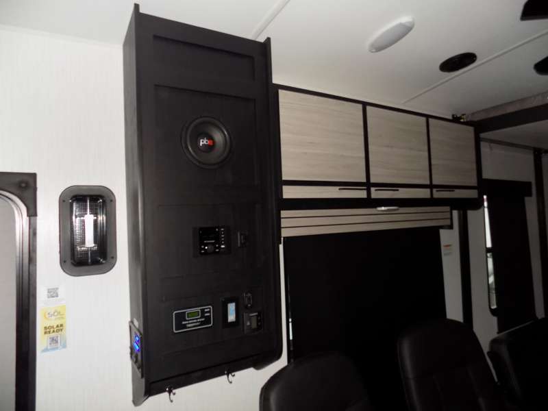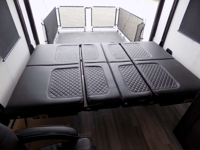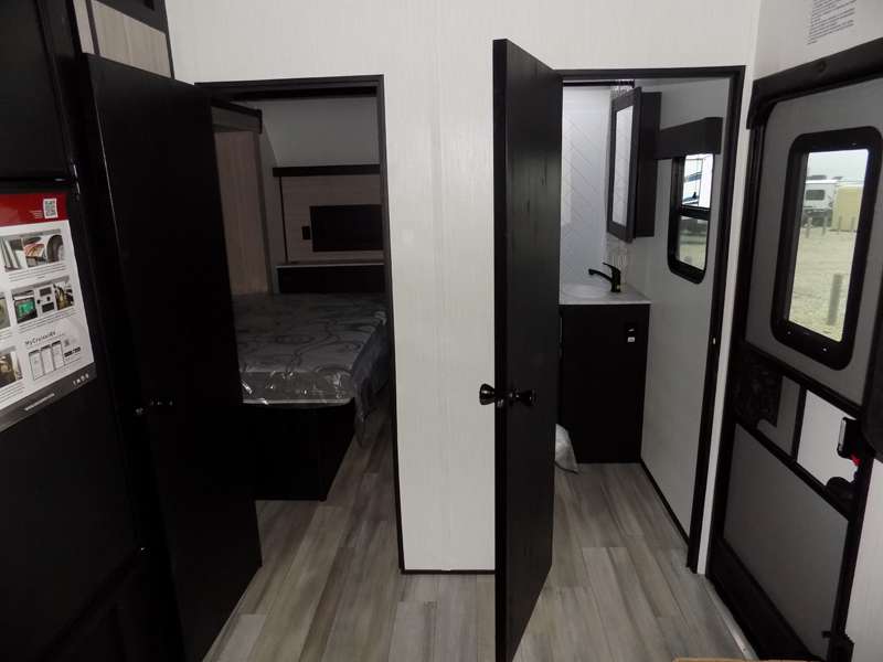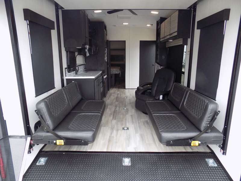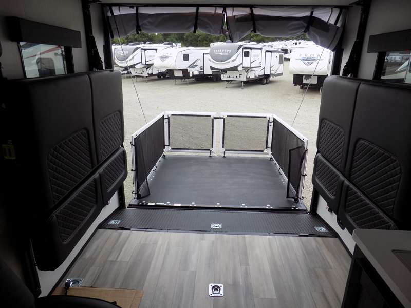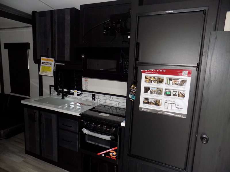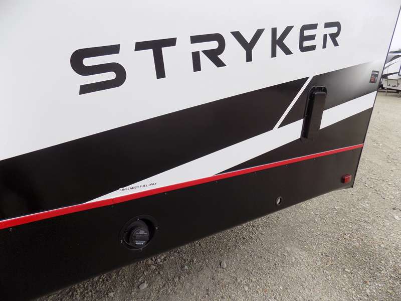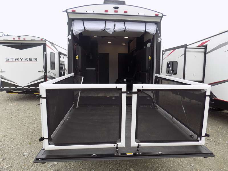 Each Stryker toy hauler travel trailer by Cruiser starts with a powder coated structural steel I-beam frame, Azdel composite laminated sidewalls, and a 102" wide body, perfect for your side-by-side, dirt bikes, or kayaks! The EZ flex rubberized suspension provides smooth towing on tougher roads, and the painted molded fiberglass front cap not only looks sleek, but provides better protection. Inside, you'll find barreled ceilings up to 98" in height, hardwood cabinet doors, solid surface kitchen cabinets, and numerous USB ports and 110V outlets. The removable carpet in the garage will create an open concept you are sure to love, and the industry-first pet palace under the bed will allow you to bring your loyal furry friends along. There's so much more to love about the Stryker toy haulers, like the premium sound system, the large windows, tons of storage space, and the list goes on!