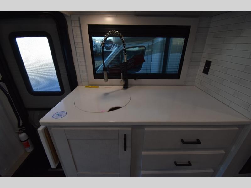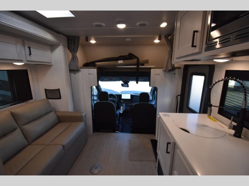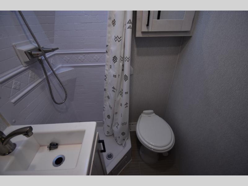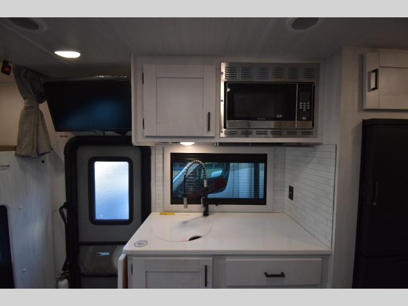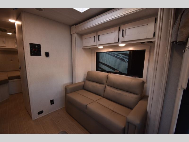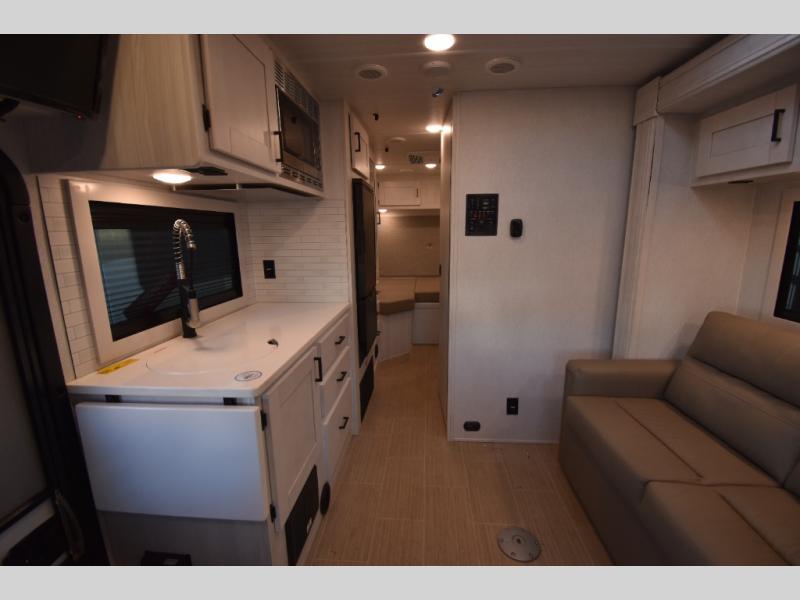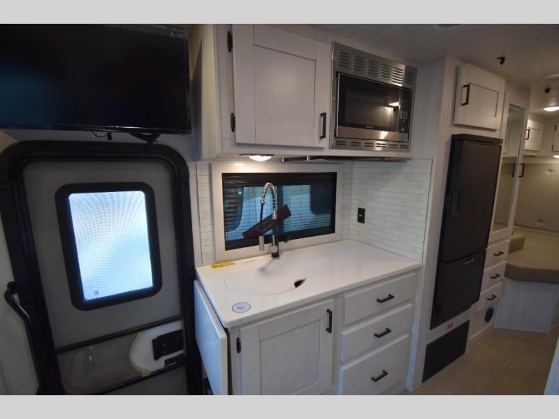 Whether you are traveling to your favorite campground or across the country, you are going to love this motorhome. You will have versatility in this coach to travel with a friend or your sweetheart with two twin beds that can easily convert to a king bed if you like. Each bed is 36" x 73" with a nightstand between and overhead storage along both sides and across the rear of the unit providing plenty of space for your things. There is also a wardrobe off the foot of the twin that is on the curbside. For relaxing and dining a slide out sofa with removeable table, and more overhead storage here. The kitchen is opposite the slide on the door side and features a round hidden sink with solid surface cover for added prep space, a 12-volt refrigerator for your perishables, and a microwave oven and induction cooktop for easy meals as you travel. When you want to get cleaned up, a bath with an angled shower, toilet, and lav sink, plus medicine cabinet for your toothbrush and razor. The doors both open out so you can actually create a more open space when in the bathroom making it the width of the unit.