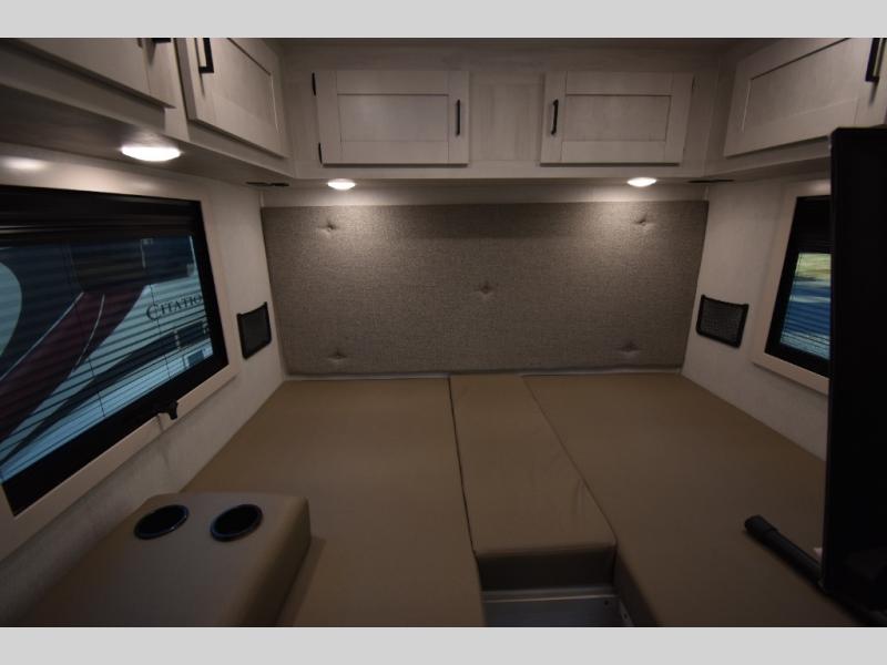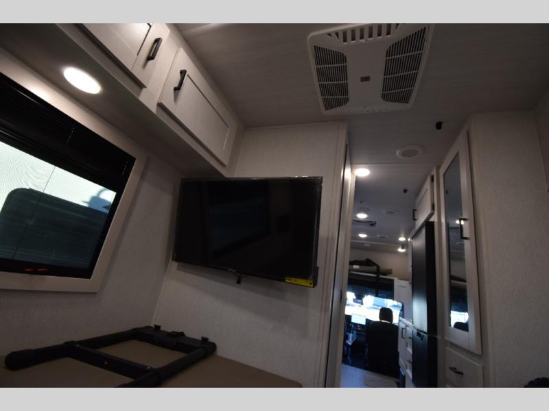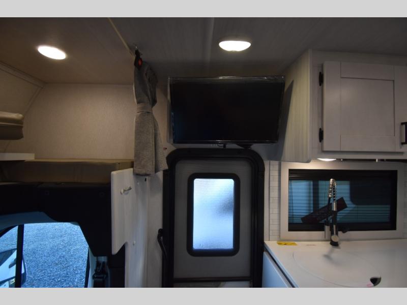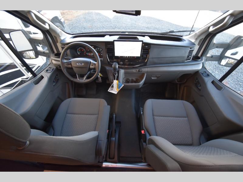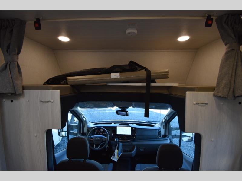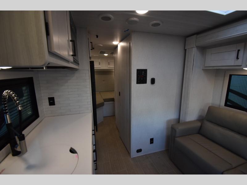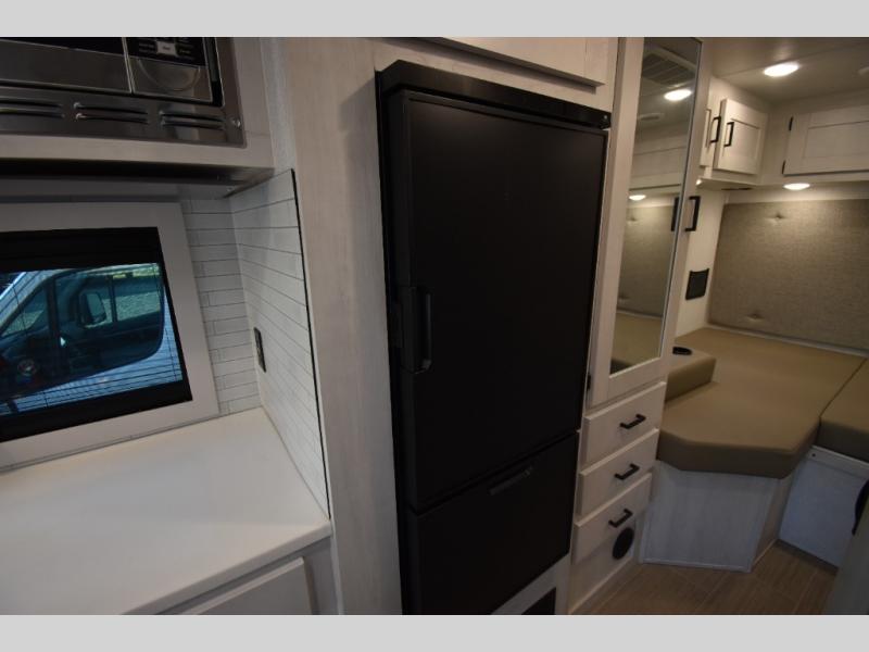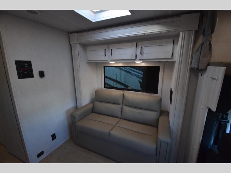 Whether you are traveling to your favorite campground or across the country, you are going to love this motorhome. You will have versatility in this coach to travel with a friend or your sweetheart with two twin beds that can easily convert to a king bed if you like. Each bed is 36" x 73" with a nightstand between and overhead storage along both sides and across the rear of the unit providing plenty of space for your things. There is also a wardrobe off the foot of the twin that is on the curbside. For relaxing and dining a slide out sofa with removeable table, and more overhead storage here. The kitchen is opposite the slide on the door side and features a round hidden sink with solid surface cover for added prep space, a 12-volt refrigerator for your perishables, and a microwave oven and induction cooktop for easy meals as you travel. When you want to get cleaned up, a bath with an angled shower, toilet, and lav sink, plus medicine cabinet for your toothbrush and razor. The doors both open out so you can actually create a more open space when in the bathroom making it the width of the unit.