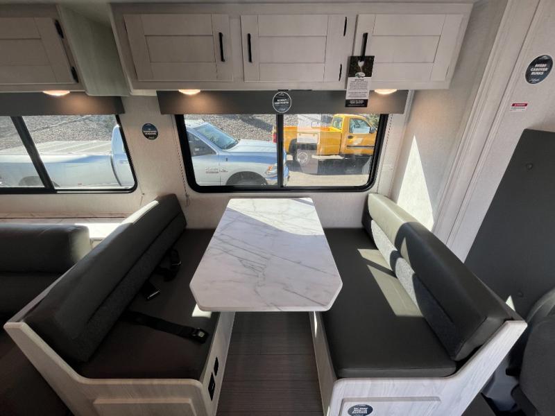 With any Entrada Class C gas motorhome from EAST TO WEST, the construction consists of a completely laminated coach, a one-piece molded fiberglass front cap, 2" thick sidewalls with Azdel composite exterior, a Dicor Diflex ll TPO roof, and integrated entry step. Some of the Entrada value package features include 12V tank heaters to camp during the cooler months, the Winegard Air 360+, plus backup and sideview cameras with monitor for safety on and off the road. The interior offers a 7-foot interior height for a spacious feel, and hardwood shaker style cabinets. Choose an Entrada for its tasteful design, attention to detail, bright interior and/or affordable price-point!