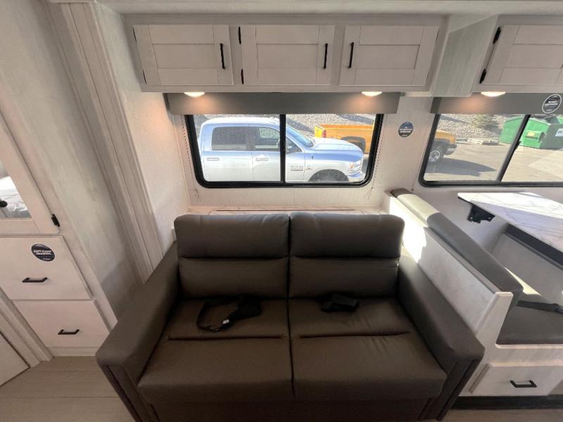 You can explore and discover so many new destinations with this Entrada Class C gas motorhome! The first thing that you'll notice about this coach is that it has extra interior living space because of the two slides. One of those slides holds the queen-size bed back in the private bedroom, and the bedroom is sectioned off from the rest of the coach with an accordion door. The full bathroom is right next to the bedroom so that you can quickly and effortlessly hop in the shower each morning. Outside of the bathroom, you'll find a linen closet which can hold your towels or toiletries, and the kitchen pantry can hold your snacks. This coach even has an LED TV for inside entertainment, so you can sit back on the sofa or booth dinette and watch with pleasure.