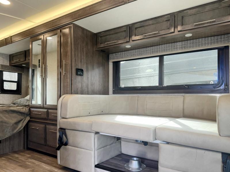 With any Qwest SE Class C diesel motorhome by Entegra Coach, you will enjoy a safe and enjoyable trip each time you take to the road! Each model sits on a durable Mercedes-Benz 3500 chassis with a 170 in. wheelbase and a 9-speed automatic transmission for an overall better driving experience. There is a one-piece, seamless fiberglass front cap to combat leaks, and the TuffShell construction will hold up over time. The driver will appreciate the 7" integrated Mercedes-Benz MBUX infotainment center that includes GPS, Apple CarPlay and Android Auto so they can navigate the road like a pro, plus there are backup and side-view cameras for easy parking. You will also appreciate an exterior utility center, an outside shower, electric stabilizer jacks, and many more exterior conveniences. Head inside to find LED-lit pressed countertops, decorative kitchen backsplash, pleated blackout shades for added privacy, and high-intensity LED ceiling lights to keep your space bright and open.