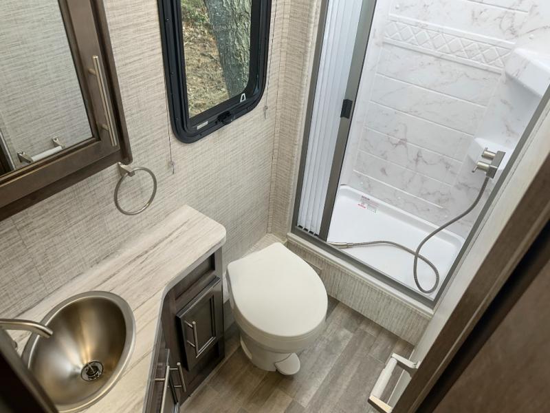 Pack your bags and head to your favorite camping destination in this cozy coach! You can sleep four to six between the RV queen bed, U-shaped dinette, and overhead bunk with a 750 lb. capacity. And if you don't need the extra sleeping space, just choose the entertainment center with overhead storage option in place of the bunk, and the theater seating option in place of the dinette! You can prepare meals each day on the two burner drop-in cooktop or in the convection microwave, and there is a 10 cu. ft. 12V refrigerator for perishables. A full bath, complete with a foot flush toilet, powered roof vent, and shower skylight will let you stay clean throughout each trip. You will also find plenty of storage space, including a wardrobe by the bed, a pantry, plus overhead cabinets!