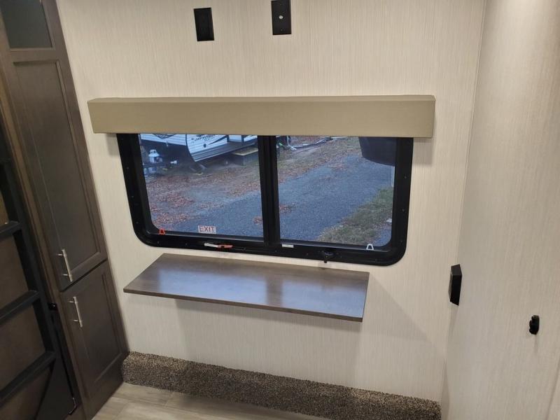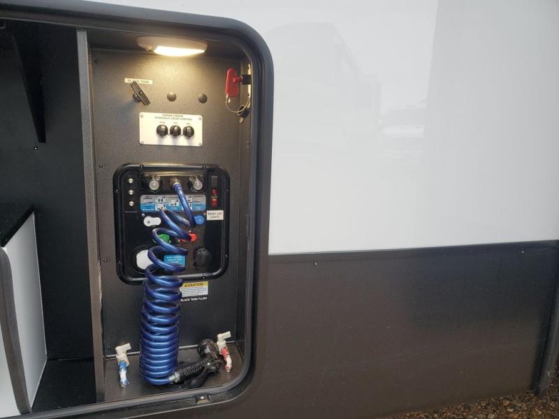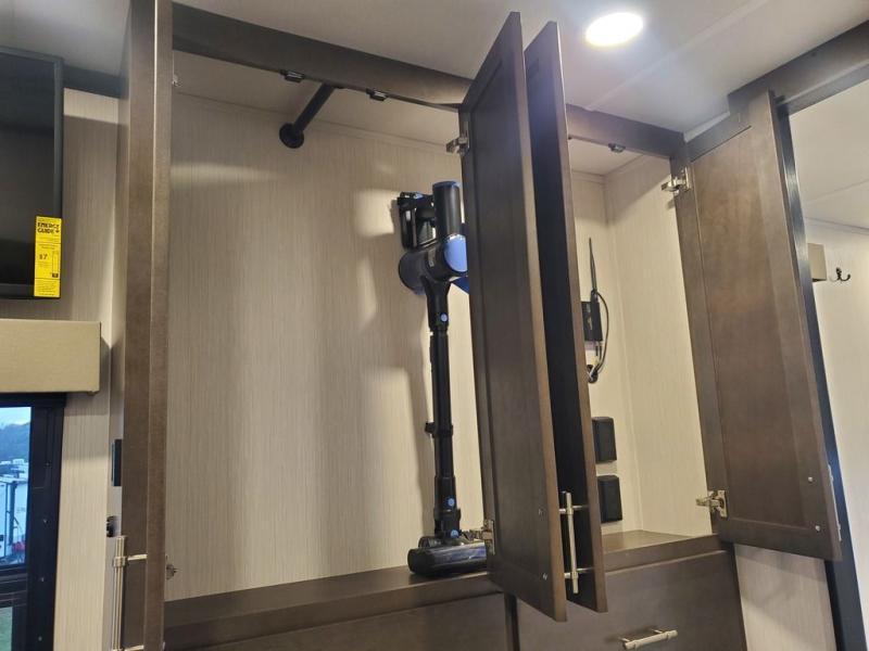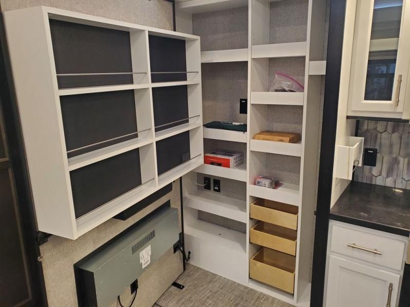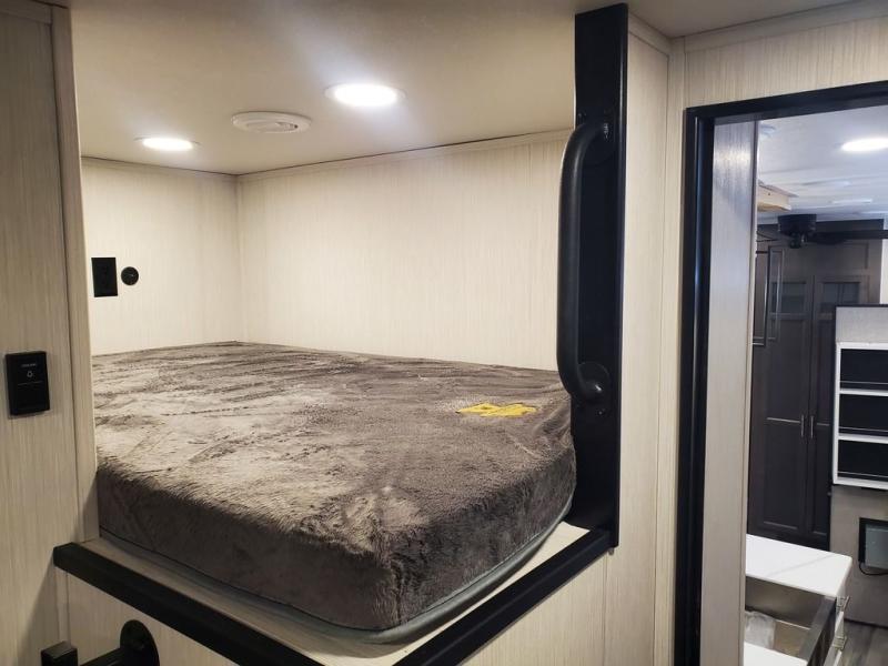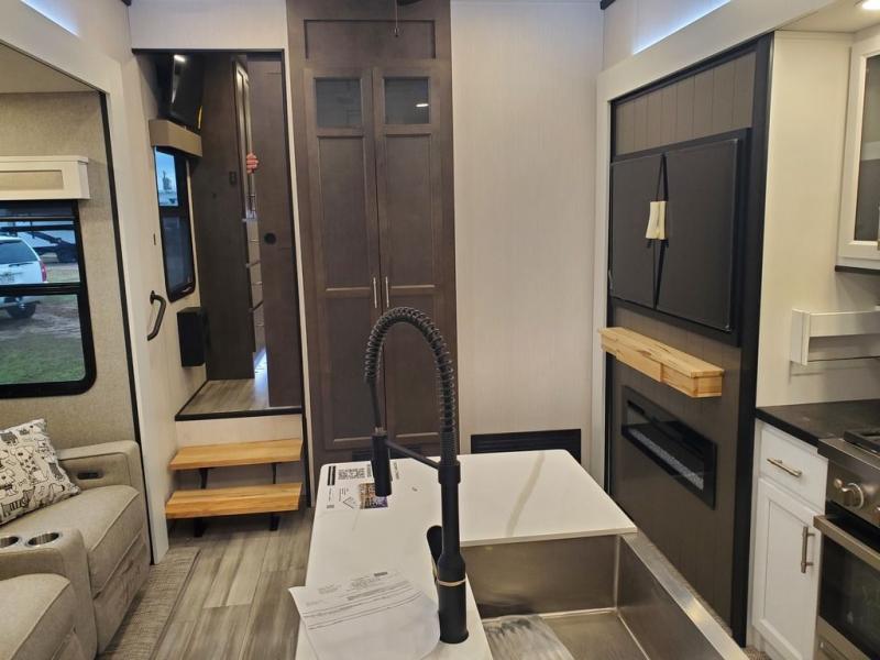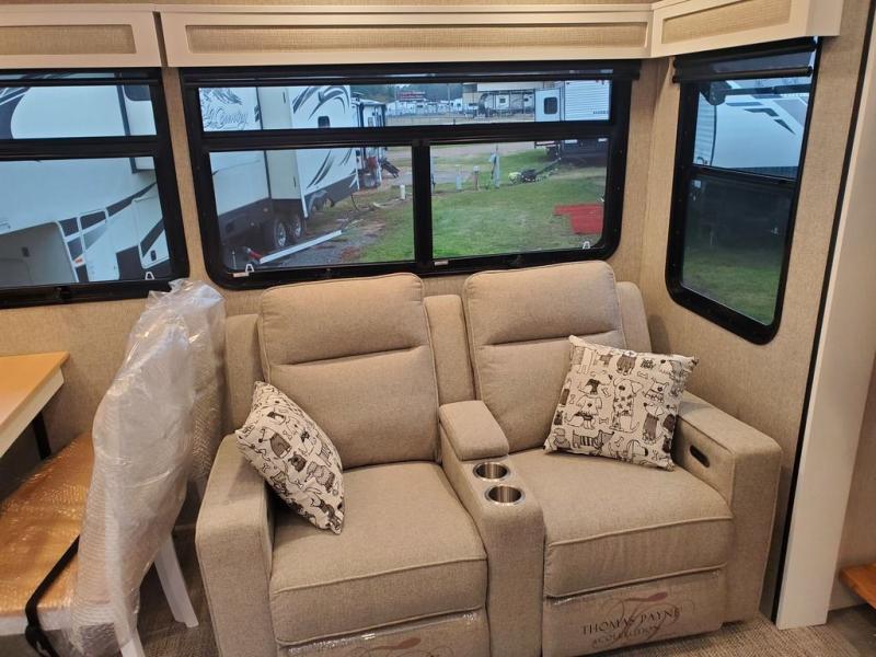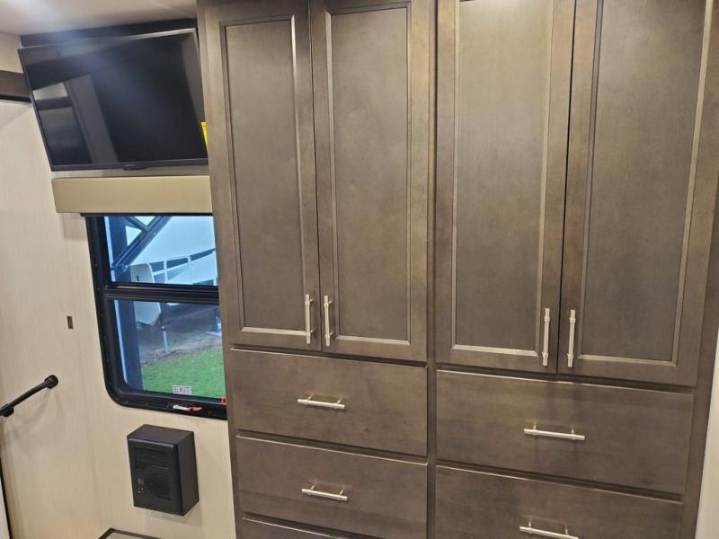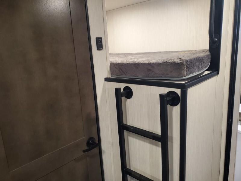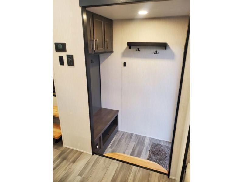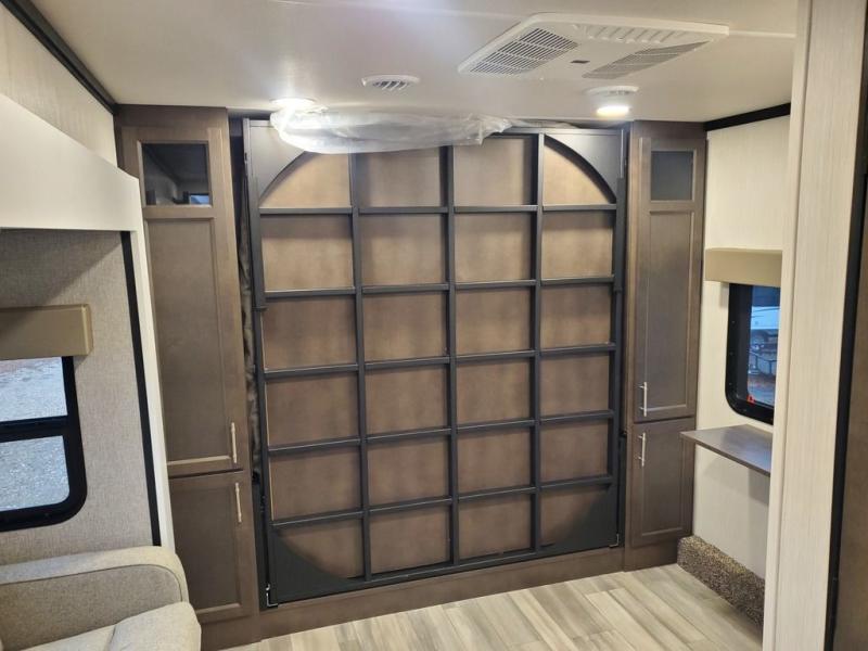 You won't believe all this fifth wheel has to offer! There is a convenient mud room right as you enter the unit where you can use the bench to take your shoes off and not drag dirt in the living areas. The front bedroom includes a jackknife sofa slide out, a half bath, plus a Murphy bed with a desk below so this room can be used as a guest room or office! And the loft access is in this room to house more guests or use as storage space. Your crew will love to meet in the middle combined kitchen and living area with power theater seats, a wall mounted dining table with an extension and an ottoman, plus a kitchen island with a fold-down breakfast counter. There is also a Murphy pantry hidden behind the entertainment center and all the appliances needed to make meals each day. You will be met with comfort in the master bedroom that includes a king bed slide out, a dresser and a TV, plus a full rear bath with dual bath sinks. You will also find a shower with a seat, washer/dryer prep, and drop-down storage under the rear bedroom/bathroom so nothing gets left behind!