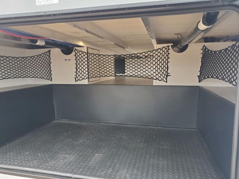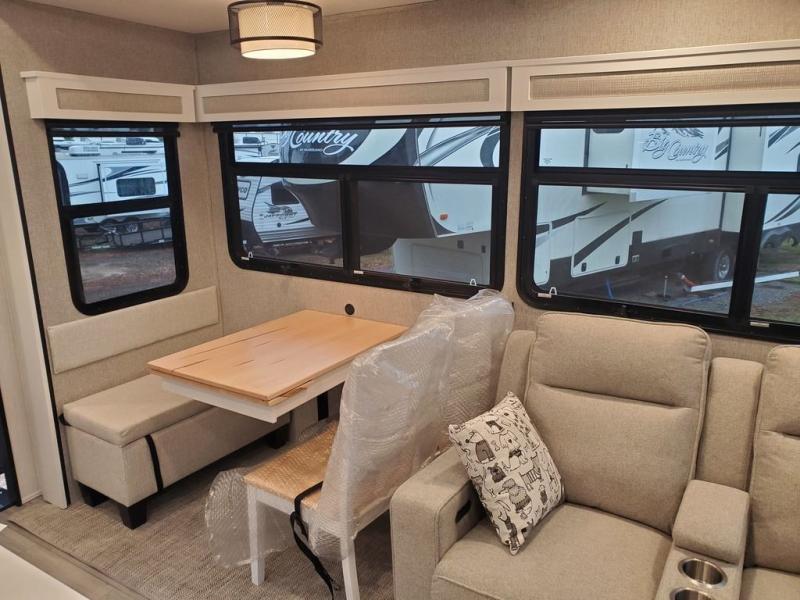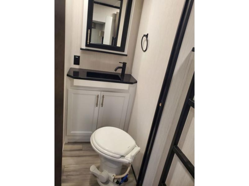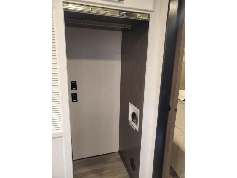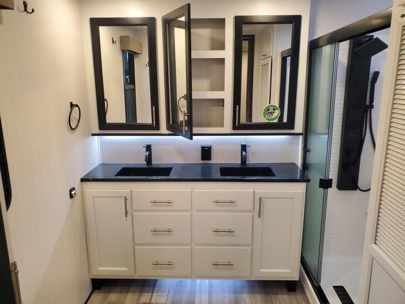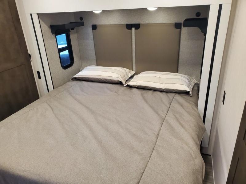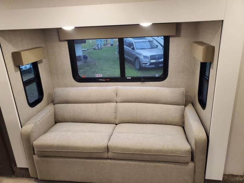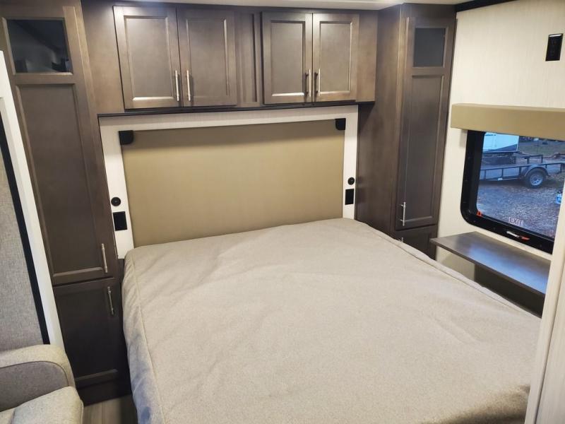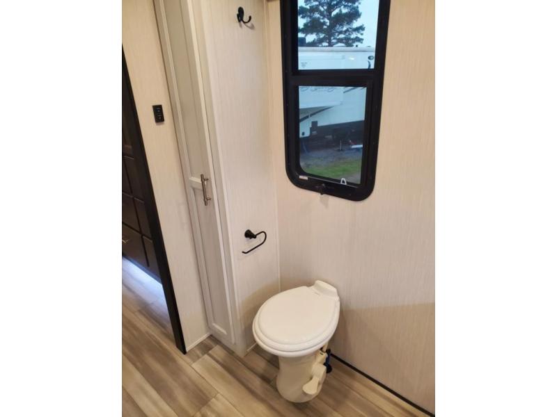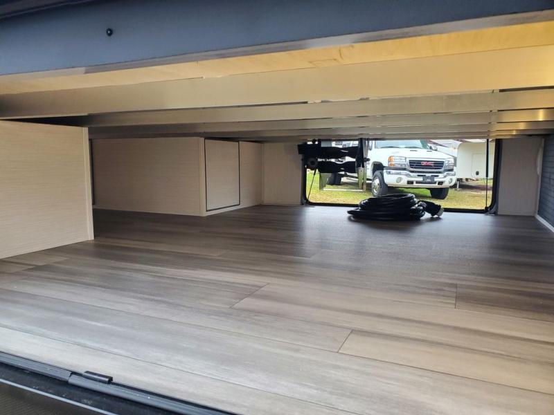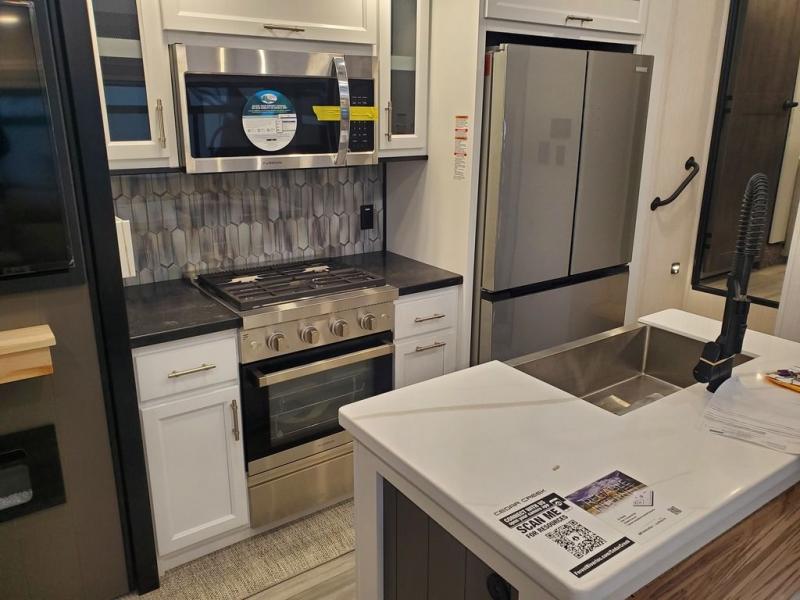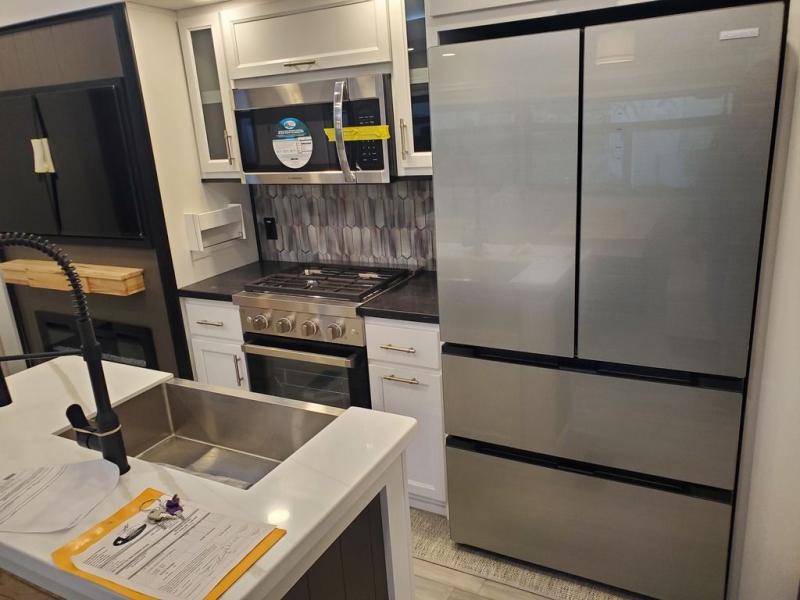 You won't believe all this fifth wheel has to offer! There is a convenient mud room right as you enter the unit where you can use the bench to take your shoes off and not drag dirt in the living areas. The front bedroom includes a jackknife sofa slide out, a half bath, plus a Murphy bed with a desk below so this room can be used as a guest room or office! And the loft access is in this room to house more guests or use as storage space. Your crew will love to meet in the middle combined kitchen and living area with power theater seats, a wall mounted dining table with an extension and an ottoman, plus a kitchen island with a fold-down breakfast counter. There is also a Murphy pantry hidden behind the entertainment center and all the appliances needed to make meals each day. You will be met with comfort in the master bedroom that includes a king bed slide out, a dresser and a TV, plus a full rear bath with dual bath sinks. You will also find a shower with a seat, washer/dryer prep, and drop-down storage under the rear bedroom/bathroom so nothing gets left behind!