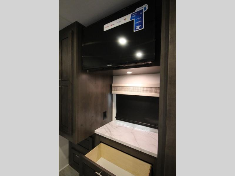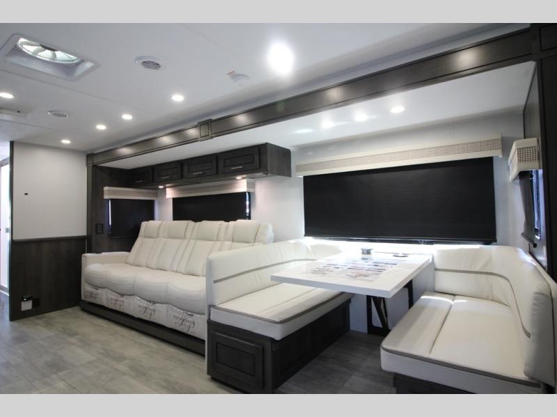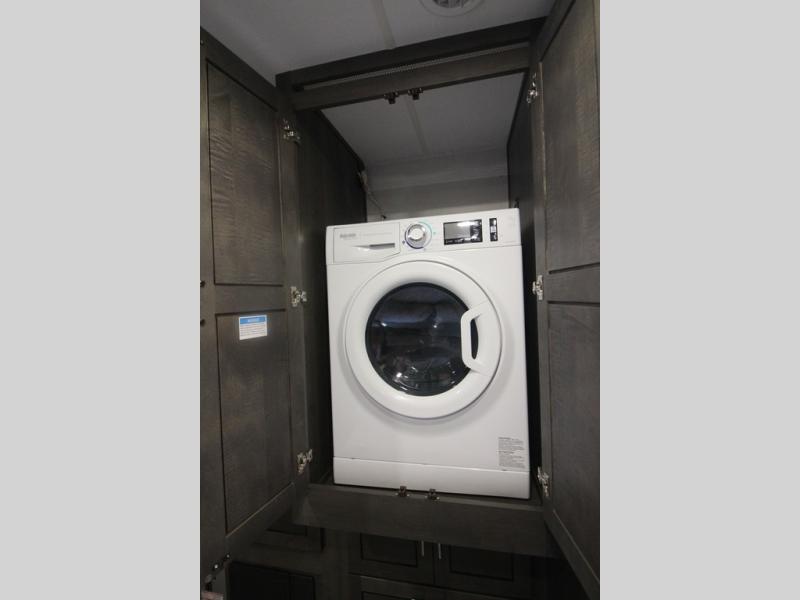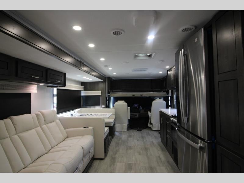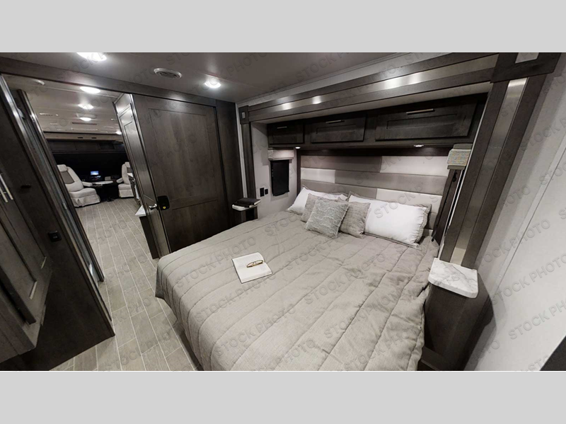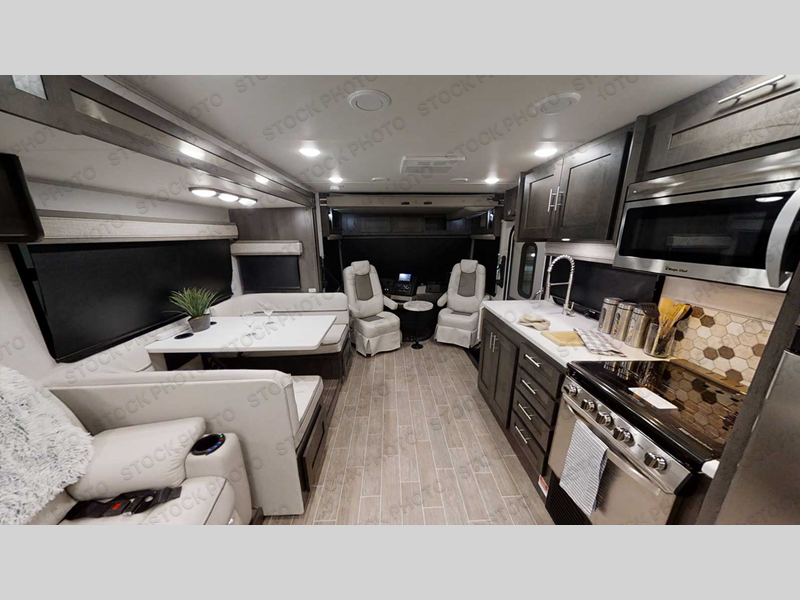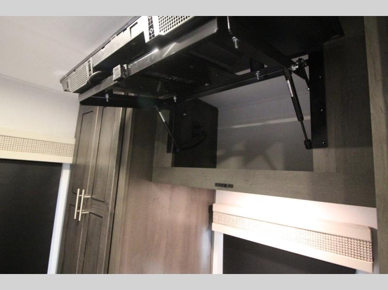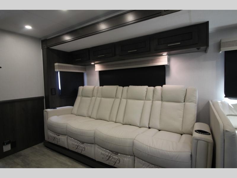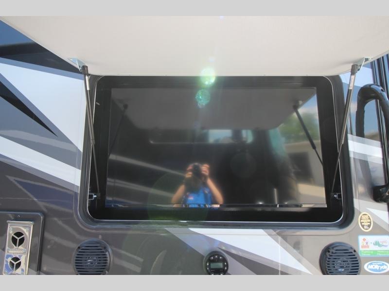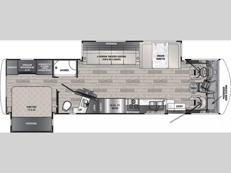You will love the spacious living entertainment in this motorhome! There is a Thomas Payne 4-person theater seating that reclines with adjustable headrests, heat, massage and has pop-up 110V outlets. There is also a 5,000 BTU fireplace with a 40" LED TV to watch your favorite movies in true comfort. The kitchen has everything you need to prepare your best home cooked meals including a brush nickel designer faucet with a pull out spray wand for easy clean up, and you can enjoy all of your meals at the Dream Dinette. You will appreciate having your own private retreat with the rear bedroom which has a 72" x 80" king bed slide across from a dresser with a 32" LED TV, a wardrobe on one side, and another wardrobe on the other with an optional combo washer and dryer. There is also a power front overhead bunk for more sleeping space!