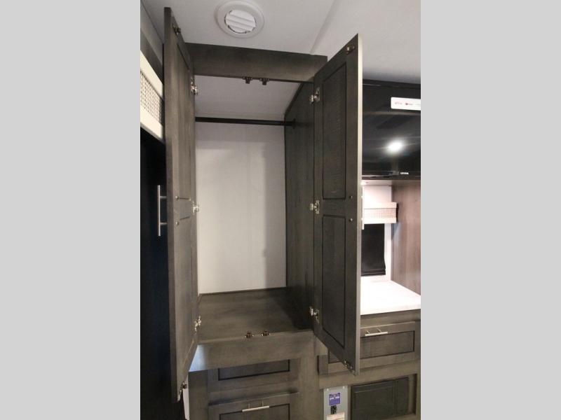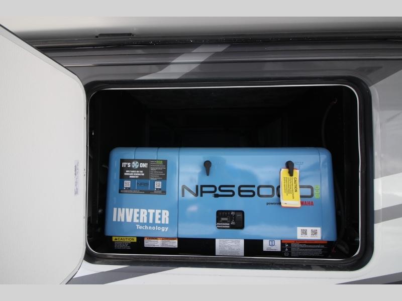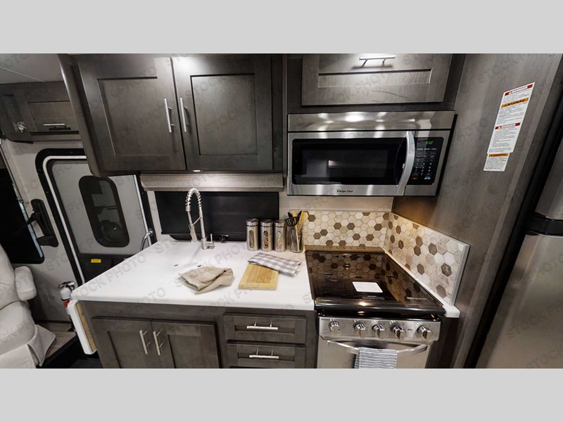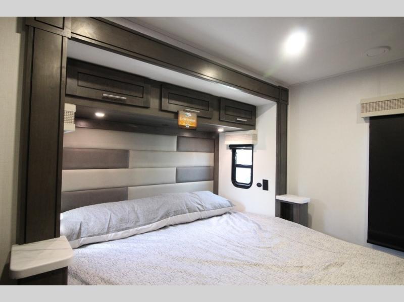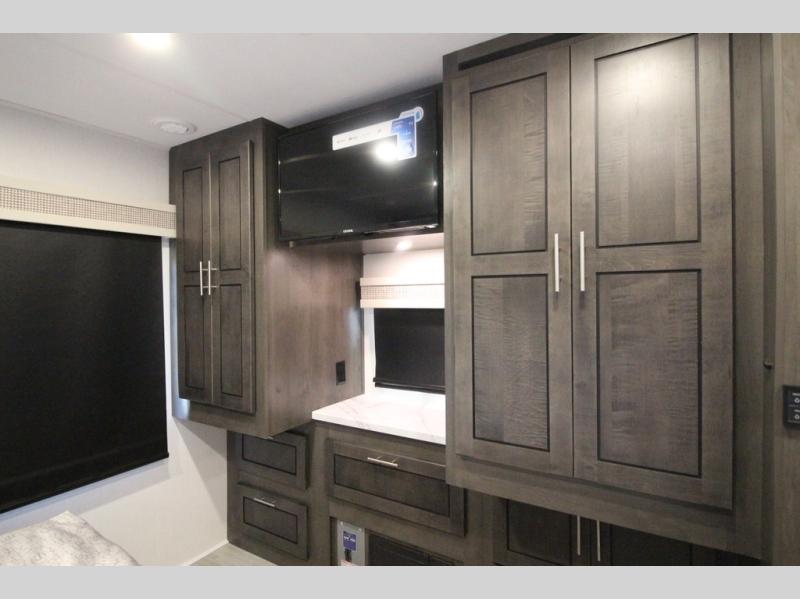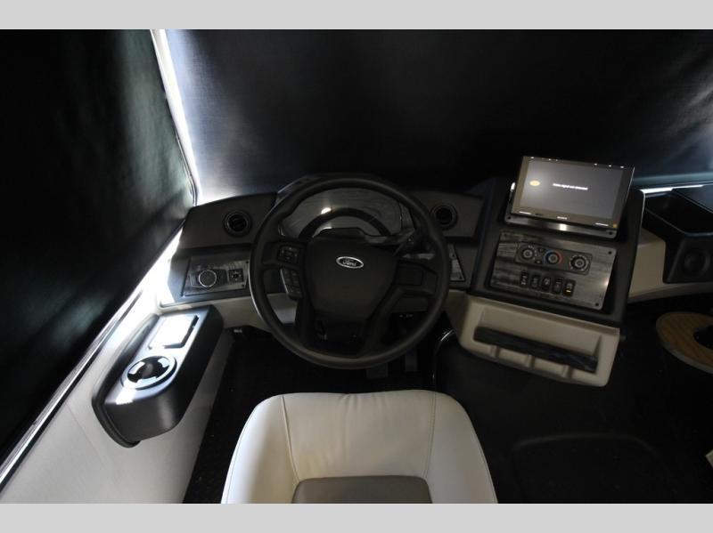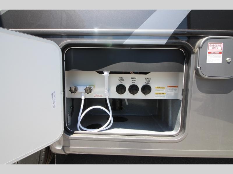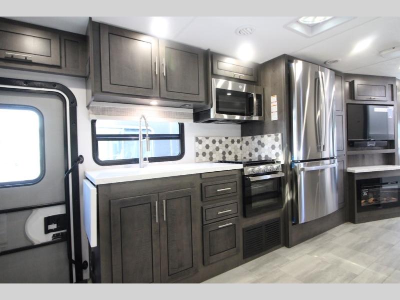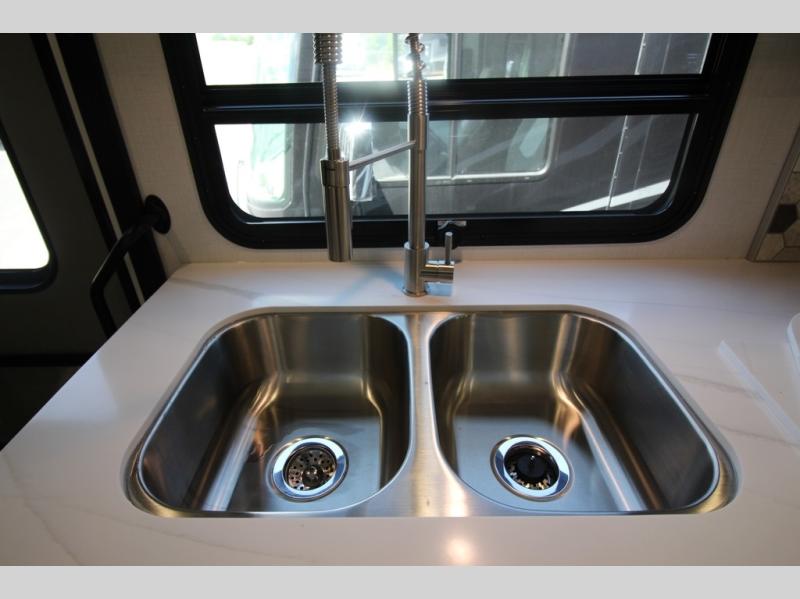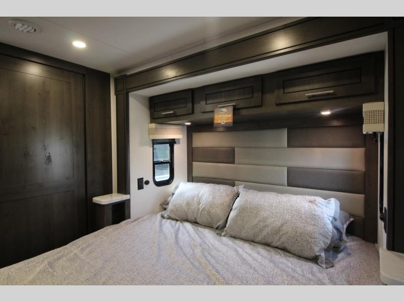 You will love the spacious living entertainment in this motorhome! There is a Thomas Payne 4-person theater seating that reclines with adjustable headrests, heat, massage and has pop-up 110V outlets. There is also a 5,000 BTU fireplace with a 40" LED TV to watch your favorite movies in true comfort. The kitchen has everything you need to prepare your best home cooked meals including a brush nickel designer faucet with a pull out spray wand for easy clean up, and you can enjoy all of your meals at the Dream Dinette. You will appreciate having your own private retreat with the rear bedroom which has a 72" x 80" king bed slide across from a dresser with a 32" LED TV, a wardrobe on one side, and another wardrobe on the other with an optional combo washer and dryer. There is also a power front overhead bunk for more sleeping space!