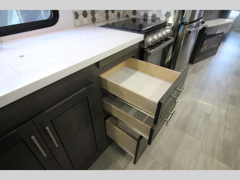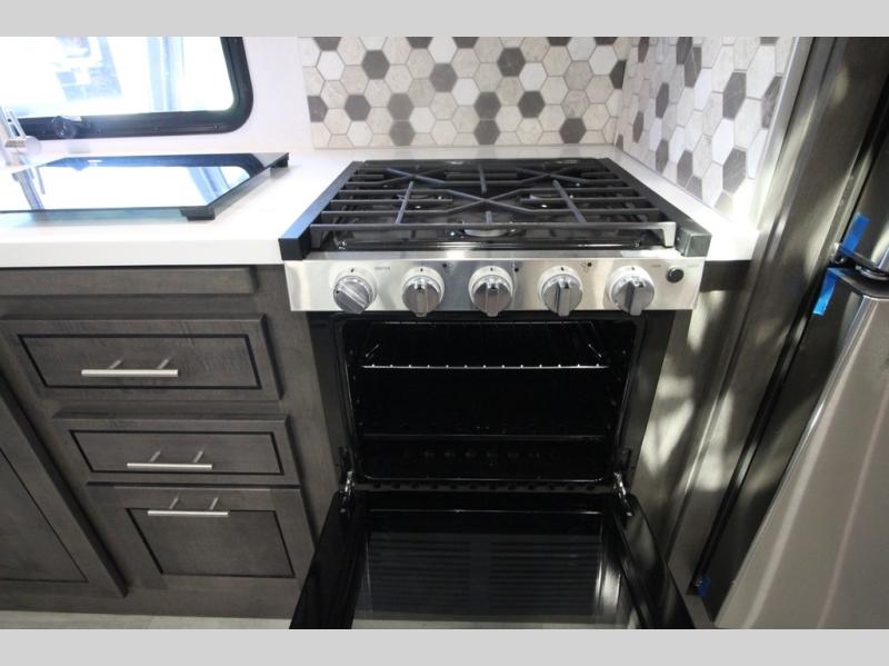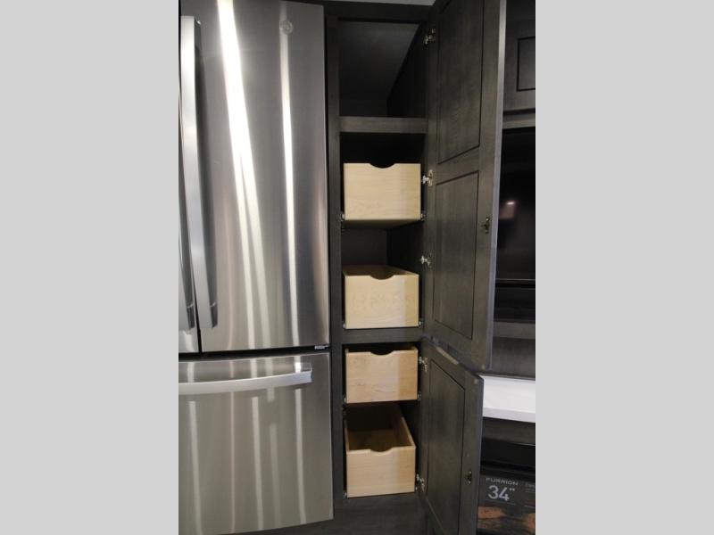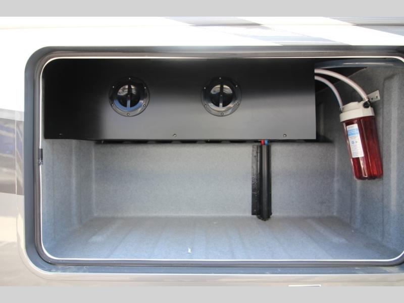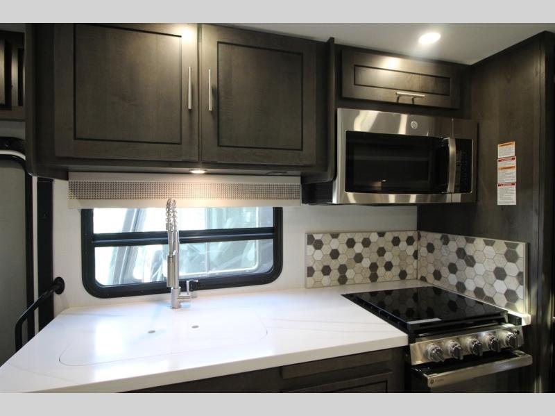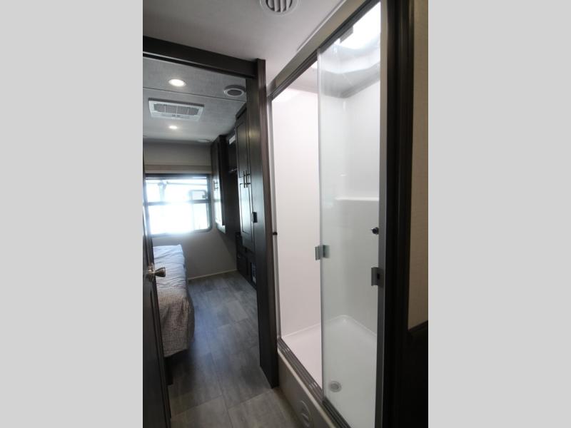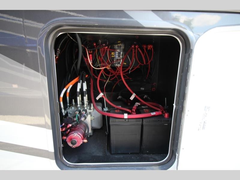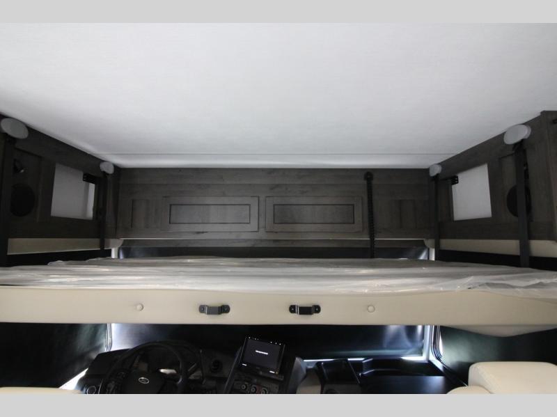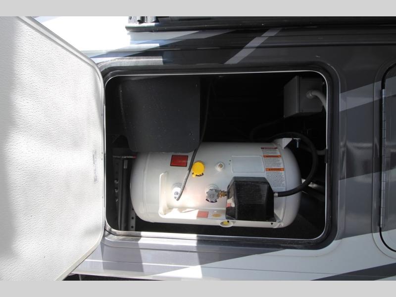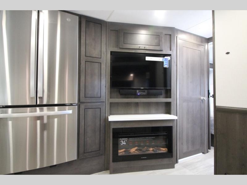 You will love the spacious living entertainment in this motorhome! There is a Thomas Payne 4-person theater seating that reclines with adjustable headrests, heat, massage and has pop-up 110V outlets. There is also a 5,000 BTU fireplace with a 40" LED TV to watch your favorite movies in true comfort. The kitchen has everything you need to prepare your best home cooked meals including a brush nickel designer faucet with a pull out spray wand for easy clean up, and you can enjoy all of your meals at the Dream Dinette. You will appreciate having your own private retreat with the rear bedroom which has a 72" x 80" king bed slide across from a dresser with a 32" LED TV, a wardrobe on one side, and another wardrobe on the other with an optional combo washer and dryer. There is also a power front overhead bunk for more sleeping space!