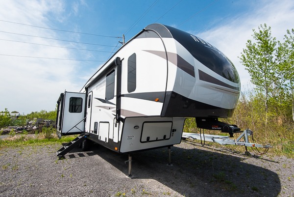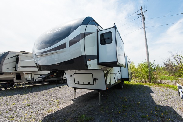 You'll be camping in style each time you take this fifth wheel out to the campground! The dual opposing slides in the main living area create an open floorplan, and the kitchen island here will provide more counter space to prep meals. You will love the theater seat directly across from the entertainment center and fireplace, and additional seating can be found on the hide-a-bed sofa or the booth and chairs. The full bath includes a shower with a seat, a skylight, plus a Maxxair ventilation fan to keep everything fresh. The front private bedroom may feel more like a resort with its king bed slide out, large wardrobe and shirt closet, plus a dresser to keep your clothes tidy. And did we mention this fifth wheel has two power awnings for maximum protection against the elements, and tons of exterior storage for all your gear!?