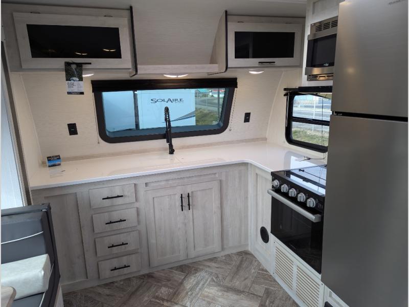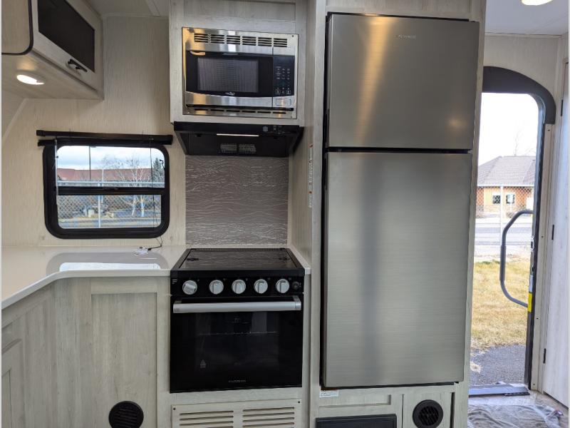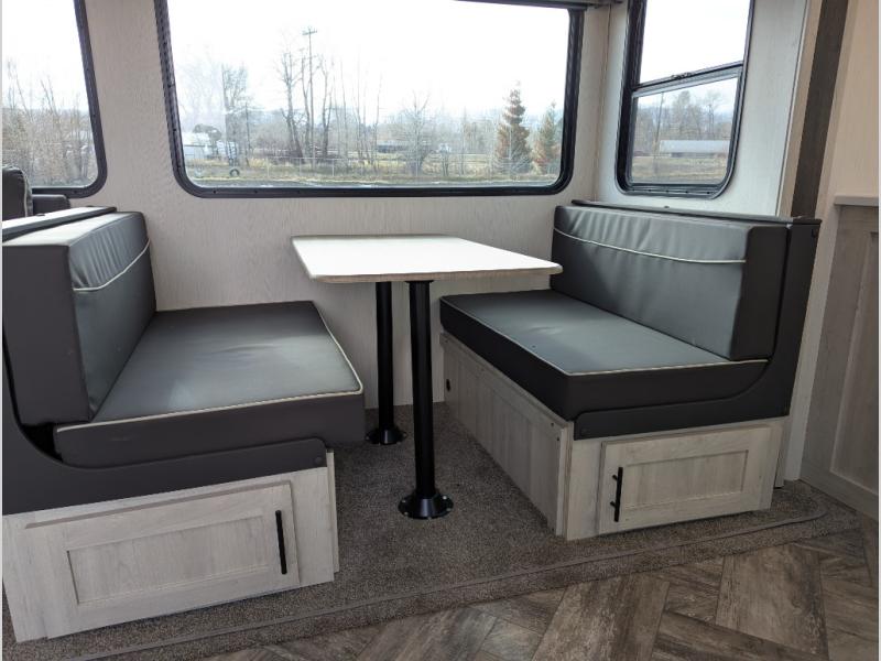 Wherever you decide to camp, you can be sure to have at-home comforts in this double slide out travel trailer. The front kitchen is any chef's dream with its large counter space, 12V refrigerator and large pantry, and the front windshield will provide great views as you cook. Your crew can relax on the tri-fold hide-a-bed sofa sleeper across from the LED HDTV, or play a game at the booth dinette with storage below. The dual entry bath will create a rear master bedroom you are sure to love. There is a Maxx king bed here, drawers for storage, plus a rear wardrobe with closets on either side. You'll even find the second entry door in this room for added convenience!