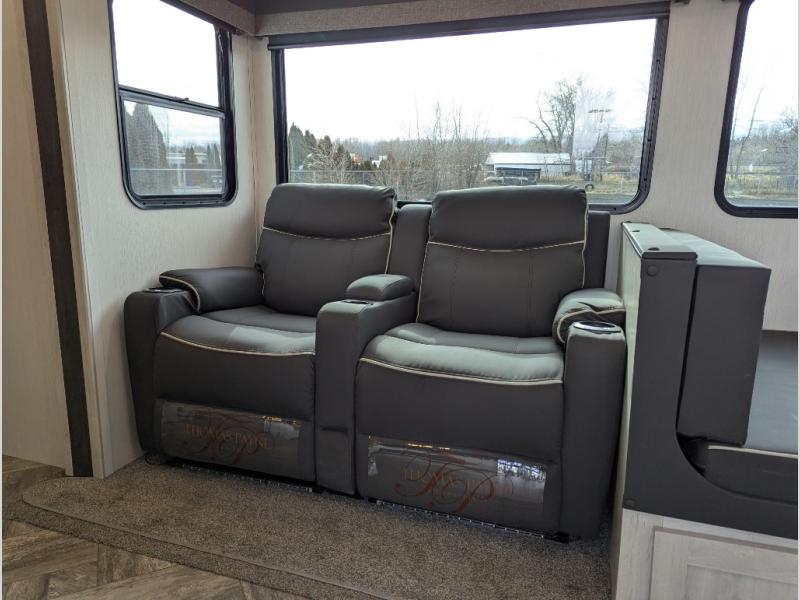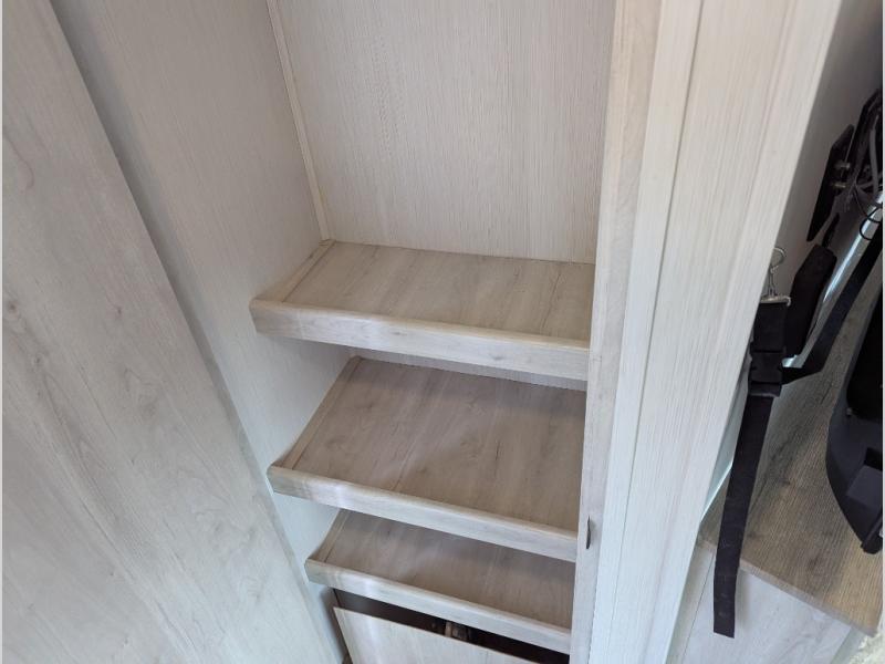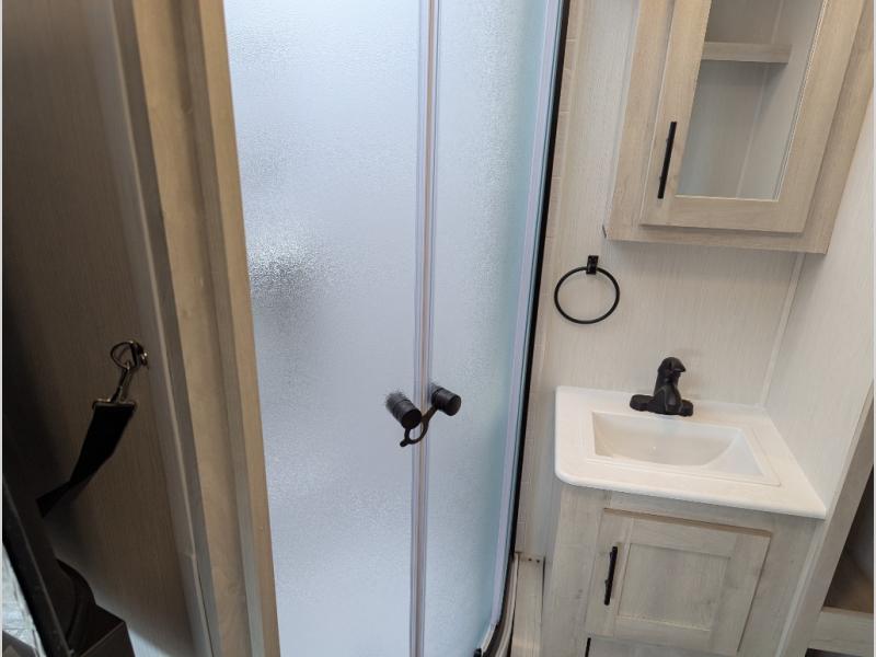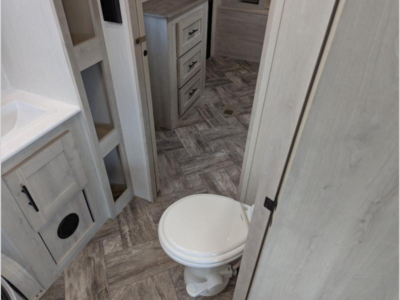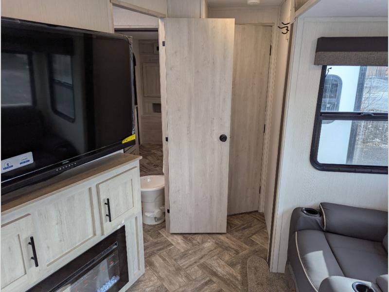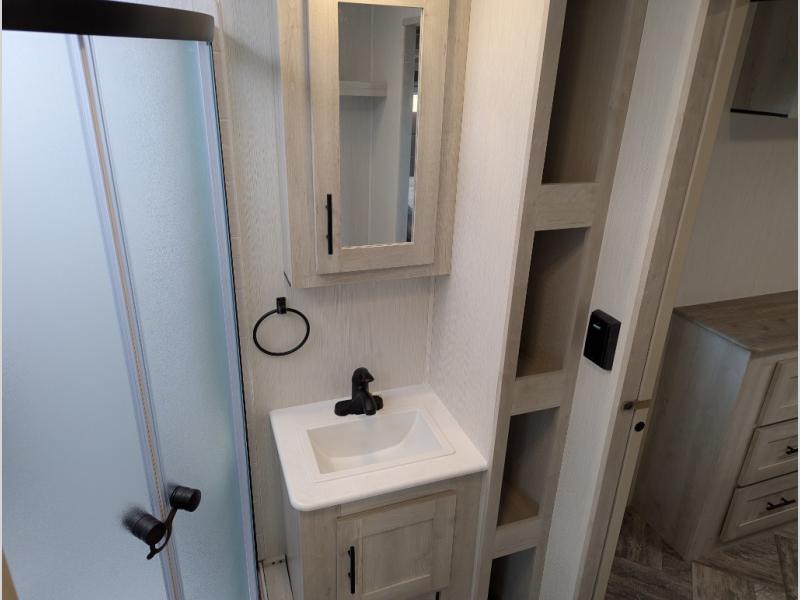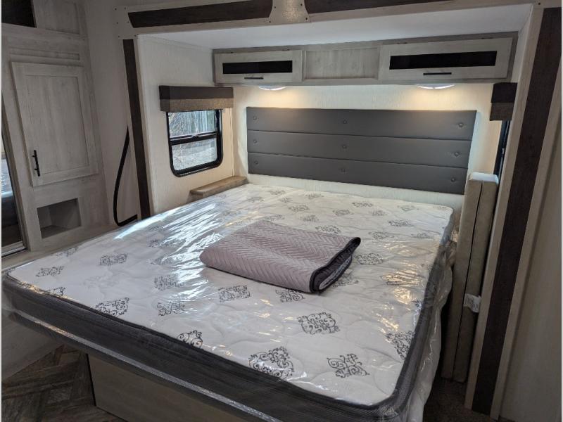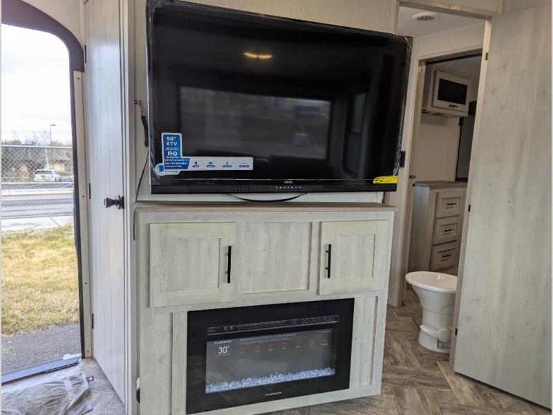 Wherever you decide to camp, you can be sure to have at-home comforts in this double slide out travel trailer. The front kitchen is any chef's dream with its large counter space, 12V refrigerator and large pantry, and the front windshield will provide great views as you cook. Your crew can relax on the tri-fold hide-a-bed sofa sleeper across from the LED HDTV, or play a game at the booth dinette with storage below. The dual entry bath will create a rear master bedroom you are sure to love. There is a Maxx king bed here, drawers for storage, plus a rear wardrobe with closets on either side. You'll even find the second entry door in this room for added convenience!