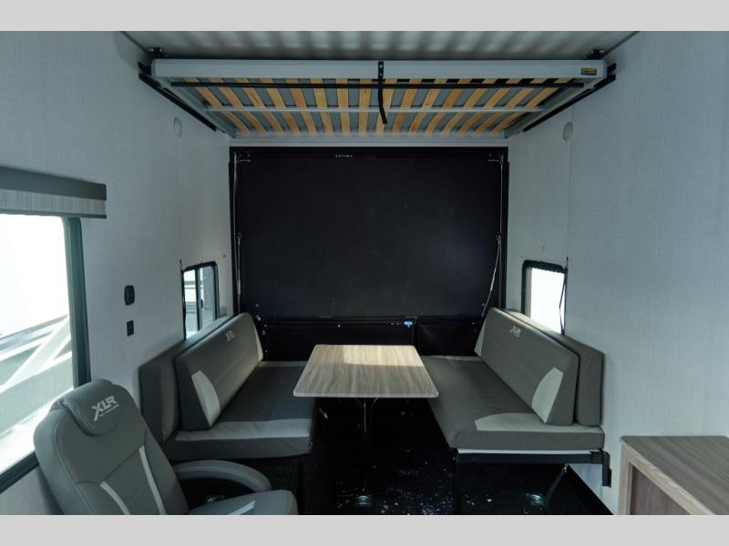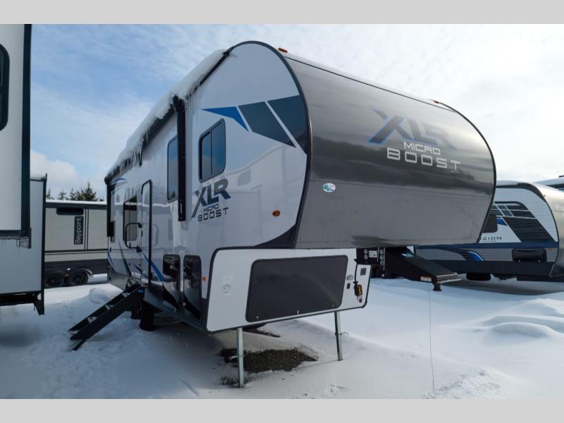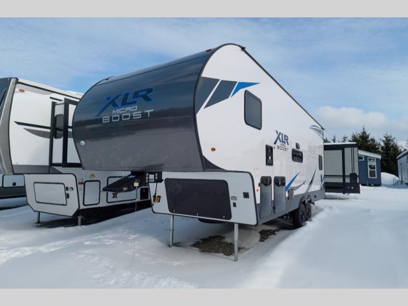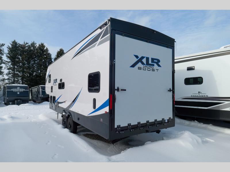 The XLR Micro Boost toy haulers by Forest River are ready to boost your fun outdoors! These travel trailers and fifth wheels are easier to tow and include an Alumifoil insulated enclosed underbelly so you can camp all year long. The industrial garage flooring and 5,000 lb. tie-downs make loading and securing your toys easier than ever, and the VIP patio deck found on each model means you can entertain guests. The interior of these toy haulers will have you feeling right at home with tub/showers with skylight, solid surface countertops, USB charging station, and decorative kitchen backsplash. You'll find many more convenient features found throughout, like the tankless water heater, the magnetic screen wall, plus the Renewable Entergy Package with a 200 watt solar panel for off-grid camping!