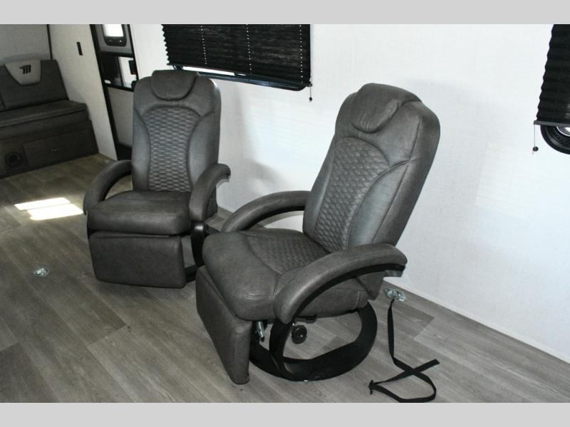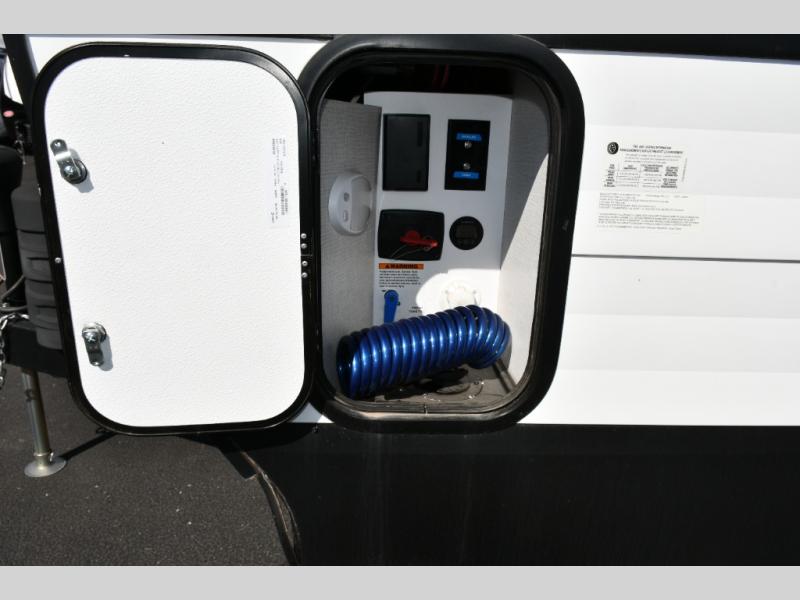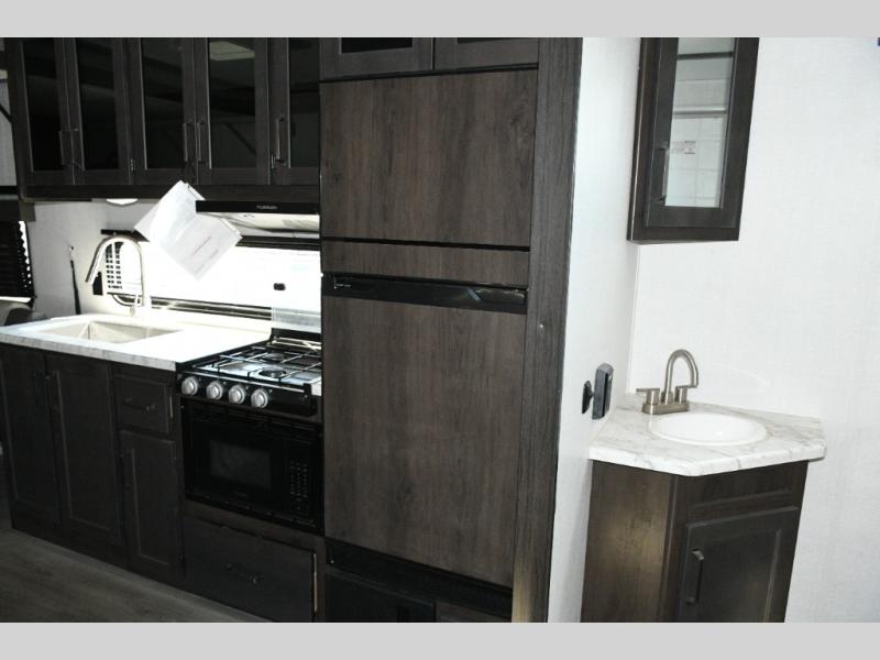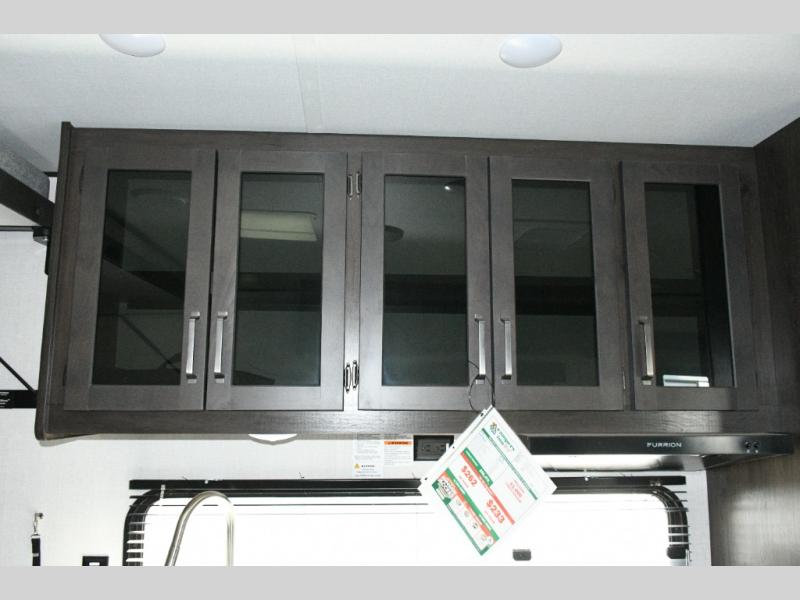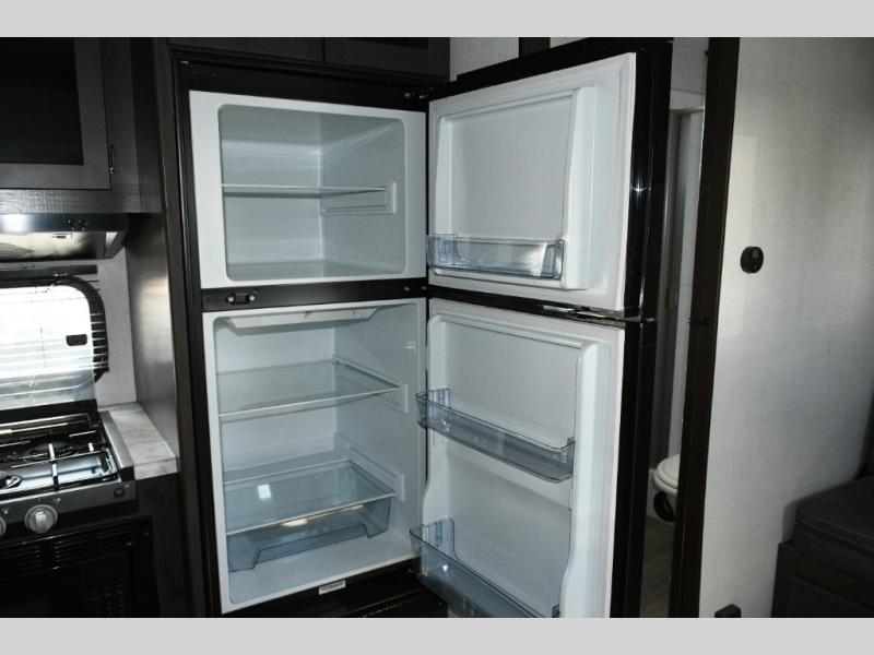 Cooking is easy in the three-burner range with oven and 12V refrigerator, while the dual Euro chairs provide a relaxing spot for meals or lounging. Step outside onto the ramp door/patio, complete with a pull-down screen to enjoy fresh air without the bugs.